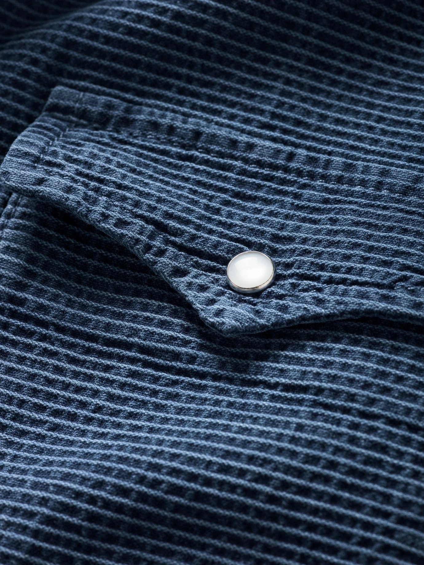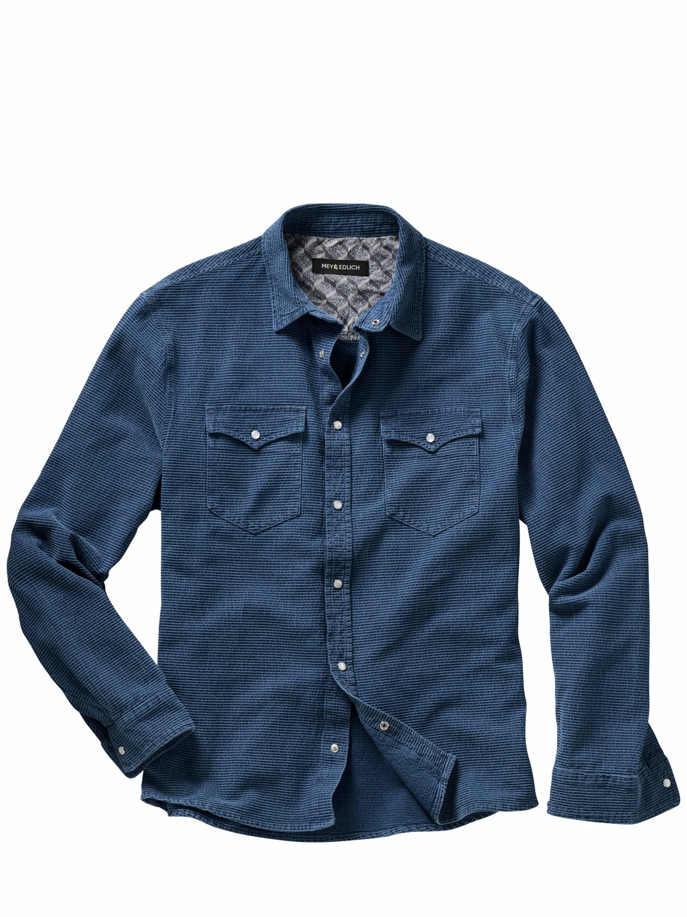 Die eingewebten Streifen machen den fühlbaren Unterschied. Das Jeanshemd ist fühlbar dreidimensional und so nie so aalglatt wie seine hart arbeitenden Vorgänger. Der Baumwollstoff ist für den authentischen Look vorgewaschen. Er gibt, wie eine ordentliche Jeans, mit jeder Wäsche etwas Farbe ab. Für den Cowboy-Kick (es soll ja nicht zu fein werden) sorgen gebogene Pattentaschen, die Schulterpasse, Druckknöpfe und breit abgesteppte Nähte. Entspannt kombinieren wie ein klassisches Jeanshemd.