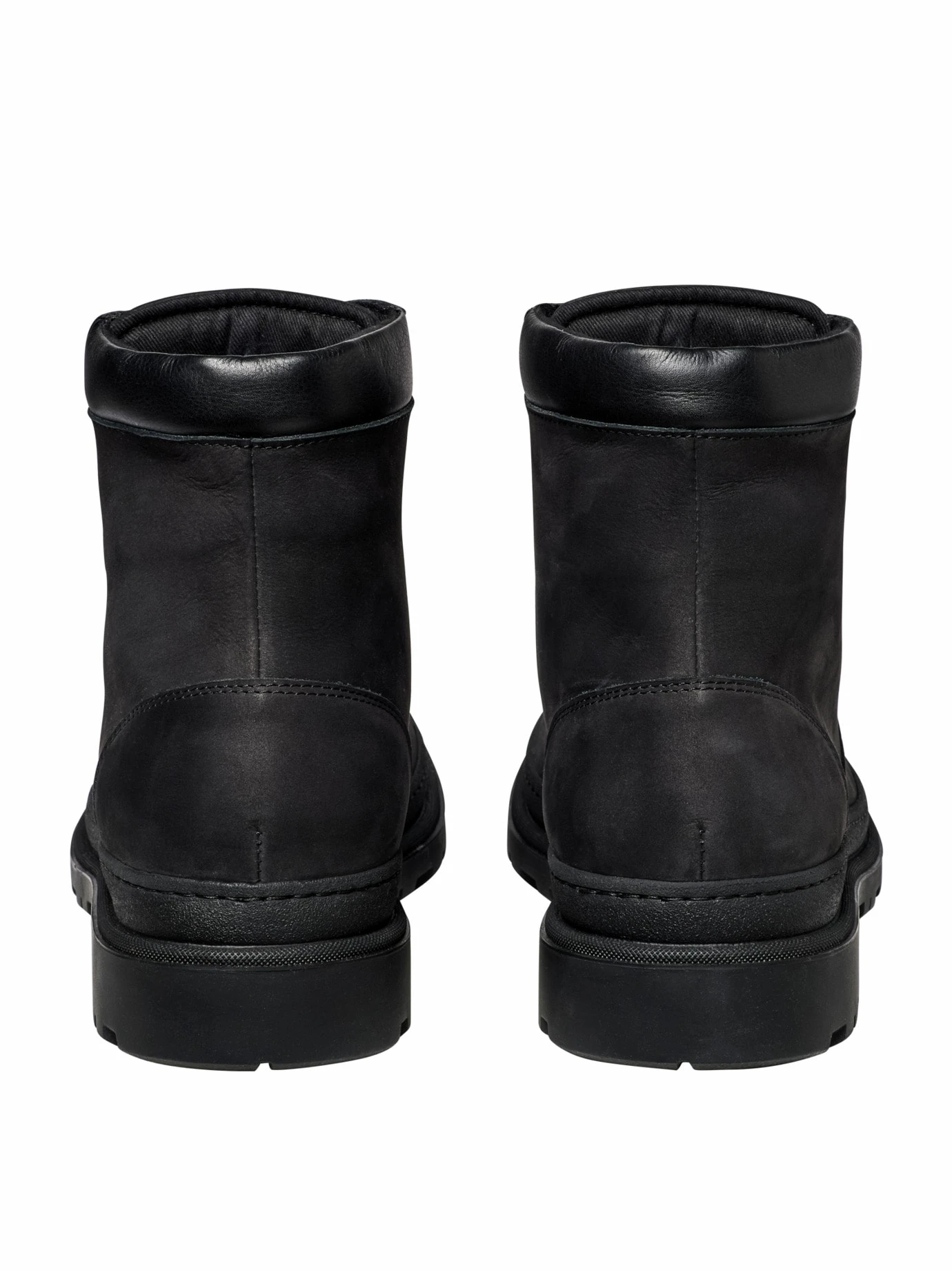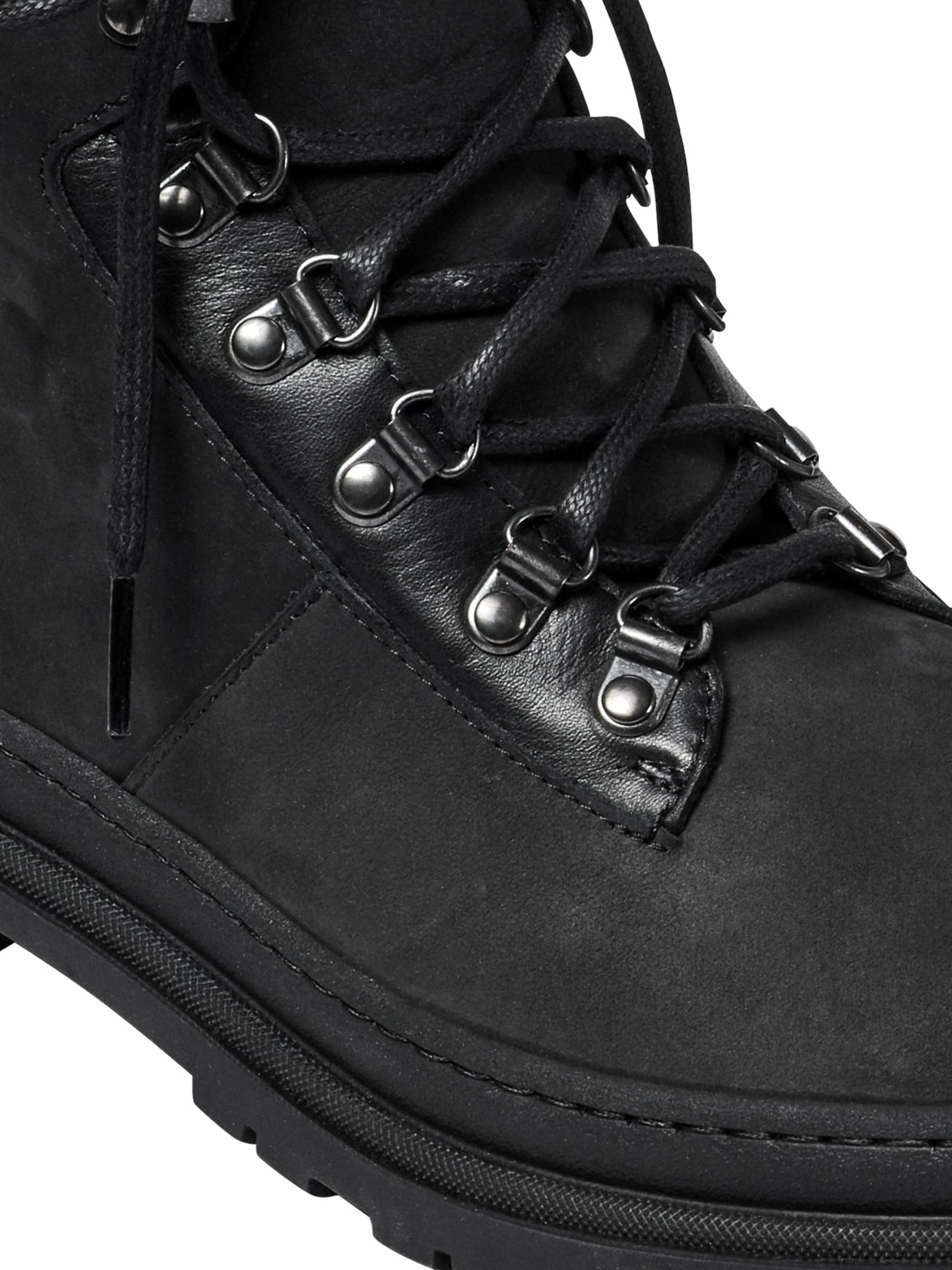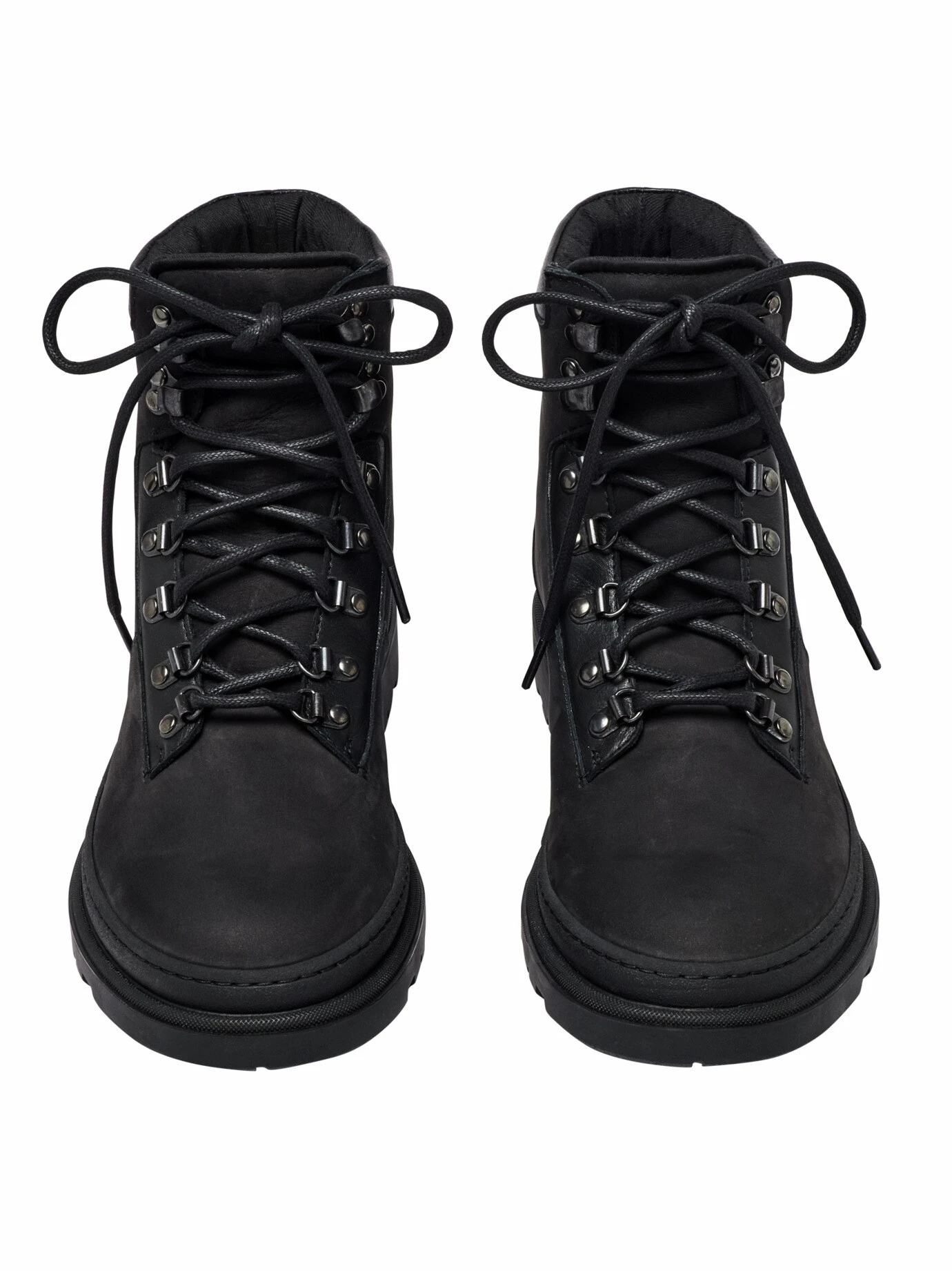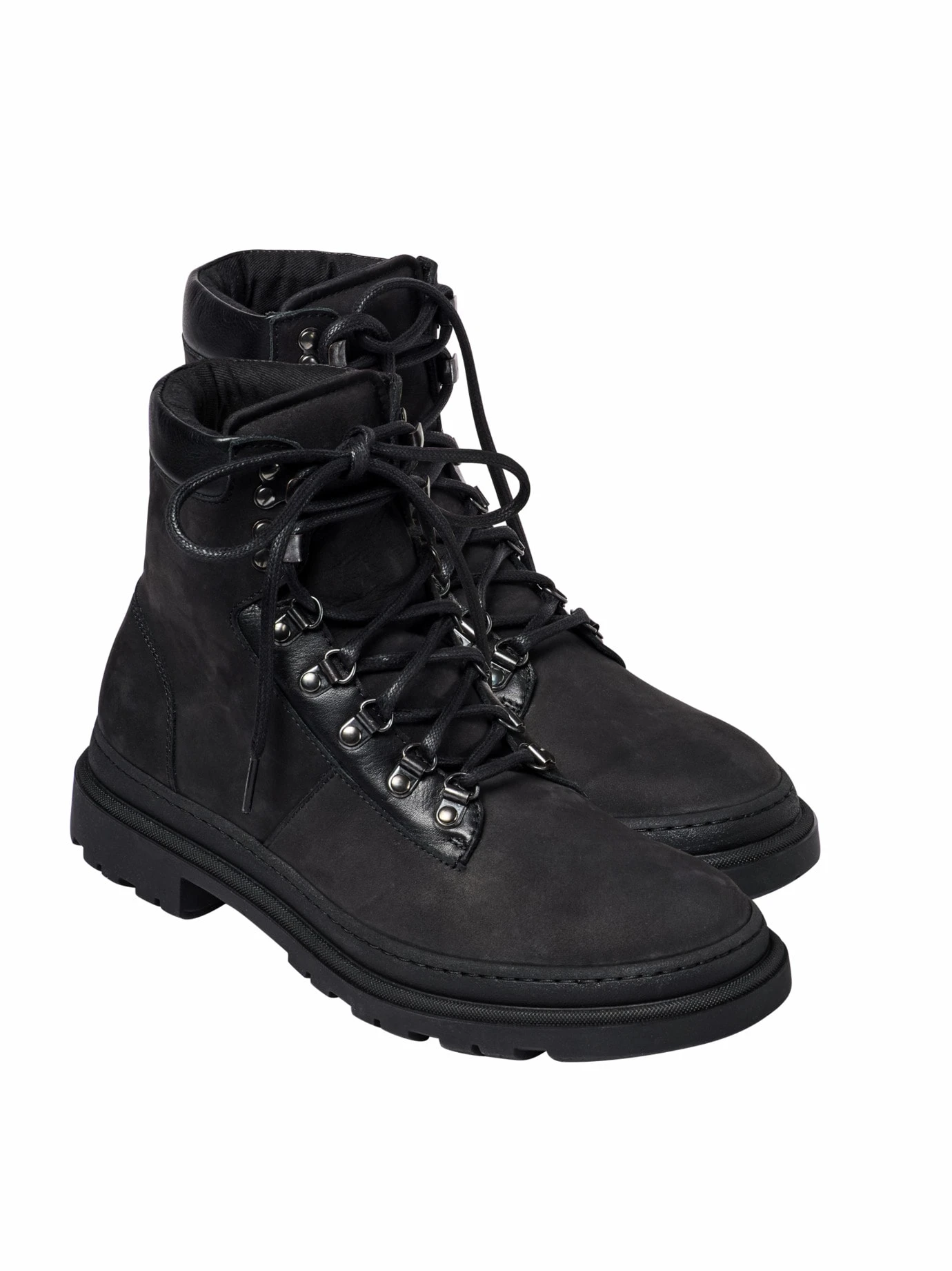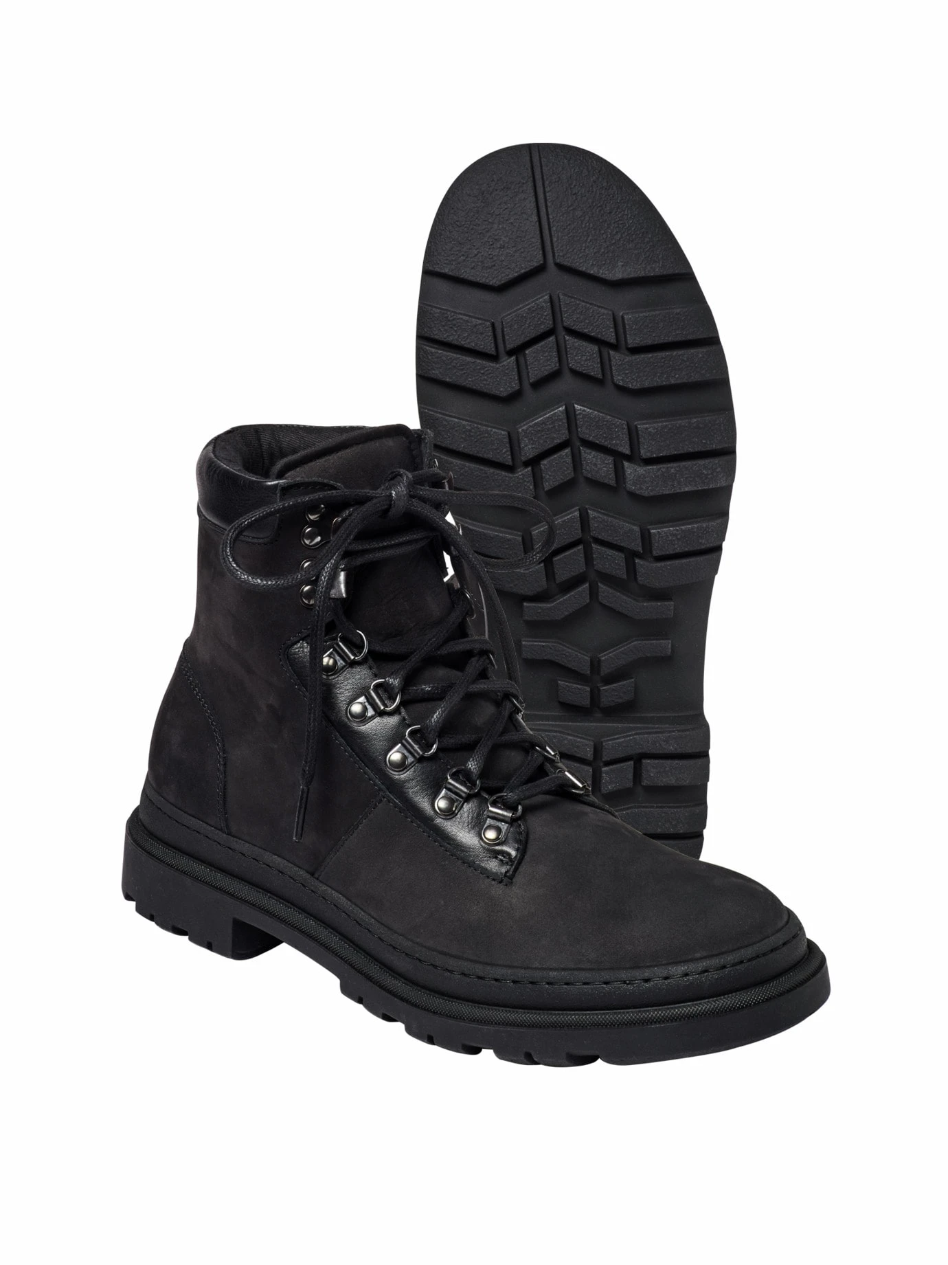 Das Leben ruft. Hat mit seiner Metallösen-Schnürung und der wetterfesten Profilsohle einige Vorzüge des klassischen Wanderstiefels adaptiert: der Kalbleder-Boot mit knöchelhohem, haltgebendem Schaft. Einzig das samtige Kalbveloursleder signalisiert mehr als nur Funktion: Es macht den kernigen Boot stadttauglich und nimmt ihm etwas von der typischen Robustheit, die im Alltag doch zu derbe wäre. Weiteres Plus: Anders als sein traditionelles Vorbild muss er nicht erst eingelaufen werden, sondern ist von Anfang an superbequem.