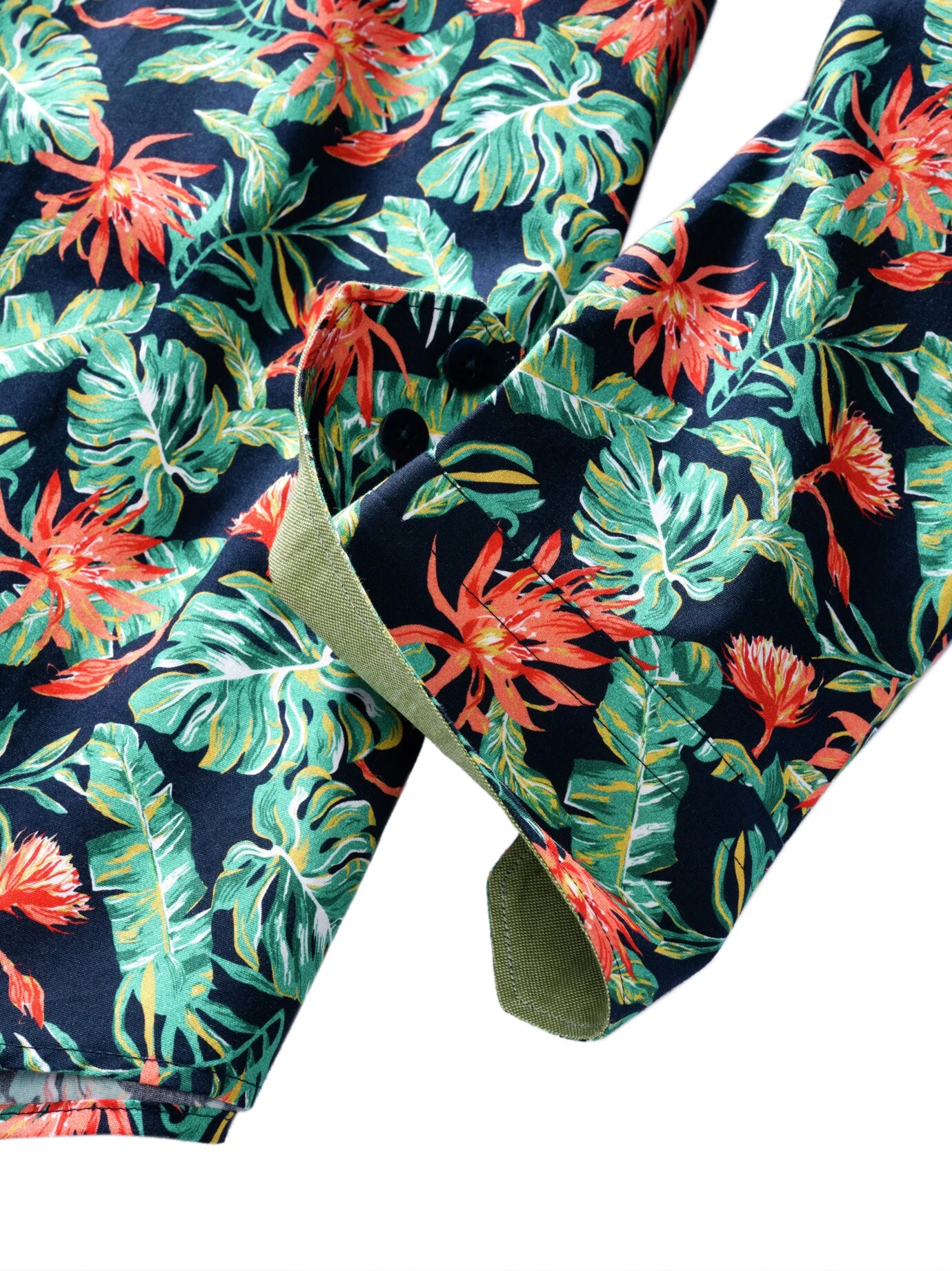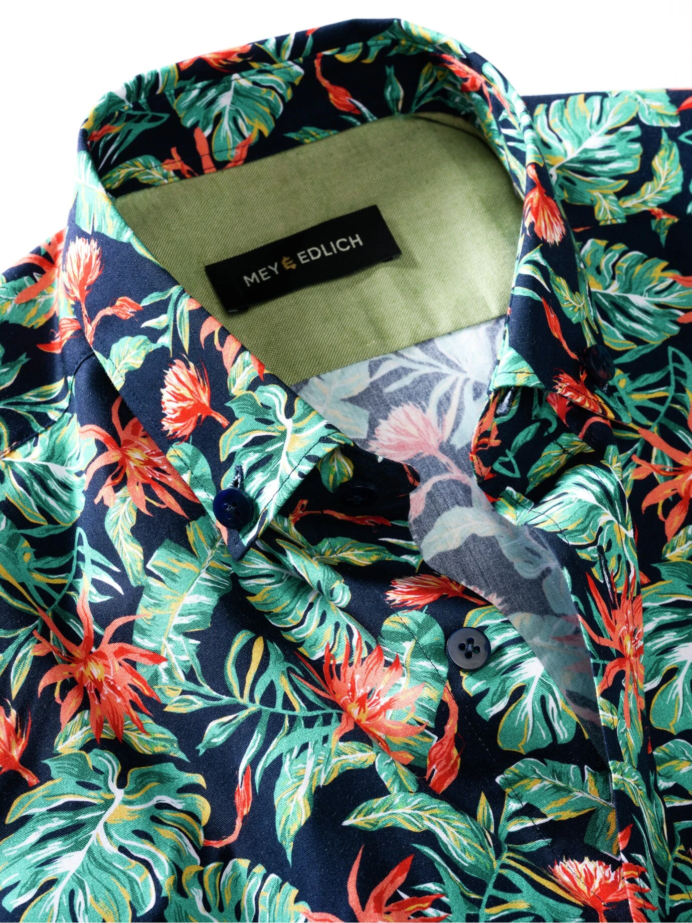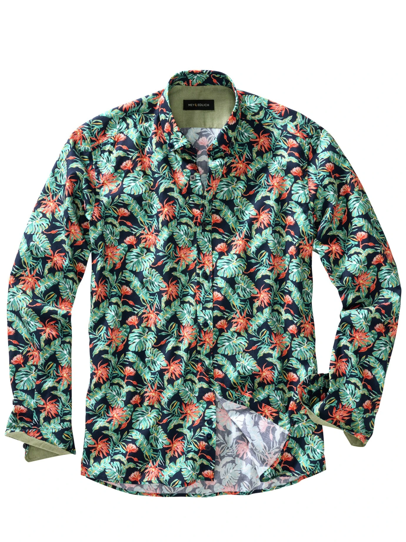 Macht Spaß. Die Vermutung liegt nahe – in diesem Hemd werden Sie die guten Stunden des Jahres erleben. Sein Gefüge aus viel Chlorophyll und exotischen Blüten verschafft gedanklich den Urlaubskick – ideal also im Strandrestaurant zur dunklen Jeans, wenn’s hilft, auch im Kommunikationsworkshop zum Sakko samt Chino. Der Baumwollstoff trägt sich gefällig und ist atmungsaktiv. Zum Abkühlen zusätzlich noch Ärmel krempeln, dann blitzt am Manschetteninneren ein feiner Farbkontrast auf.
