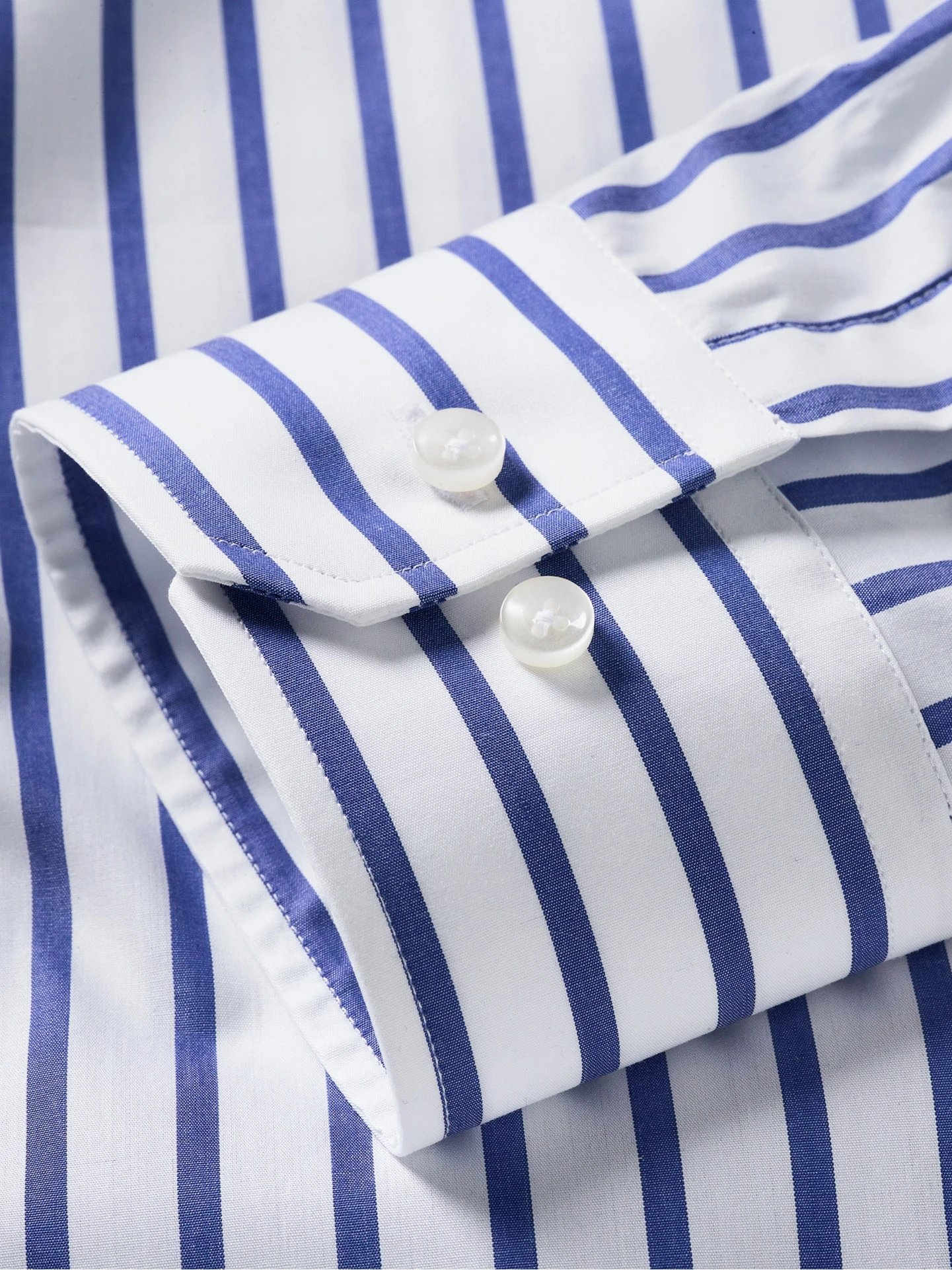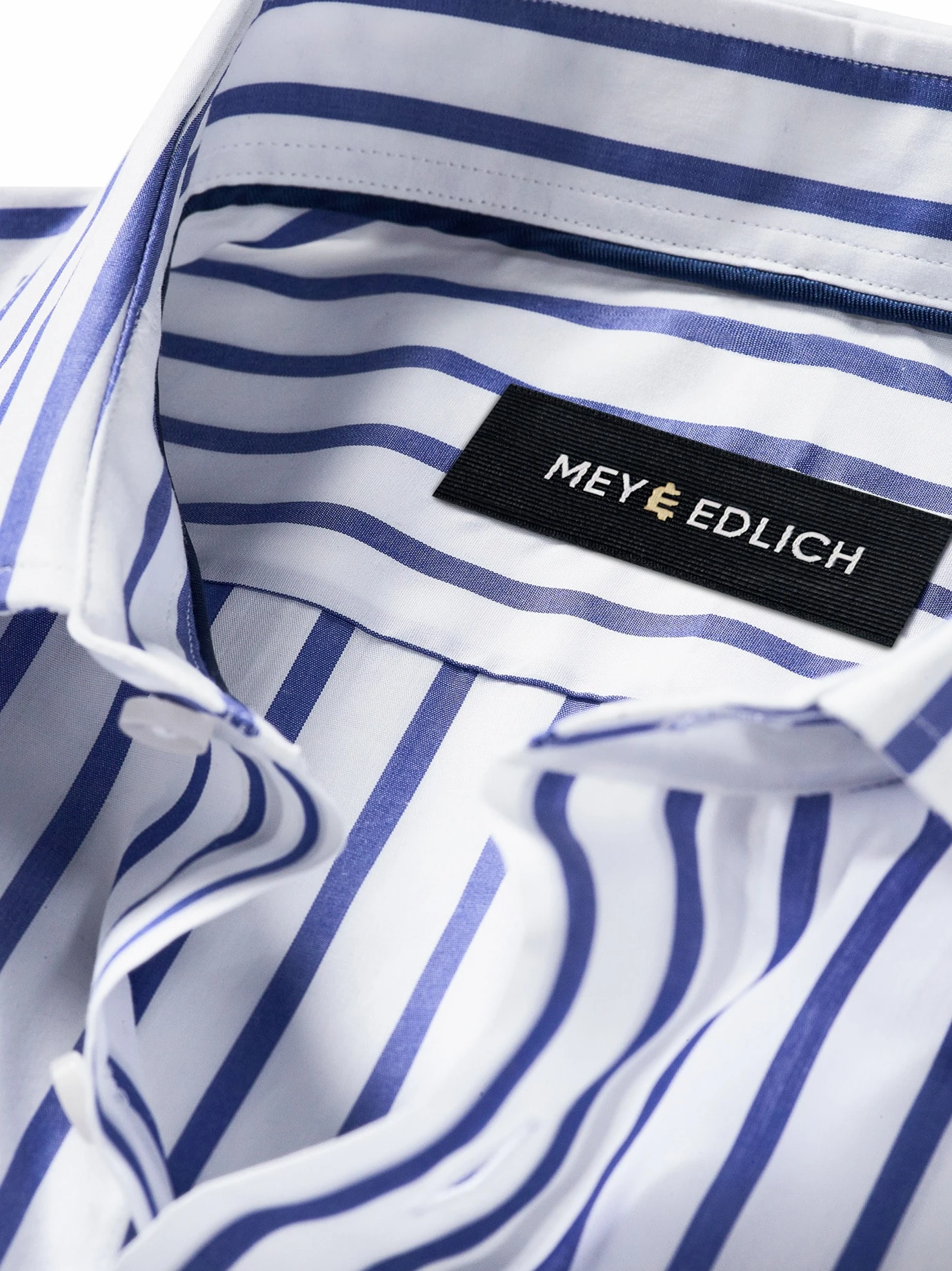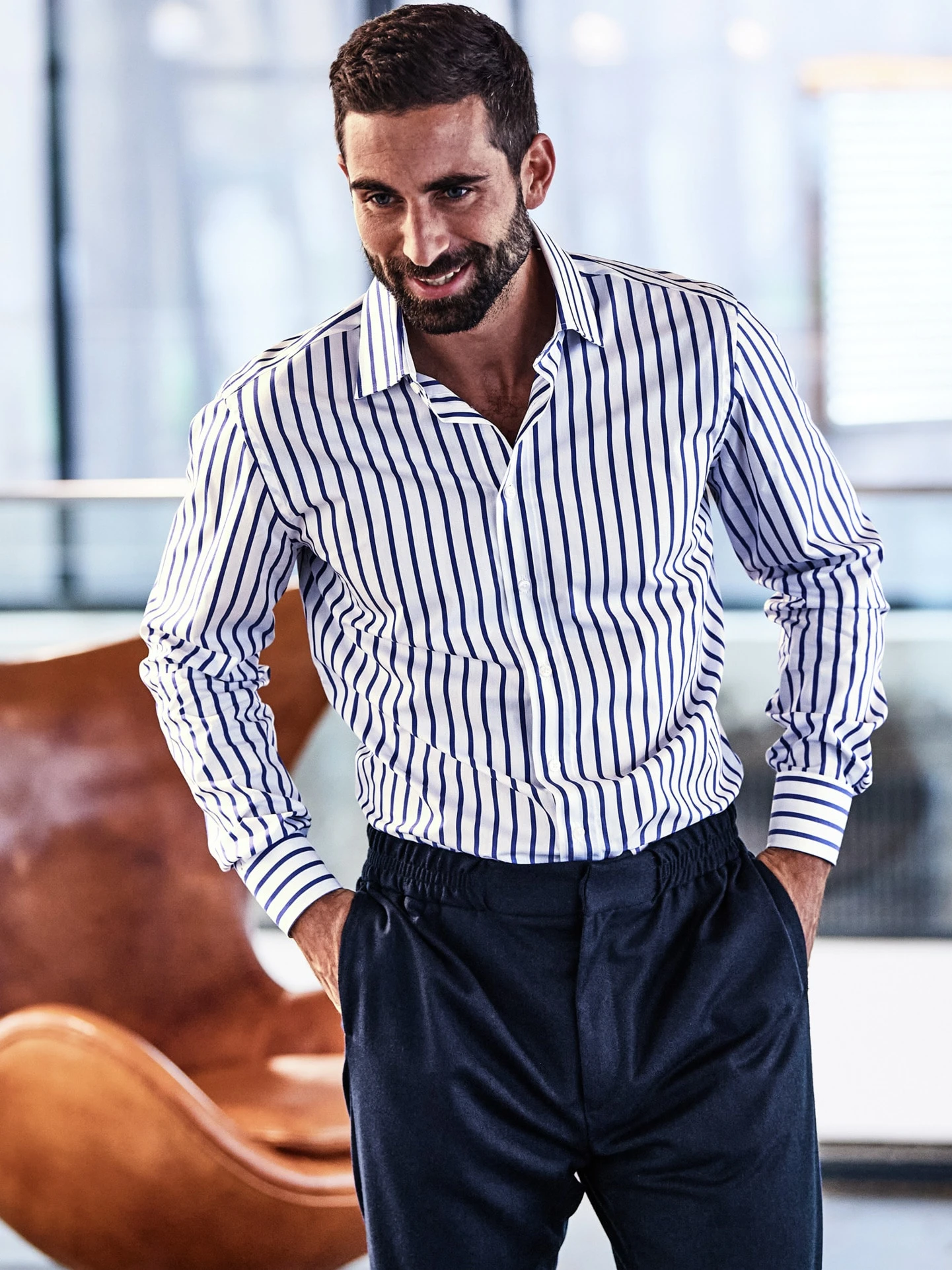 Mehr Aufmerksamkeit fürs Streifenhemd. Ein Streifen ist stets geradlinig und korrekt und überträgt diese Eigenschaften gern auf seinen Träger. Dass dieses Hemd dabei so herrlich unspießig wirkt, liegt an dem großzügigen Abstand der blauen Streifen. Perfekt fürs moderne Business.