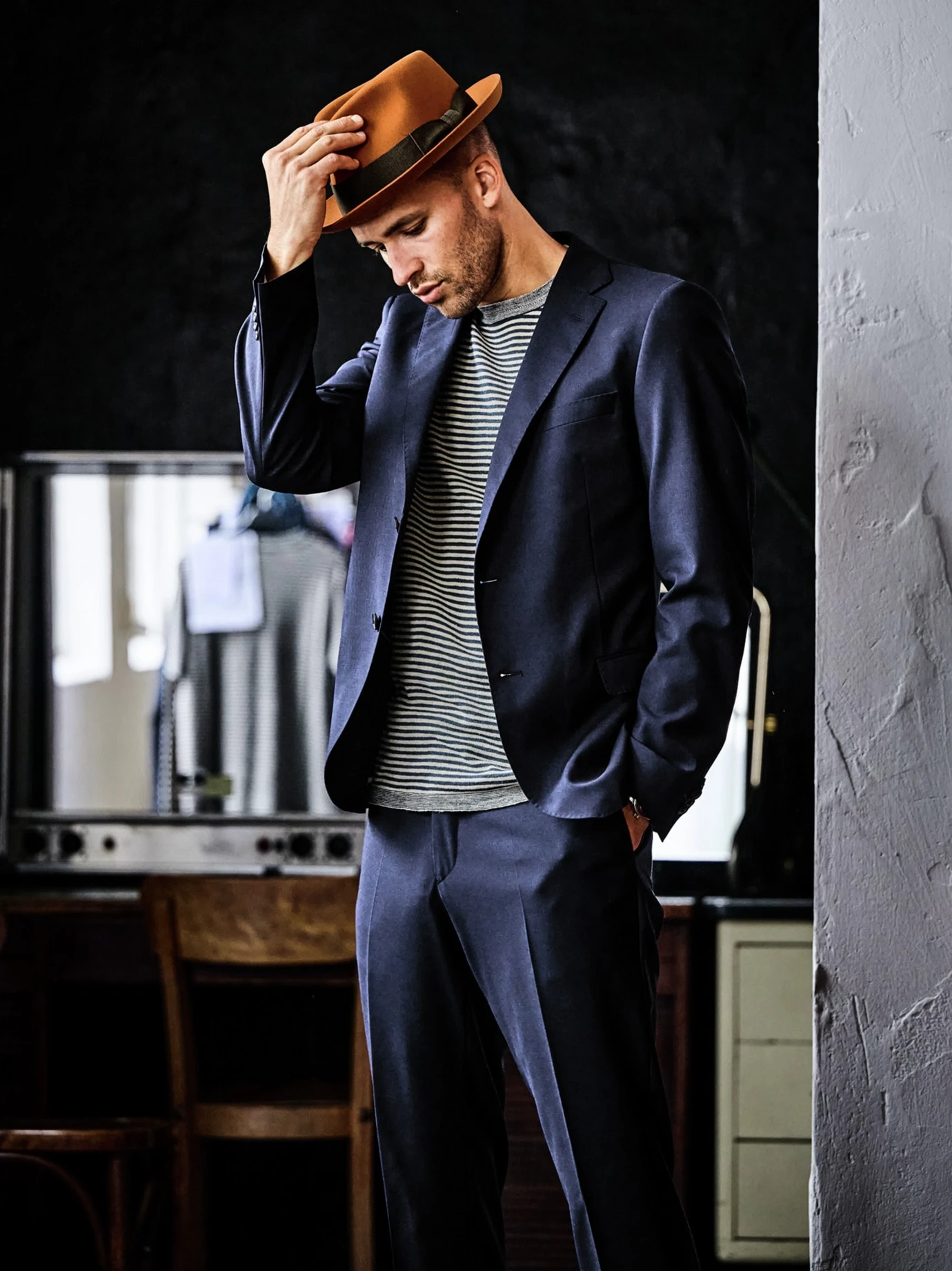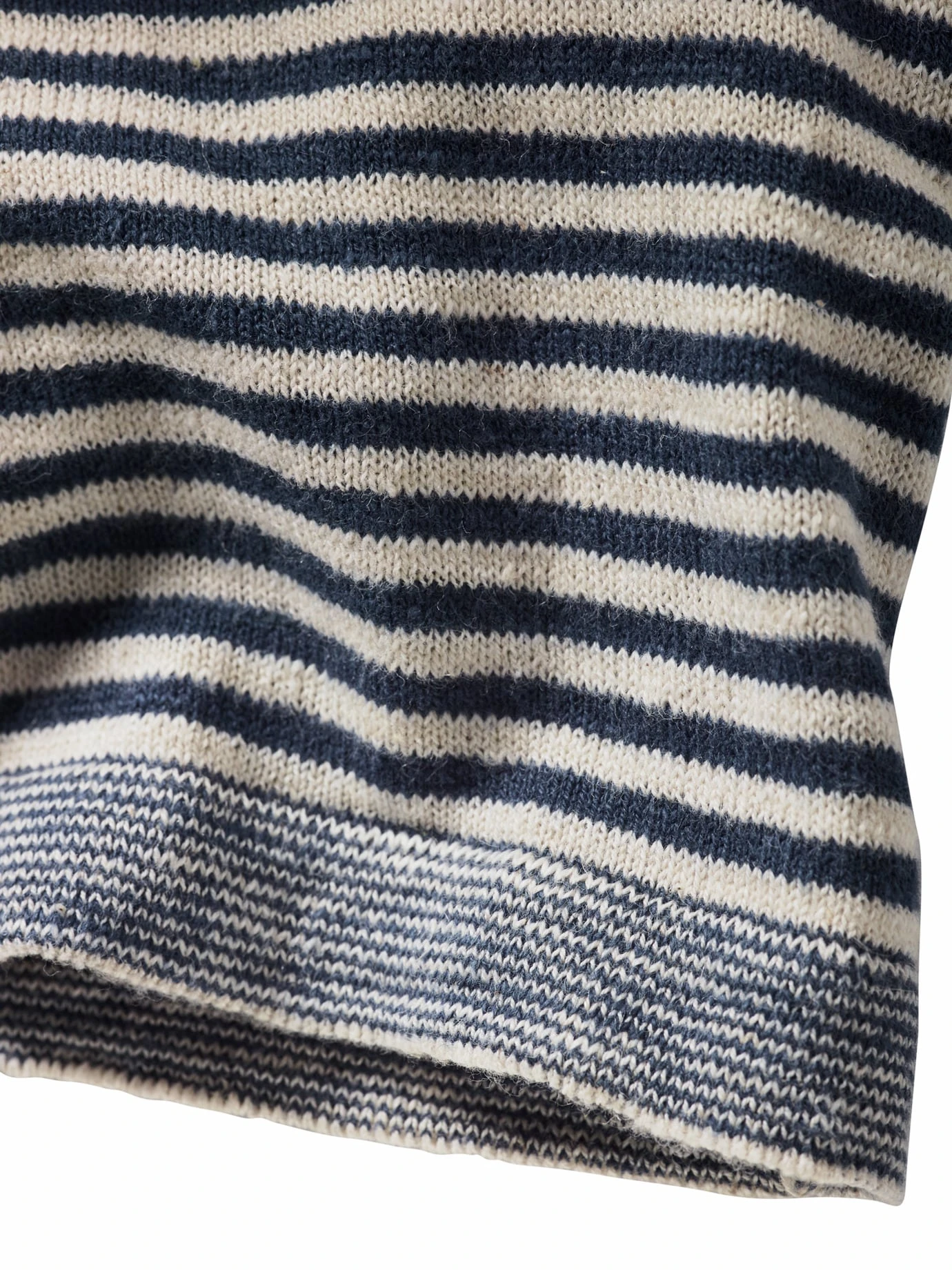 Eigentlich zu schade für drunter. So ist dieses Shirt vom Ursprung her allerdings designt, um es unterm gleichnamigen Cardigan zu tragen (Nr. 23-4565). Der feine Ringel macht sich aber auch gut unterm Sakko oder direkt solo. Grund dafür: der feine Baumwollstrick (in Südeuropa schwören sie auf diese Art von T-Shirts im Sommer) gepaart mit einem Drittel Leinen. Entweder dann stilvoll zur Anzughose kombinieren, das T-Shirt entwickelt sich aber auch gut an heißen Tagen zu luftigen Jeans.