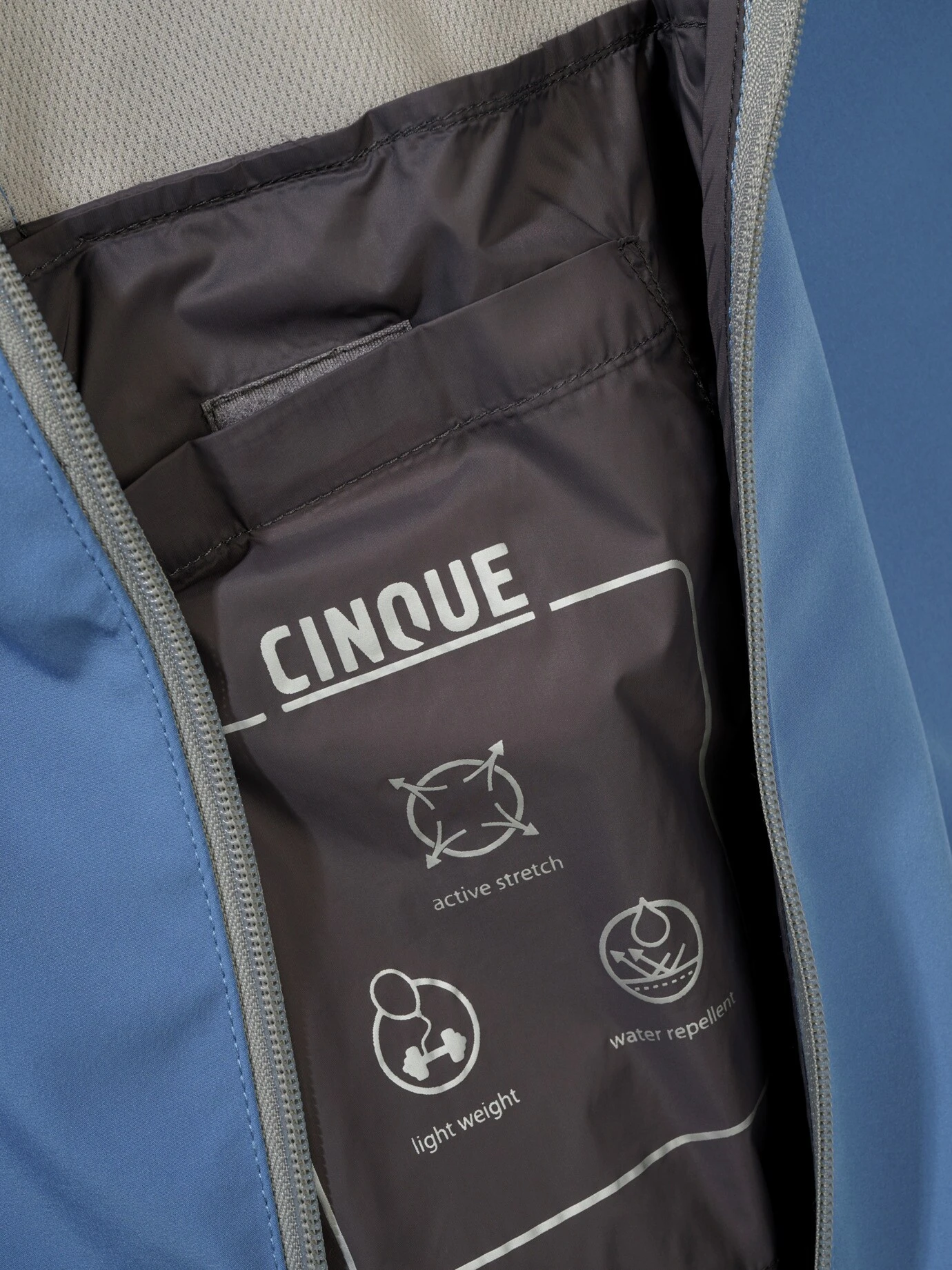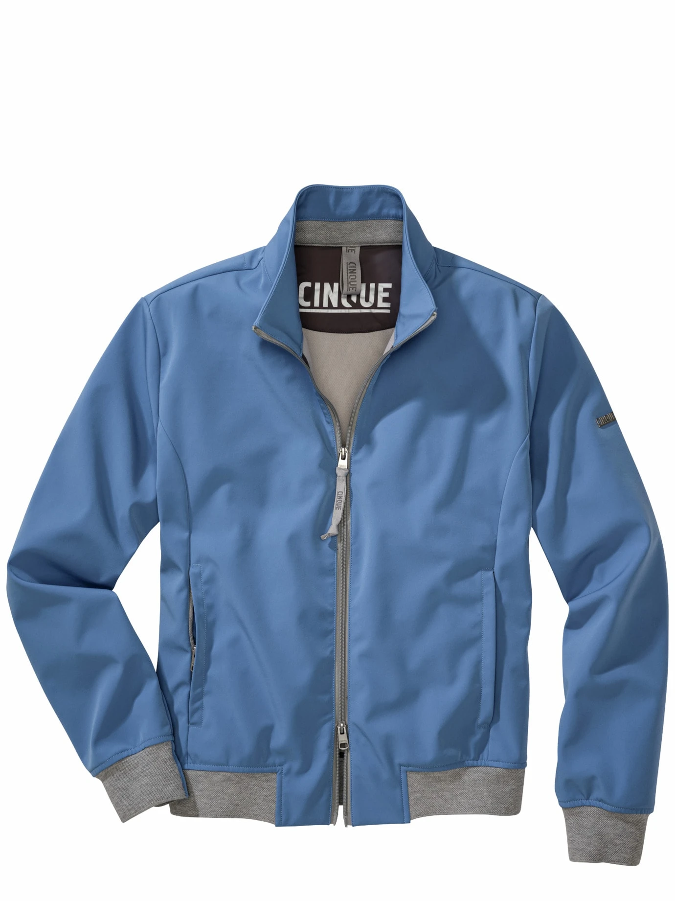 Wirtschaftswunderdynamik plus X. Leicht, sportlich, Stehkragen, Zipper und Strickbünde, so wurde in den Fünfzigern eine Jacke zum Symbol des Aufbruchs. Als Macher trug man genau diesen Blouson. CINQUE legt nach, mit einem cleanen Update, minimalistisch und deutlich körpernäher geschnitten. Getoppt mit moderner Funktion. Das flexible Material ist praktisch ein Windstopper und lässt Sie sogar einen Schauer trocken überstehen. Damals trug man Anzughosen dazu, was immer noch authentisch wirkt. Genauso gut gehen helle Jeans und Chinos. In der Übergangszeit passt ein Pulli drunter, sobald es wärmer wird, ein schönes T-Shirt.