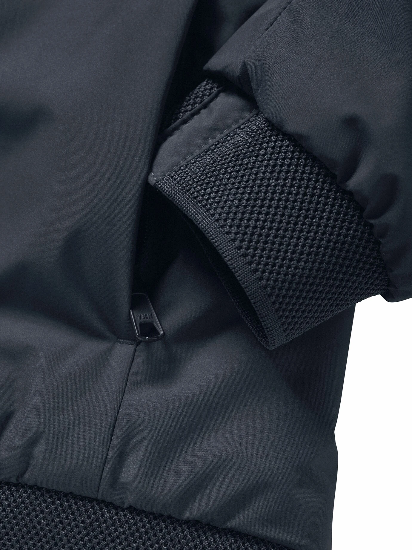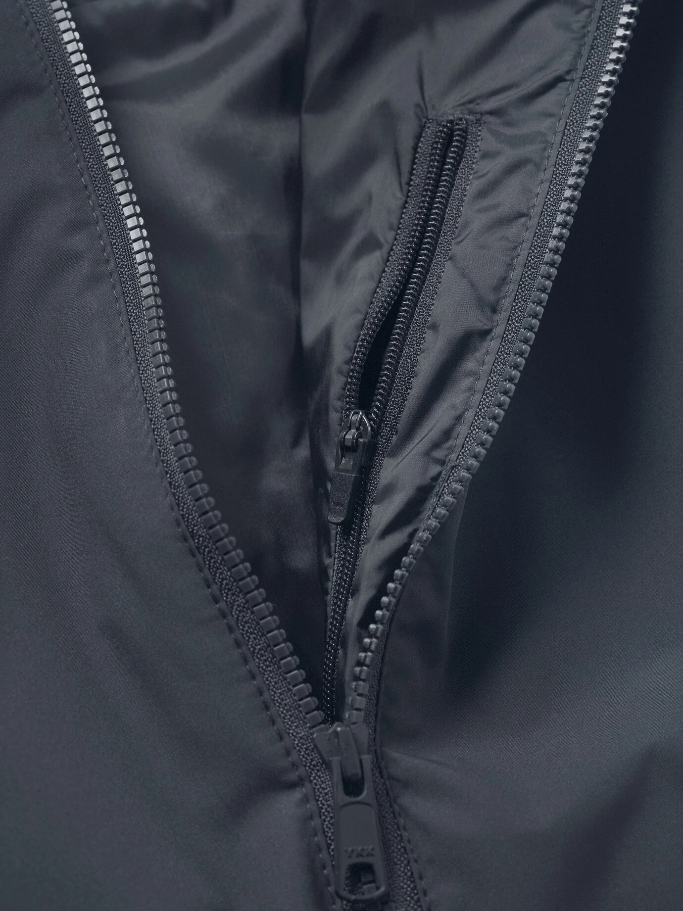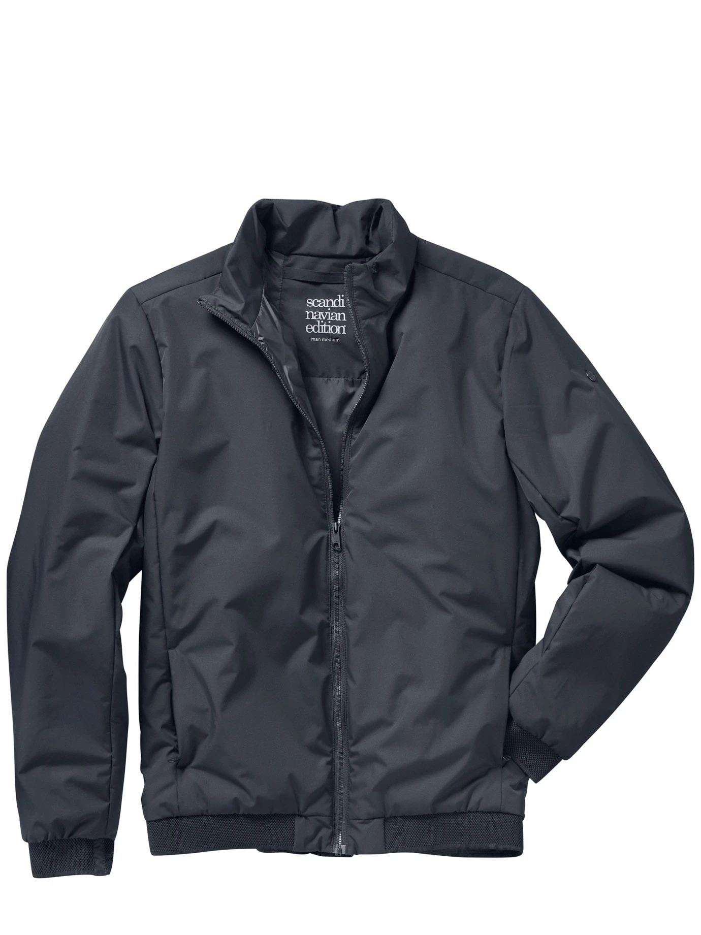 Verarbeitung: Zwei-Wege-Reißverschluss. Zwei Eingriffstaschen außen, kaum sichtbar in die seitlichen Steppnähte eingearbeitet, eine Innentasche, alle mit Zipper. Elastische Rippenbündchen. Slim Fit.