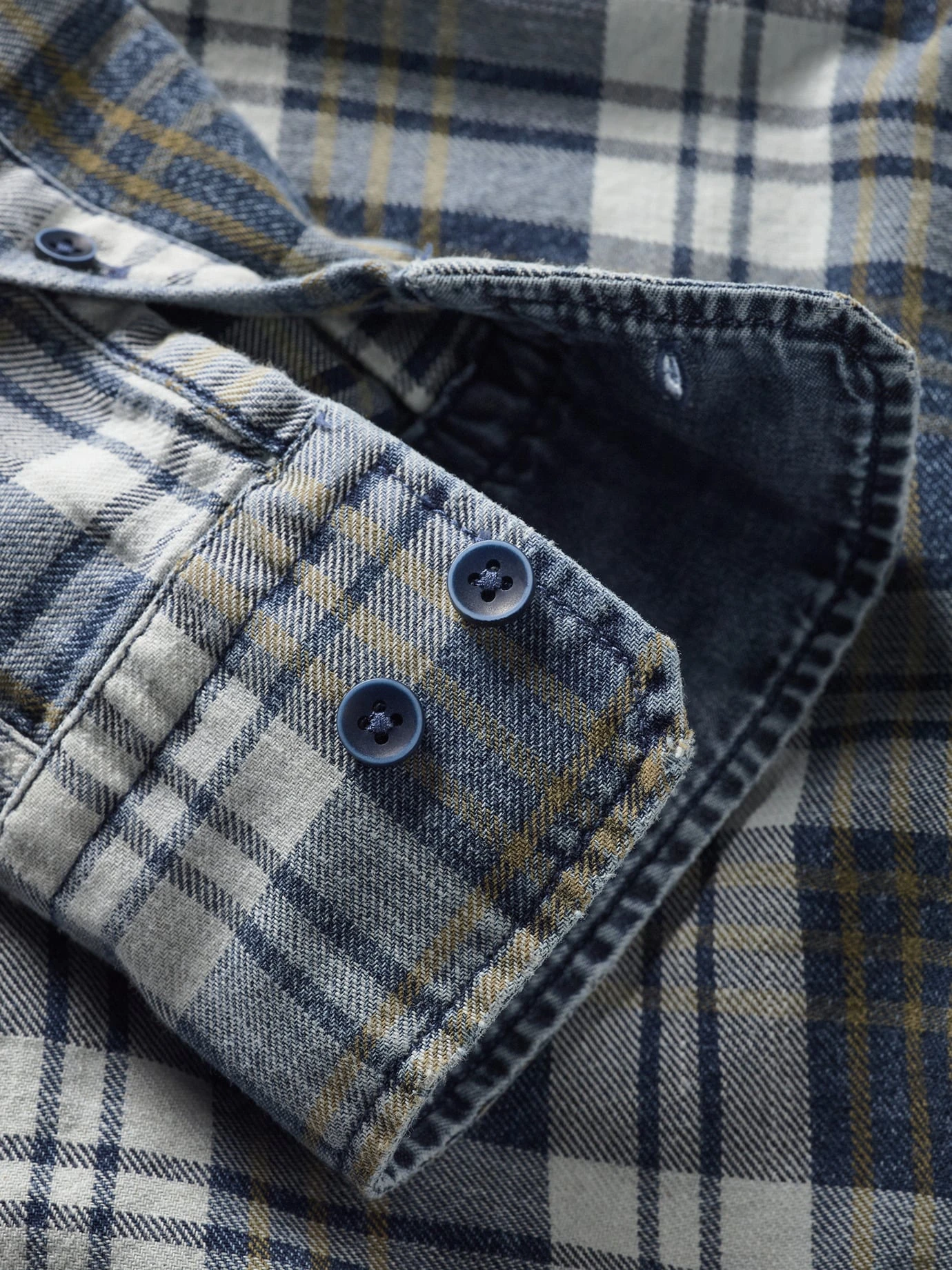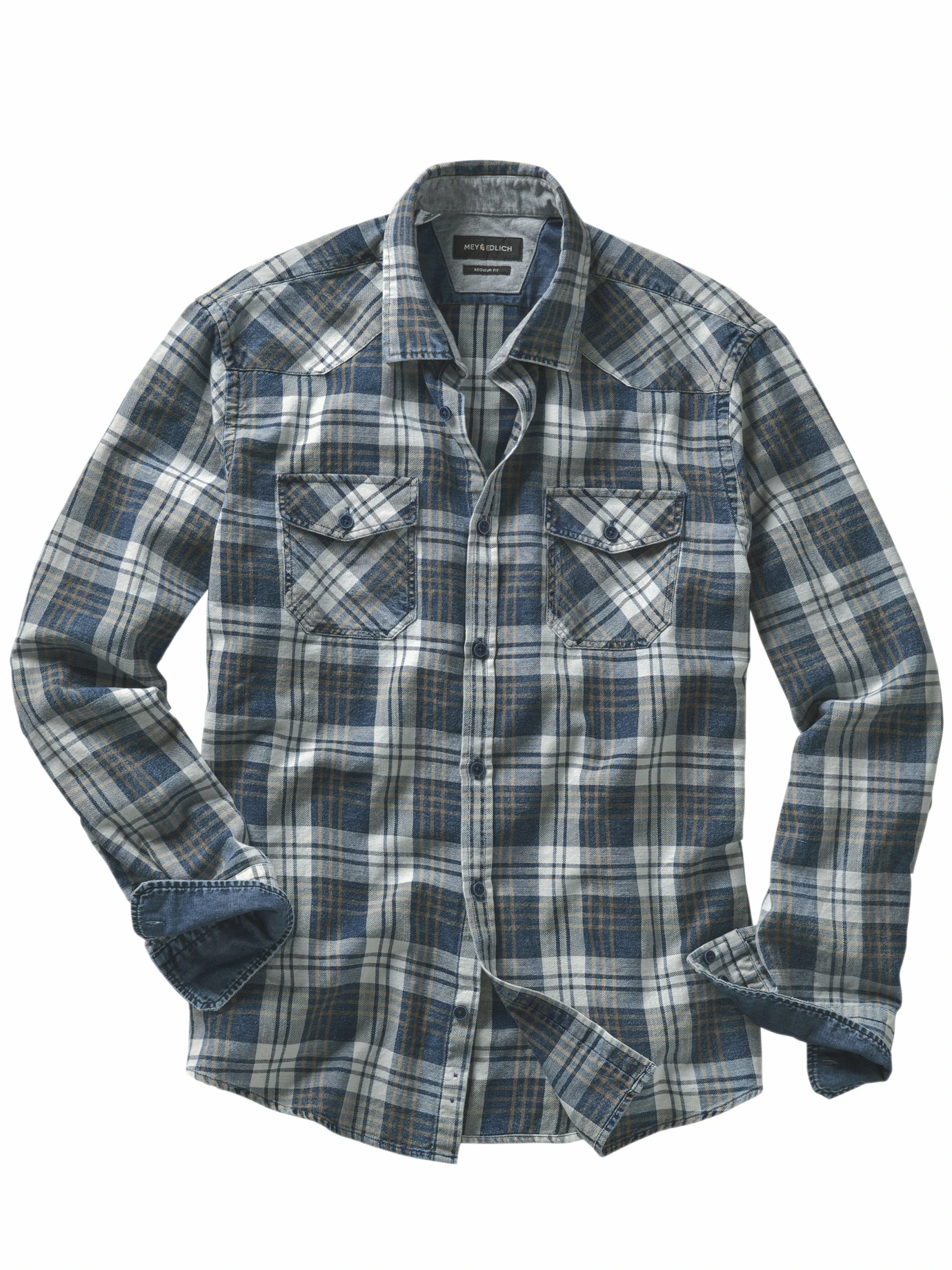 Das Karrierehemd für Holzfäller. Männer, die einen Schlag zulegen, arbeiten mit diesem Karo-Shirt aus Denim. Es ist dem Blaumann ebenbürtig. Nur schöner, weil es verschiedene Jeanswaschungen kreuzt und mit einem feinen gelben Streifen veredelt. So besehen ist diese lebendige Karo-Persönlichkeit viel zu schade, um damit im Forst zu rackern. Selbst wenn er so beeindruckend blau umnebelt ist, wie der Eukalyptuswald rund um die namensgebenden Blue Mountains. Ins urbane Umfeld gelegt passen die Denim-Karos zu den Stichwörtern: Jeans, Boots, Lederjacke. Authentische Waschung.