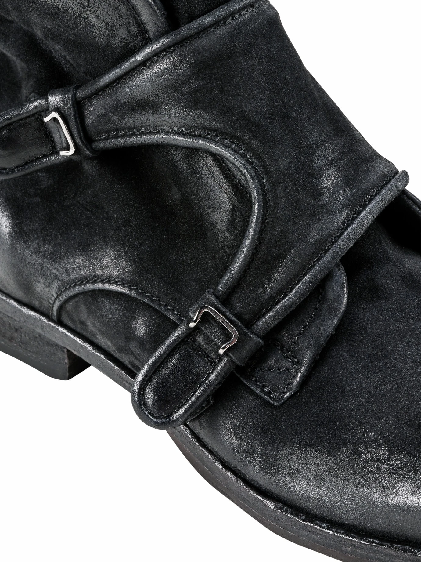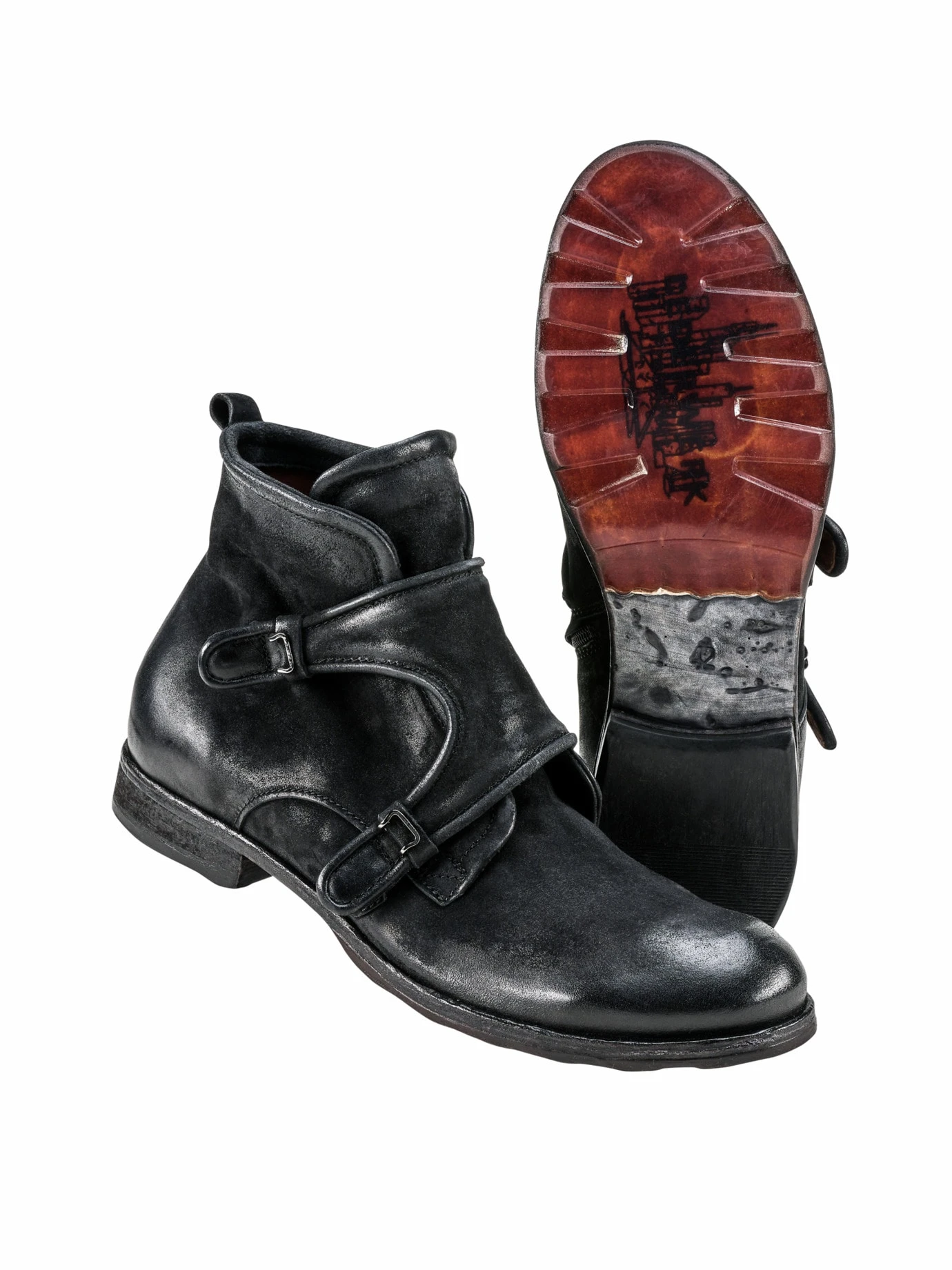 Patina als Stilelement. In Norditalien wird das robuste Rindleder so lange angeschliffen, bis es Charakter trägt. Extravaganz trägt der Boot dann durch die doppelte Verschlussschnalle, die an den Monk erinnert. Ist allerdings nur Tarnung, Sie gelangen bequem per seitlichem Zipper hinein. Außen derb, innen gefällig: Sie werden ihn immer öfter tragen, weil das Kalblederfutter für Ihre Füße eine Wohltat ist und im Gegensatz zu Schweinelederfutter nicht müffelt.