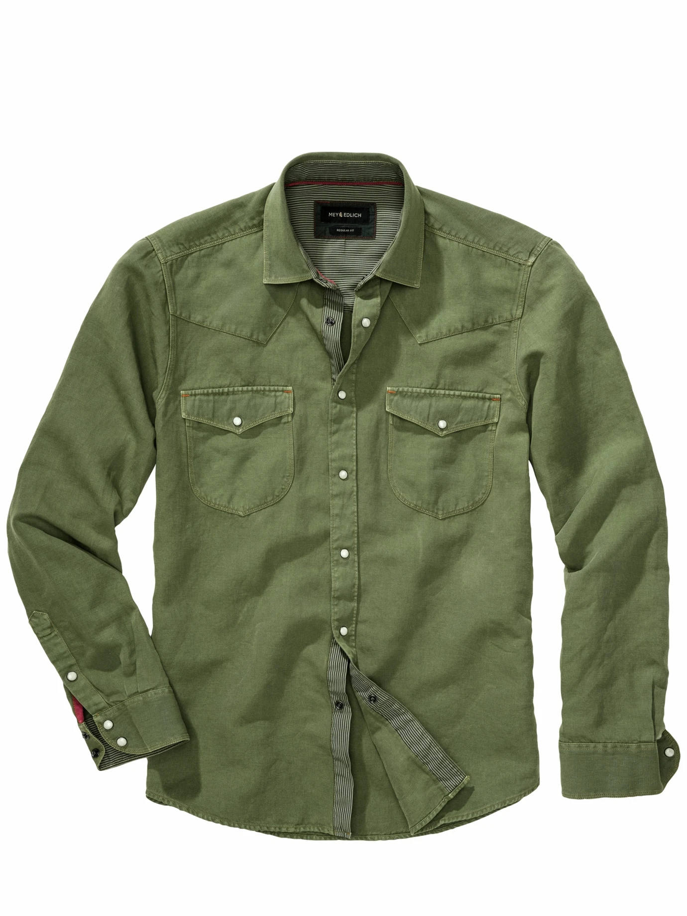 Looking for adventure. In whatever comes our way. Im wilden Westen gibt’s was Neues. Die Jeanshemd-Alternative kommt in Grün und mit einer luftigen Baumwoll-Leinen-Mischung um die Ecke. Ist genauso lässig wie Denim, ab 24 Grad einfach angenehmer auf der Haut. Mit Schulterpasse, hellen Druckknöpfen und Ziernähten zieht es den Cowboyhut vor dem blauen Klassiker. Für den schon-lange-bei-Sonne-im Sattel-Look wurde das Hemd ordentlich vorgewaschen. Geht ins Detail: der Streifenstoff an der unteren Knopfleiste, im Kragen und der Manschette. Maximal casual kombinieren, Jeans sind naheliegend.