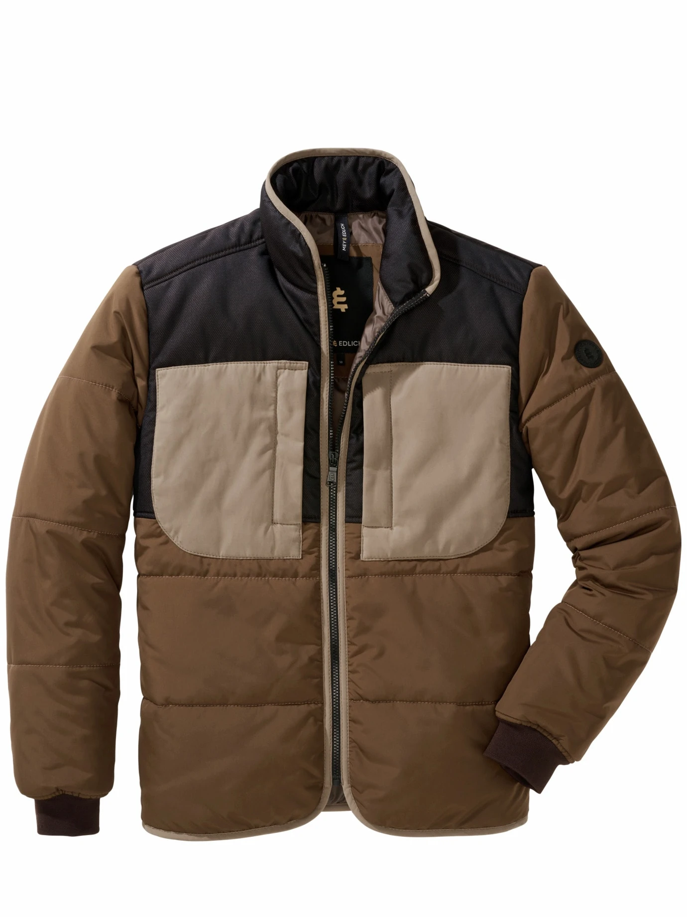 Wir haben sie nicht anders gewollt. Das kommt heraus, wenn ein Konfitisch voller Mode-Aficionados wochenlang über die ideale Jacke debattiert. Das Ergebnis (s.o) ließ die Gemüter abkühlen. Stolz kam auf. Der Konsens: sportlicher Schnitt, leicht, winddicht, breite Steppung, gute Wärmespeicherung. Das Eigene: die umnähte Kante, farblich abgesetzt, um die gesamte Außenlinie, vorn-unten weich abgerundet. Der Clou: unsere Hausfarben Taupe und Shark Grey, letztere in gepunkteter Carbon-Version (als Symbol für die Leichtigkeit), kombiniert mit kernigem Oliv. Geht doch!