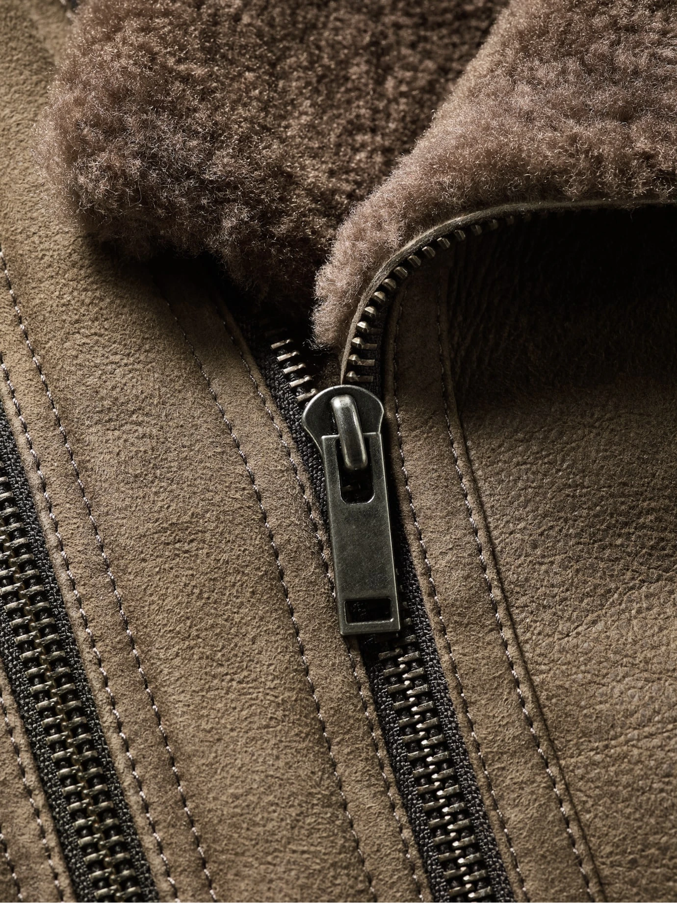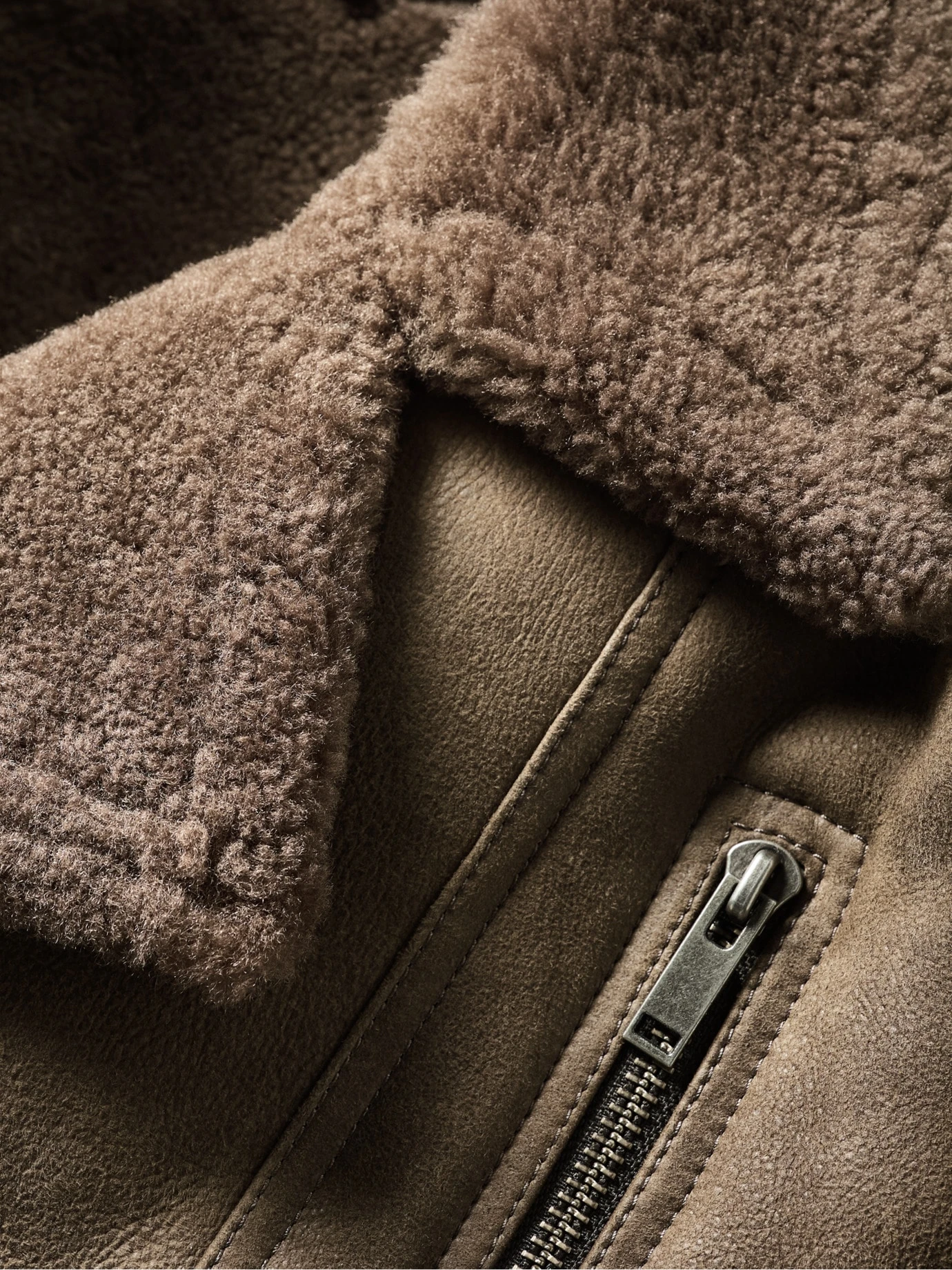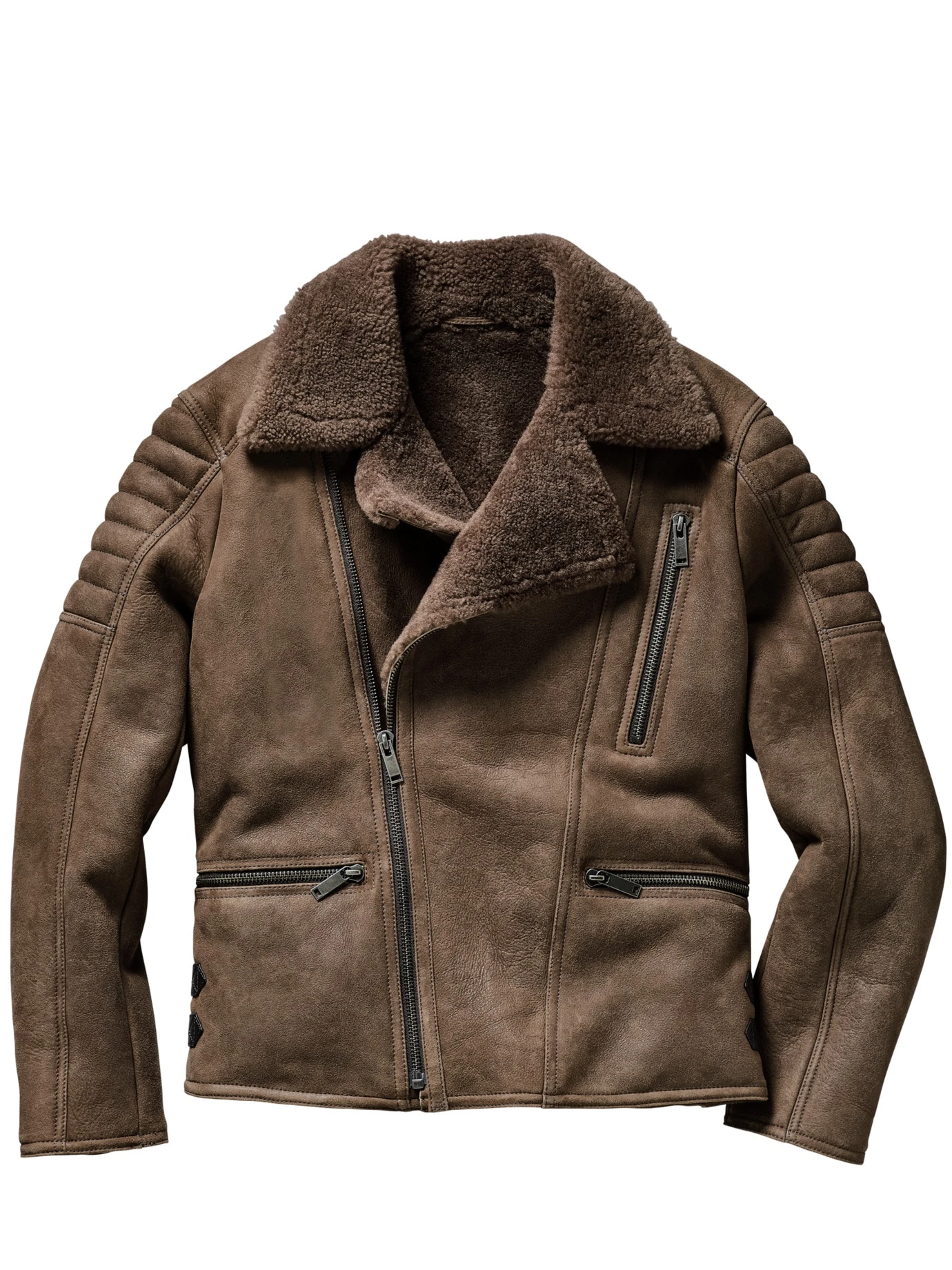 Take a ride. In den 1960ern trafen sich Biker in Vorort-Cafés, Freiheitssymbol wie kennzeichnendes Szeneelement waren die liebevoll frisierten Maschinen. Als Hommage an diese Zeit versteht sich diese Bikerjacke, für die nur besonders dicht gewachsene irische Lammfelle verarbeitet werden. Diese können – allein ihrer Qualität wegen – relativ kurz geschoren werden, wirken damit nicht so bollerig und halten selbst gegen Fahrtwind warm. Typisch Cafe Racer mit Ton-in-Ton-Kragen, ordentlichen Schulterabsteppungen, seitlichen Lederschnallen, damit nichts aufklafft, kernigen Reißverschlüssen und großzügigen Taschen, aus denen nichts fällt. Der Reißverschluss auf Brusthöhe ist ein stilistisches Detail, keine Tasche – die wäre dahinter zu viel. Safety first: mit Helm, selbst ohne Bike auf jeden Fall mit Jeans und Boots. Edel mit Rollkragenpullover.