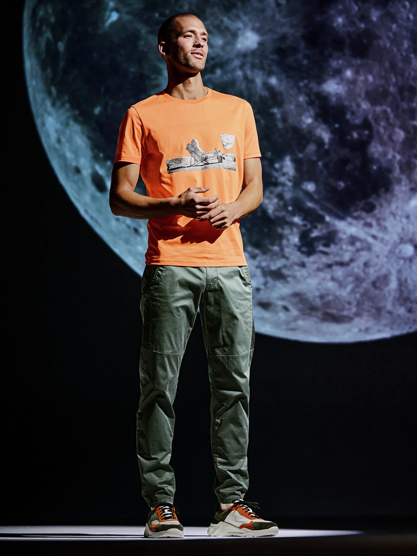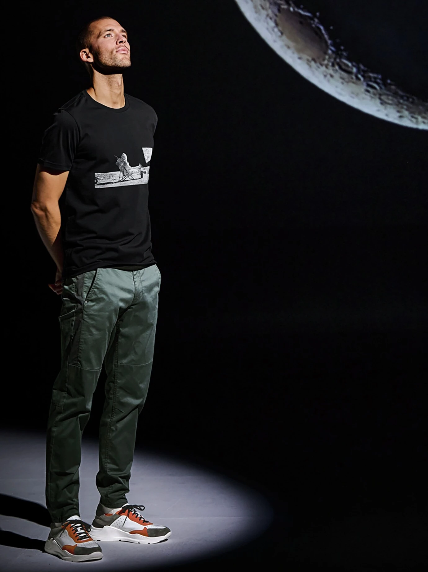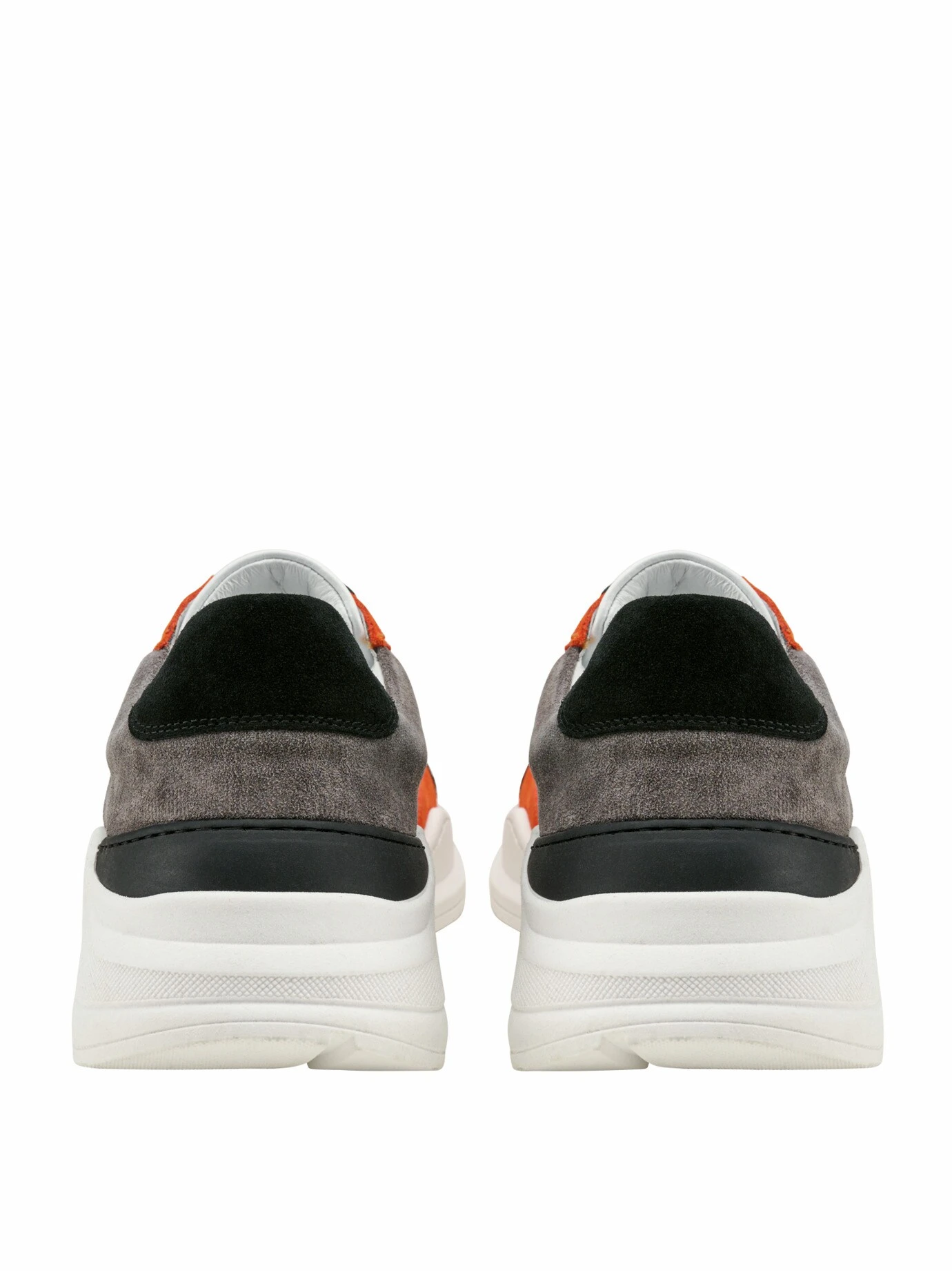 Spielt in der Zukunft. Ein Sneaker, wie eine gelungene Utopie. Dem reinweißen Sneakertrend setzt er farbliche Akzente entgegen. Das italienische Rindleder ist im Zehenbereich gelocht, sodass frische Luft an den Fuß strömt. Ansonsten sehr bequem, selbstredend auch innen mit Rindleder gefüttert. Zum Stile passend: weiße Tennissocken und helle Jeans.