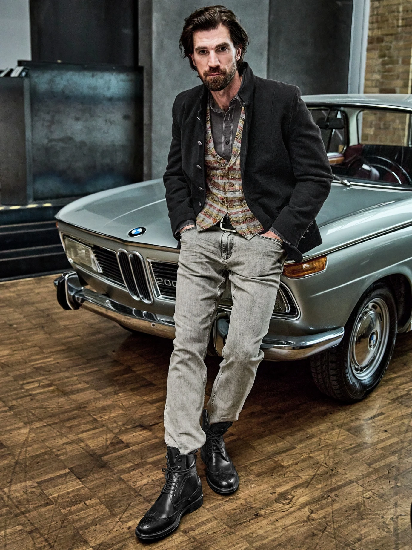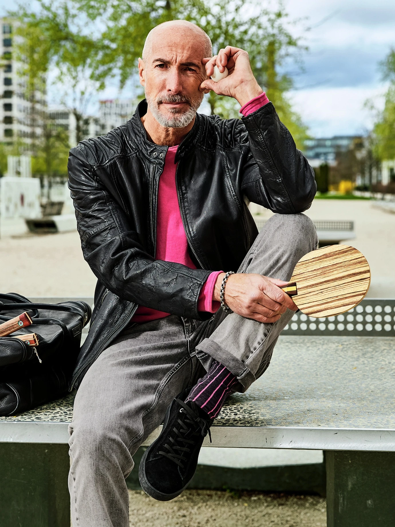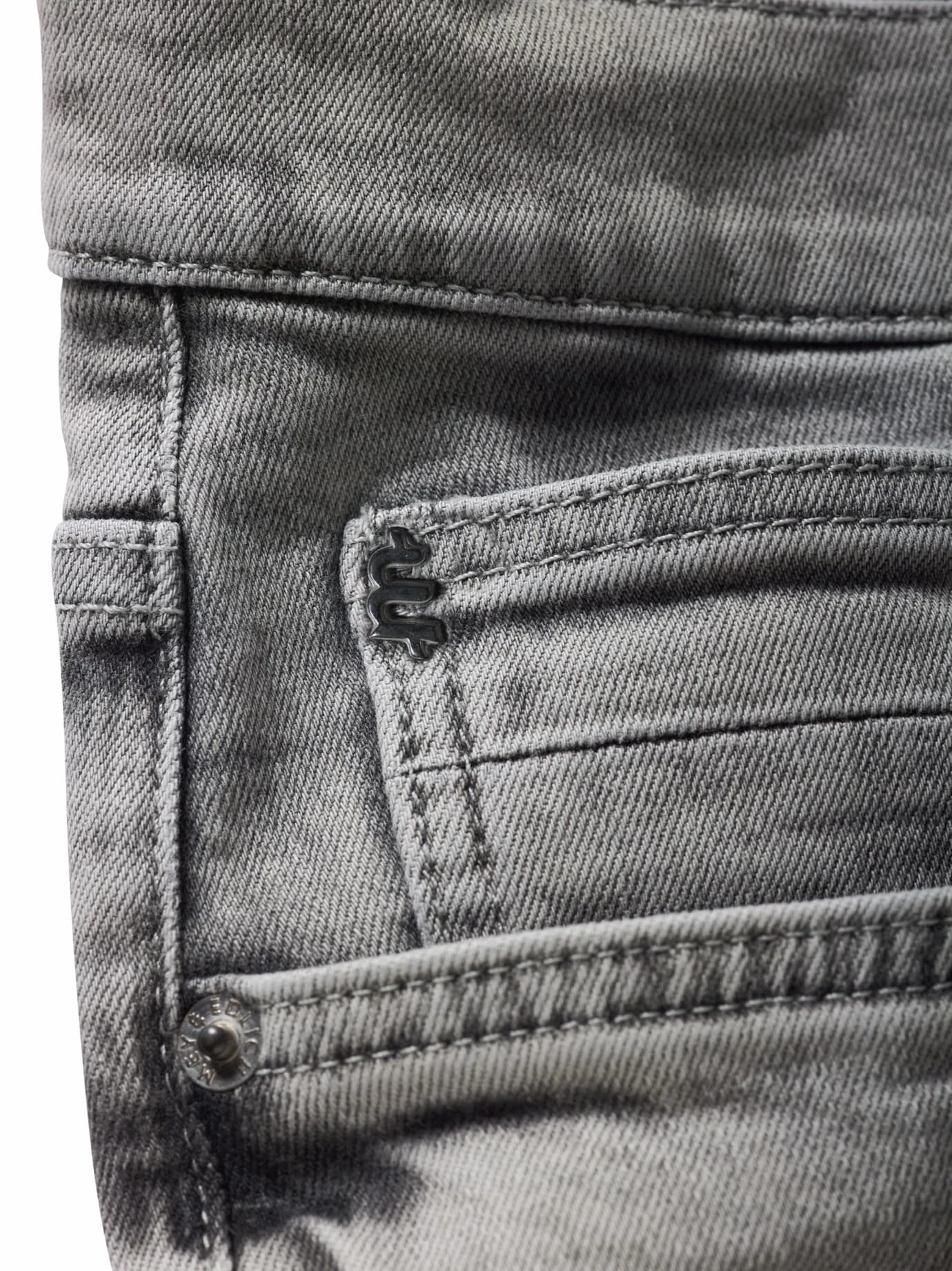 Hat sich gewaschen. Erinnert an die Jeanswaschung der 1980er, als sich an den Nähten immer leichte Sprenkel in der Waschung bildeten. Die, die immer den etwas stärkeren Kontrast zwischen hellen und dunklen Stellen trägt und den augenzwinkernden Biker-Look ergibt. Heute wird der Umwelt zuliebe schonender gewaschen, den Krinkeleffekt schmirgeln Bimssteine ein. 30 Jahre später ist auch das Verhältnis zwischen Bio-Baumwolle und Elasthan sorgfältig abgestimmt, sodass Sie gute Bewegungsfreiheit genießen und das Hosenbein modisch anliegt.