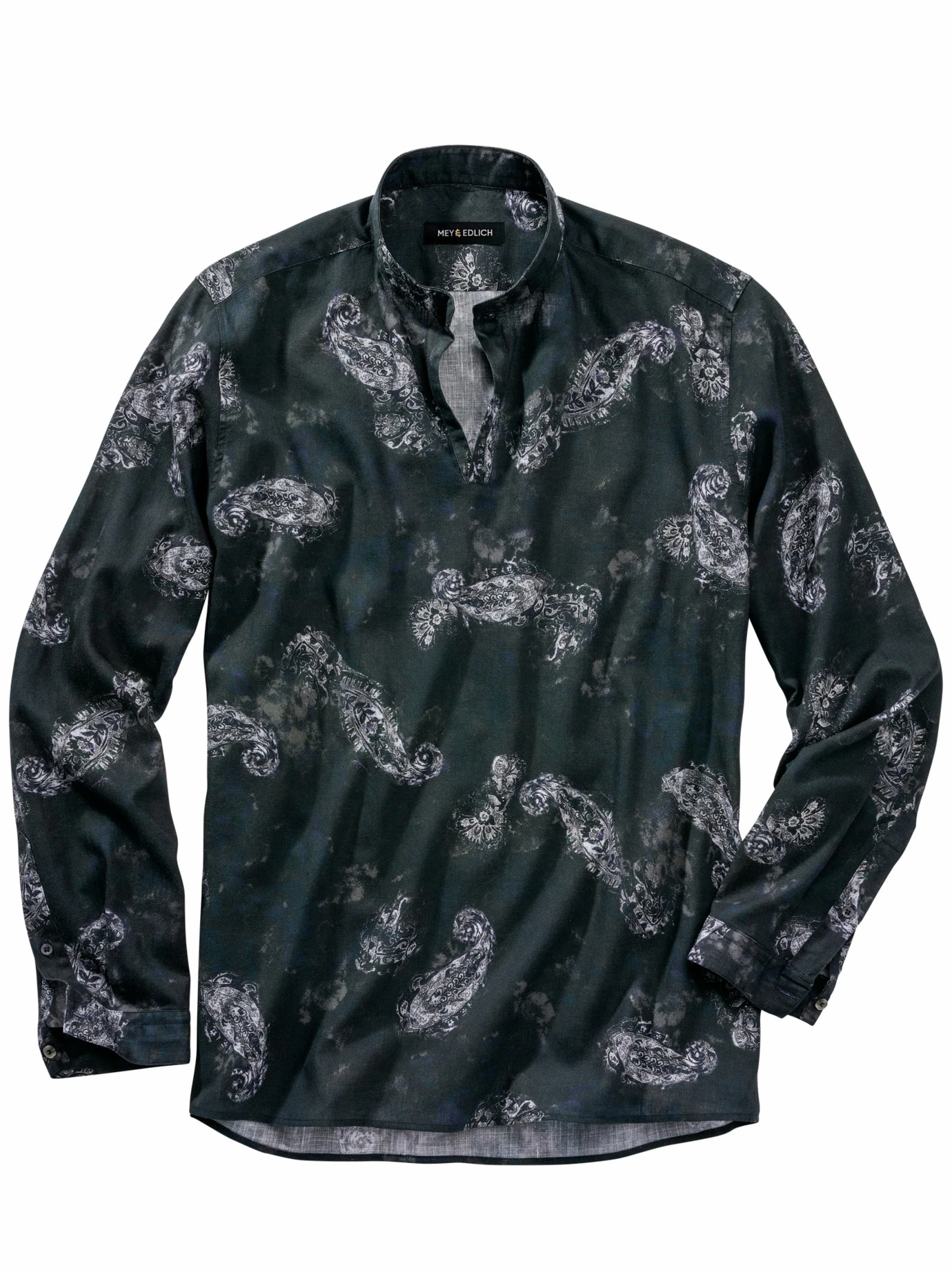 „[…] junge Leute, die in auffälliger Bekleidung Kirche oder Jahrmarkt besuchen“, so Friedrich Kluge einst in seinem etymologischen Lexikon über Dandys. Heute ist der Wunsch aufzufallen vergleichbar, wenn auch die kulturellen Events andere sind. Gelebter Look eines Paisleyhemds, mit offenem, lässig fallendem Stehkragen. Der entspannte Schnitt mit leichter Taillierung und die schmalen Manschetten bringen den Look auf den Punkt, vor allem, wenn Sie das Hemd nachlässig über der Hose tragen.