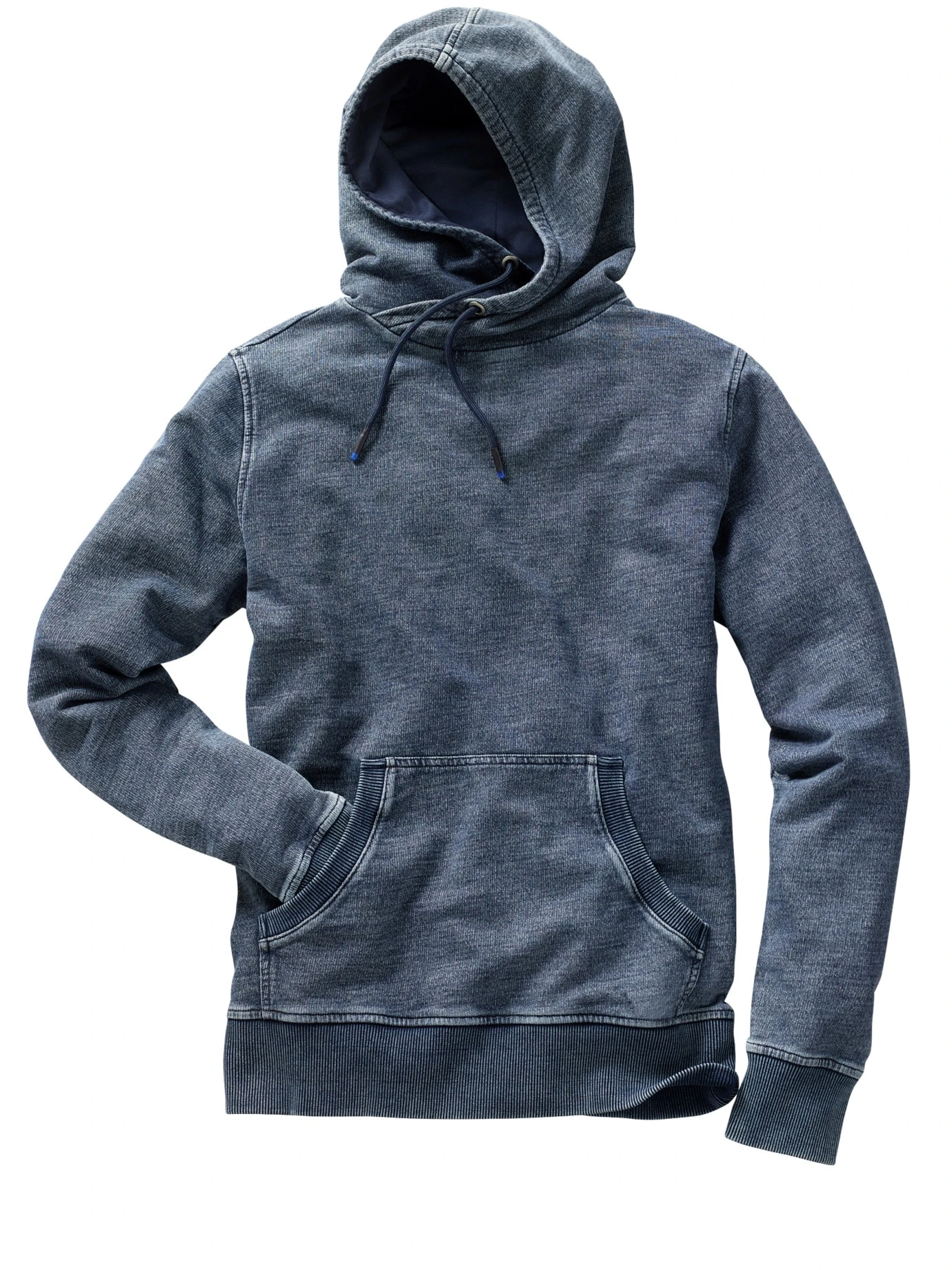 Jeans werden so wenig älter wie dieser Hoodie. Beide werden interessanter. Er ist auf Used-Jeansoptik getrimmt, nach dem Nähen wird ihm eine Denim-Waschung verpasst. Jeder Hoodie ein Unikat, seine Farbe lebt weiter, so, wie es sich ergibt, und trägt immer stärker Ihre Handschrift. Zu Beginn weiße Sitze und Sofas meiden – wie bei einer guten Jeans. Der türkische Stricker verwendet übrigens ein dreifädiges Garn, was dem Hoodie Volumen verleiht, der Loopback-Strick verpasst winddichtes Sweatshirt-Feeling.