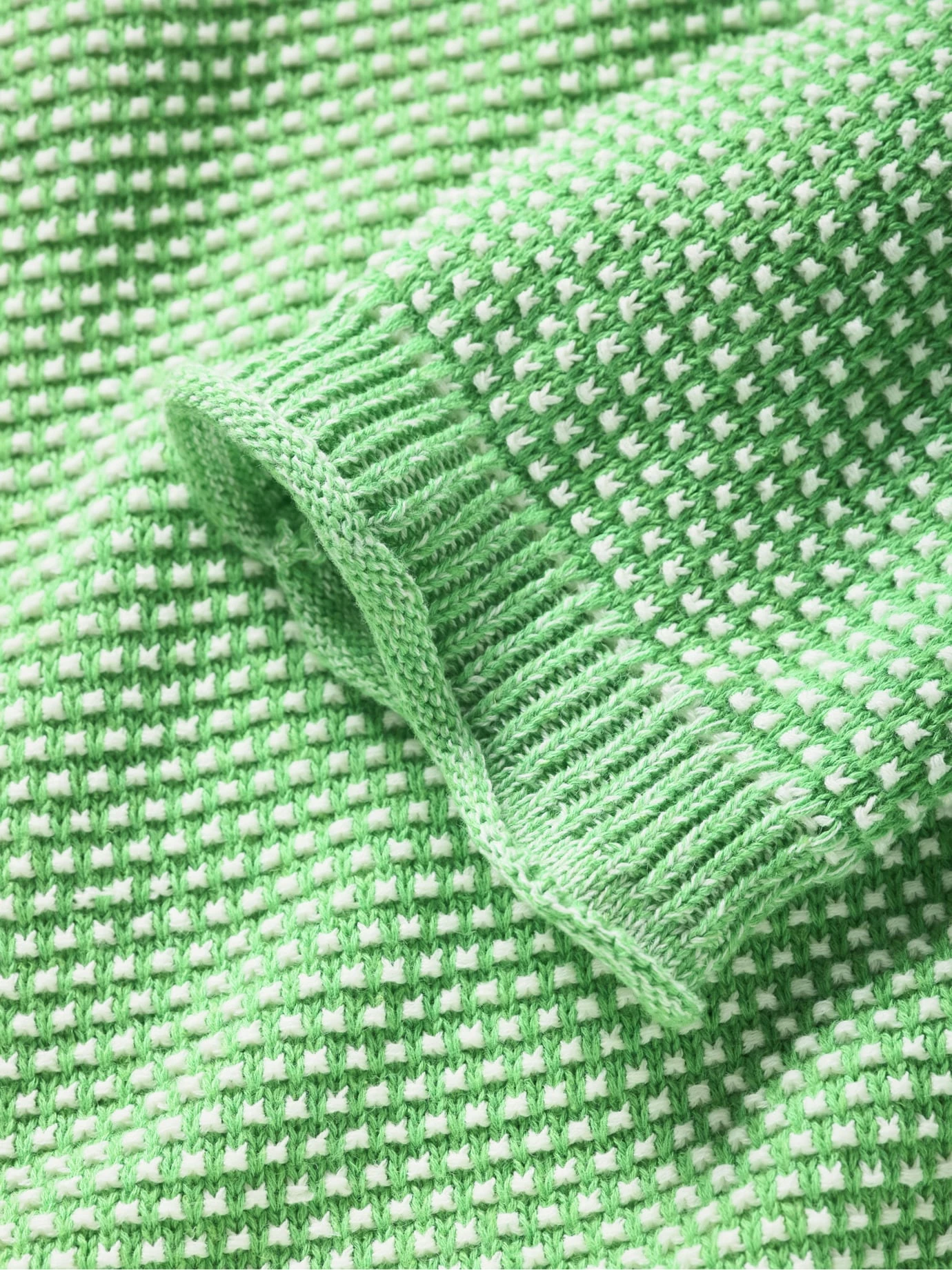 Aus der Erfahrung gelernt. Gestrickt ist er so, wie Generationen es schätzen, im Perlmusterstrick – ziemlich akkurat, ziemlich gleichmäßig und optisch edler als herkömmlicher Rechts-Links-Strick. Dass er sich so angenehm trägt und quasi natürlich nachgibt, verdankt der Pullover seiner Technik. Liegt an den fühlbaren Perlen des Stricks – sie ergeben kleine Luftpolster, die ihn ideal bis in den Spätherbst machen, für den Wärmeausgleich sorgt das richtige Verhältnis zwischen Baumwolle und Leinen.