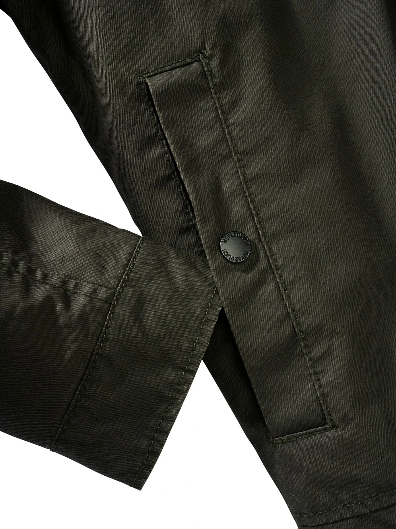An ihr perlt alles ab. Deshalb ist die Wachsjacke so geschätzt, insbesondere bei jenen, die viel draußen unterwegs sind. Ungeliebt hingegen sind der strenge Geruch und die öligen Finger, die eine klassische Wachsjacke hinterlässt. Diese nicht! Dafür sorgt die Trockenwachsbeschichtung aus Polyurethan, die die natürliche Atmungsaktivität der Baumwolle bewahrt und wasserabweisende und winddichte Eigenschaften ergänzt. Und den derben Look.