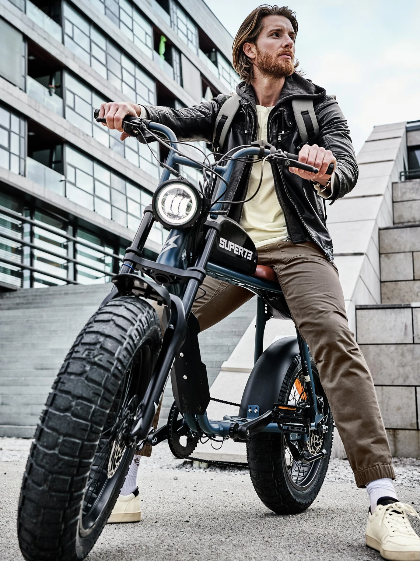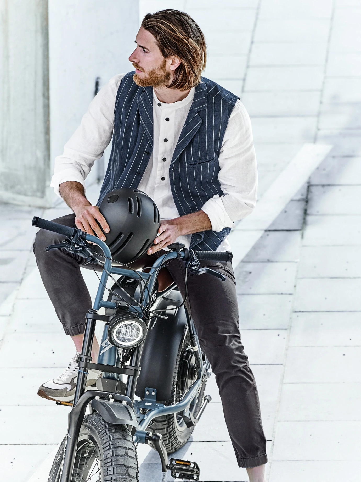 Elektrifiziert bis ins Bündchen. Die Cuttings an den Knien hat sie sich von den Bikerhosen abgeschaut, die einst dem Schutz dienten und heute für coole Optik sorgen. Die Baumwolle liegt weich auf der Haut, der Anteil Elasthan sorgt auf dem E-Bike für Tretfreiheit. Aerodynamische Bündchen sorgen dafür, dass die Hose im Fahrtwind weder flattert noch sich in der Kette verfängt. Aus den extragroßen Taschen rutscht auch in der Bewegung nichts raus. Sportlich mit Sweater und Lederjacke, beim Außentermin mit Hemd und Weste. Sneaker gehen immer.