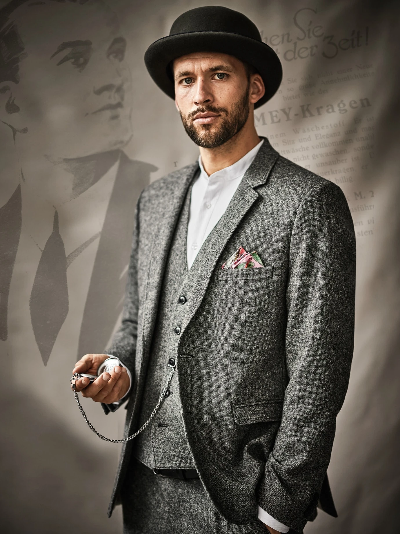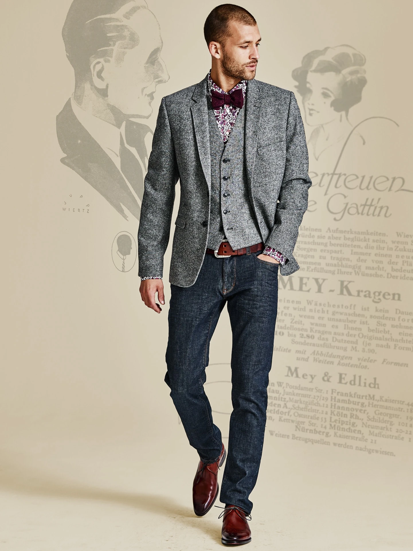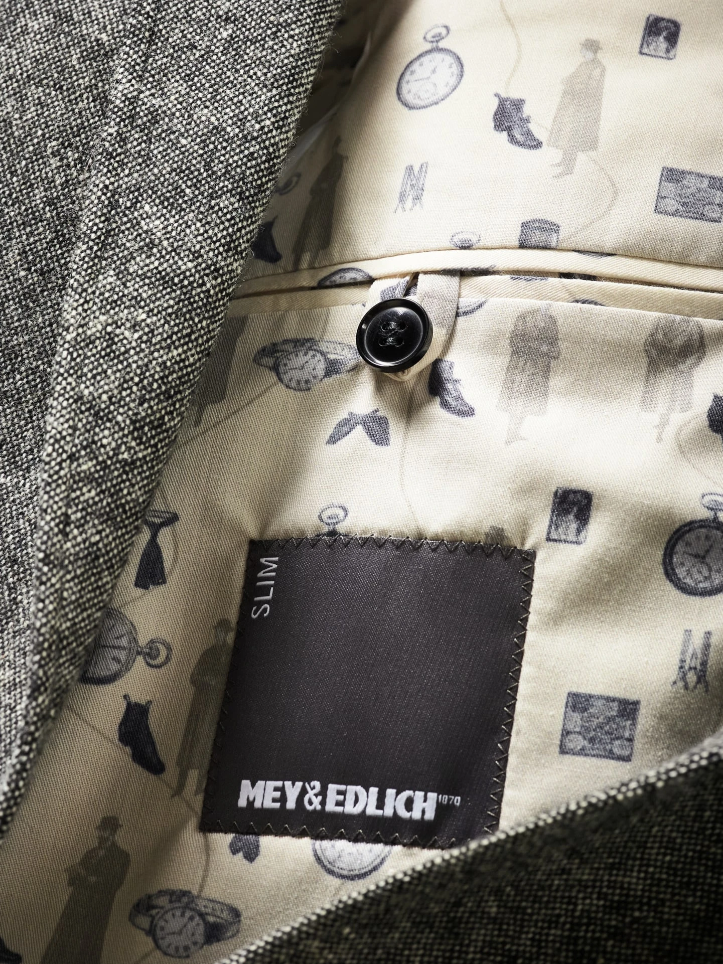 Zu Ehren unseres Ernsts. Weil er für uns Gründervater, Visionär und immer wieder Quell der Inspiration ist. Ein Sakko, wie es zum Gentleman gehört. Gewebt aus einem erstaunlich weichen Tweed, weniger bockig als die Sakkos des vorletzten Jahrhunderts. Gemacht für niedrige Temperaturen – so wie sie Ernst Mey seinerzeit vermutlich auch auf seiner Reise nach Kanada erlebte. Aus Wertschätzung ist das Innenfutter mit originalem Bildmaterial alter Kataloge bedruckt. Beste Verarbeitung vom Anzugkonfektionär. Erhältlich bei Bedarf auch als Dreiteiler.