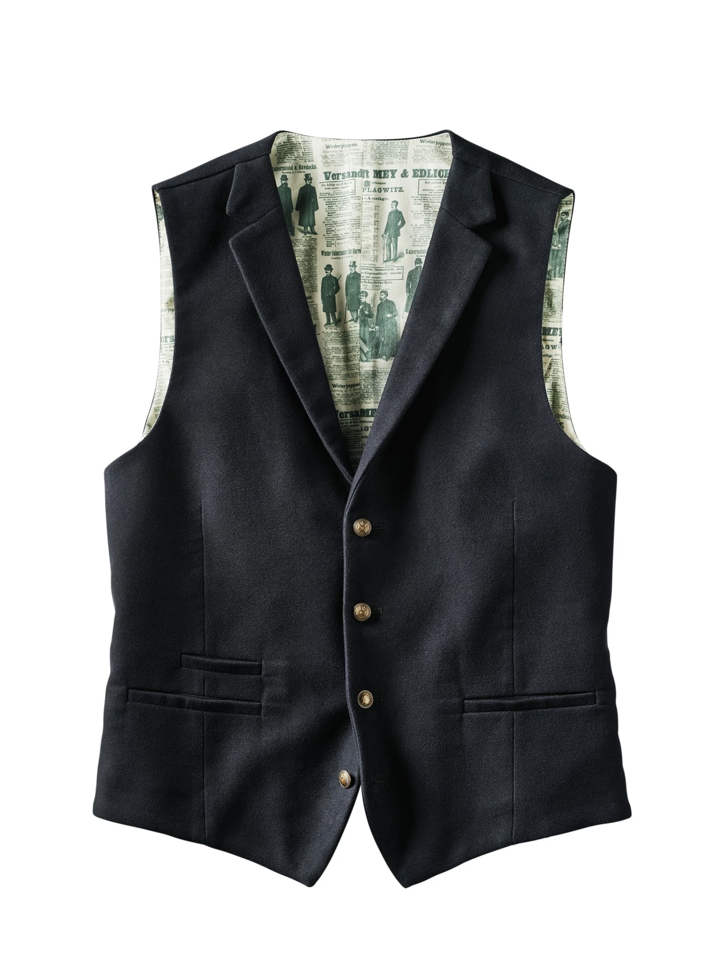 Ausklingendes 19. Jahrhundert. Bei der Entwicklung dieser Weste orientierten wir uns am Original unseres Gründers, Ernst Mey. Vermutlich trug er seinerzeit eine Weste aus leichtem Wolltuch. Das war uns für die Neuauflage jedoch zu bockig, sodass wir uns für einen Moleskin aus Baumwolle entschieden. Moleskin ist besonders weich und bequem, aus Baumwolle ist er das ganze Jahr über tragbar und sieht auch noch cool aus. Zudem ist er sehr fest gewebt; muss er auch, damit die Taschenuhr keine Beulen im Stoff schlägt. Mit stoffgleichem Rücken, damit Sie die Weste auch ohne Sakko oder Gehrock (wie Ernst) tragen können.