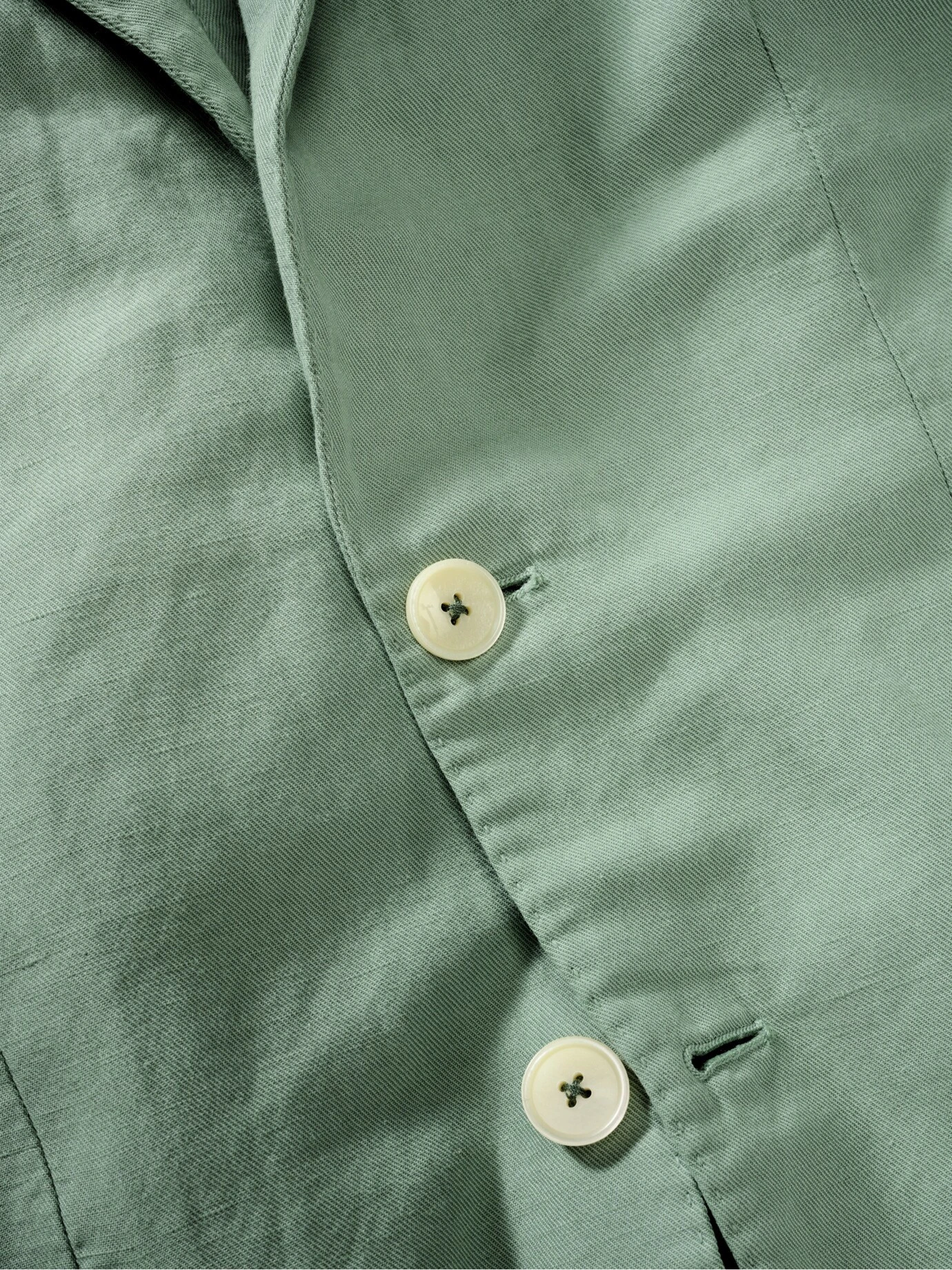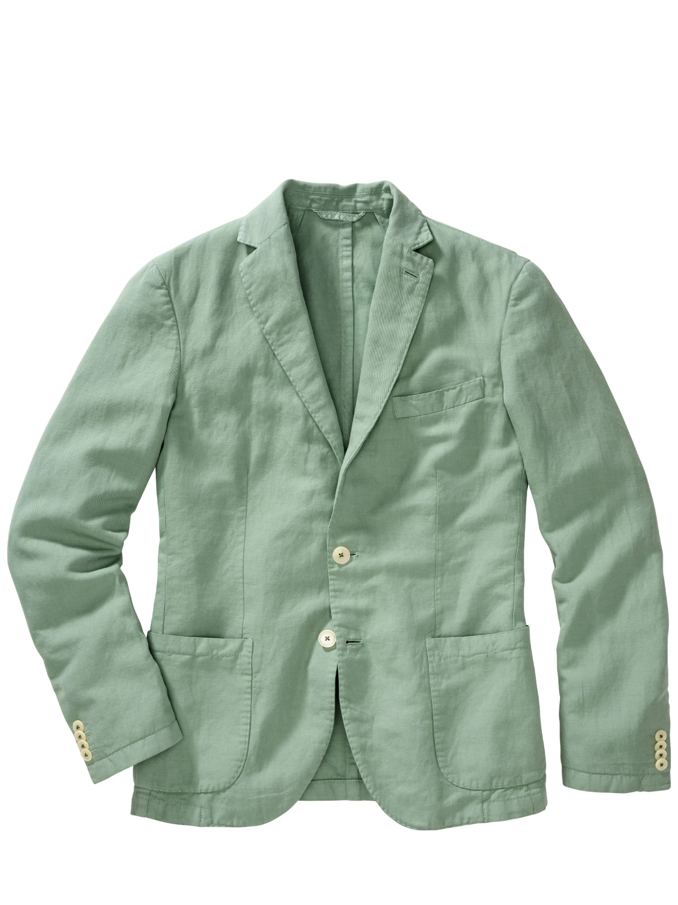Da zieht der Fischermann den Hut. Das Grün des Sakkos strahlt eine vertraute Frische aus. Noch ist die Farbe ungewöhnlich, aber sie steht vielen Hauttönen, wirkt interessanter als Beige und verzeiht obendrein noch Schmutz. Der von Bonomi in Italien gewebte Stoff aus weicher Baumwolle und temperaturregulierendem Leinen kühlt angenehm. Zu den sommerlichen Naturfasern passt die luftige Bauweise des Sakkos. Es hat nur an den Ärmeln ein Futter, damit es leichter über Hemd oder T-Shirt gleitet. Perfekt zu hellen Leinenhosen, Chinos oder dunkelblauen Jeans.
