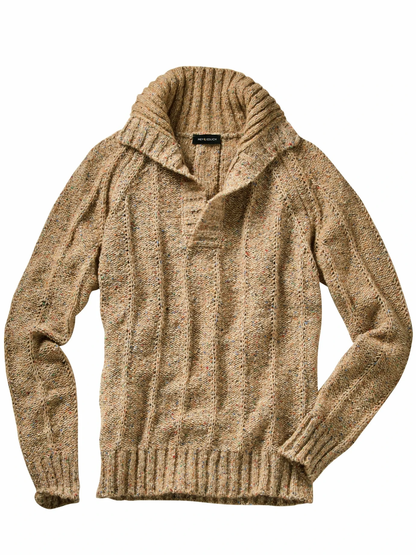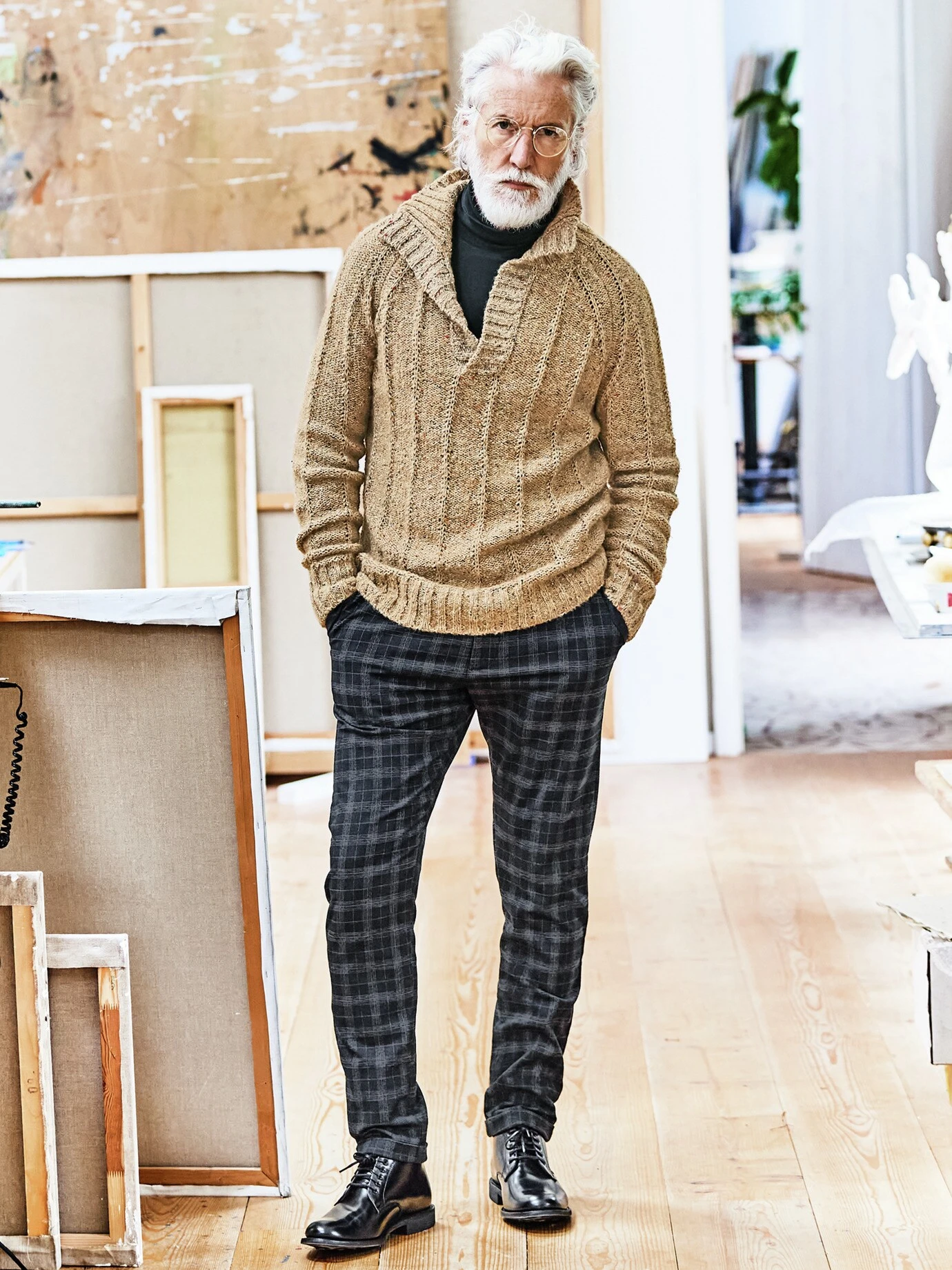 Ausgegorenes Strickwerk. Der Pullover lässt sich nicht einordnen – er wärmt wie ein Wollpullover, kümmert sich wie ein Rolli und wirkt sportlich durch den tiefen V-Ausschnitt mit Kragen wie ein Henley. Das Garn samt Strickwerk stammt aus Italien und kommt selbst empfindlicher Haut entgegen, da der Pullover nie frieren lässt und durch seine Komposition angenehm weich ist, dabei aber pflegeleicht bleibt und seine Haptik spannend wirkt, beinahe kernseifig. Drunter passen Hemd, Rolli, Shirt, der Freigeist entscheidet die Hosenwahl.