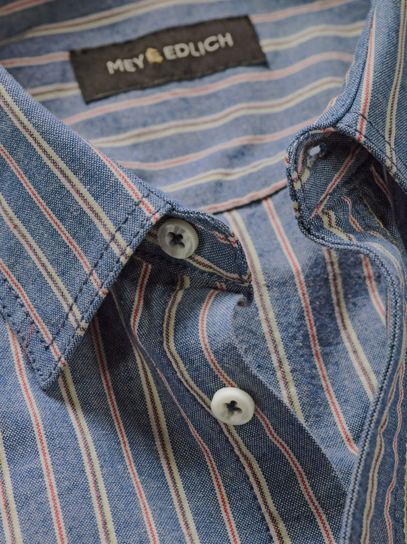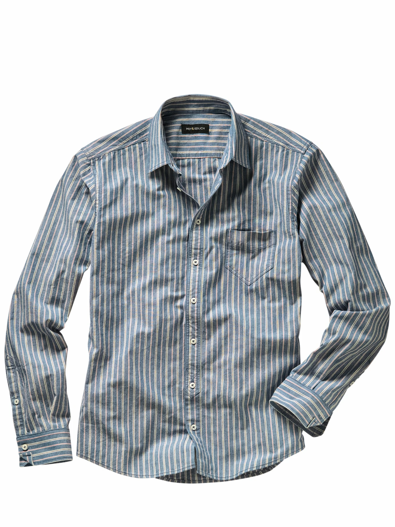 Der Star unter den Streifen. Die amerikanischen Nationalfarben eröffnen schier unbegrenzte (Kombinations-)Möglichkeiten, den Beweis tritt dieses Hemd an. Die roten und weißen Streifen, die aussehen, als hätten sie schon einige Runden in der Waschmaschine gedreht, tunen den Denim runter. Sie sind haltbar eingewebt und lassen Ihnen die Freiheit, das Hemd ewig zu tragen. Der Stoff ist robust, aber unter einer Jacke nicht zu dick. Passt zum halben Hosenkleiderschrank, wer intuitiv zur Jeans greift, macht alles richtig.