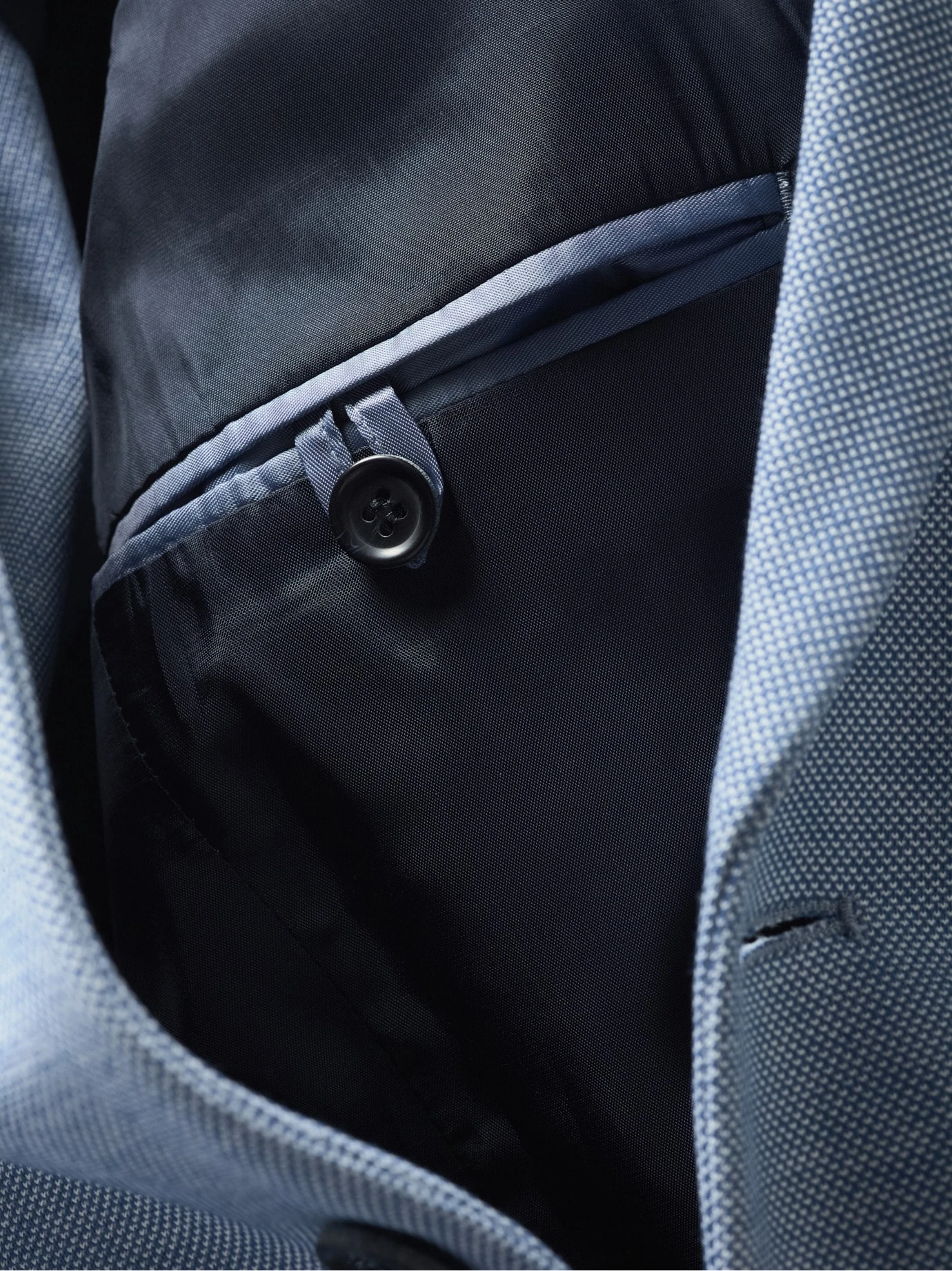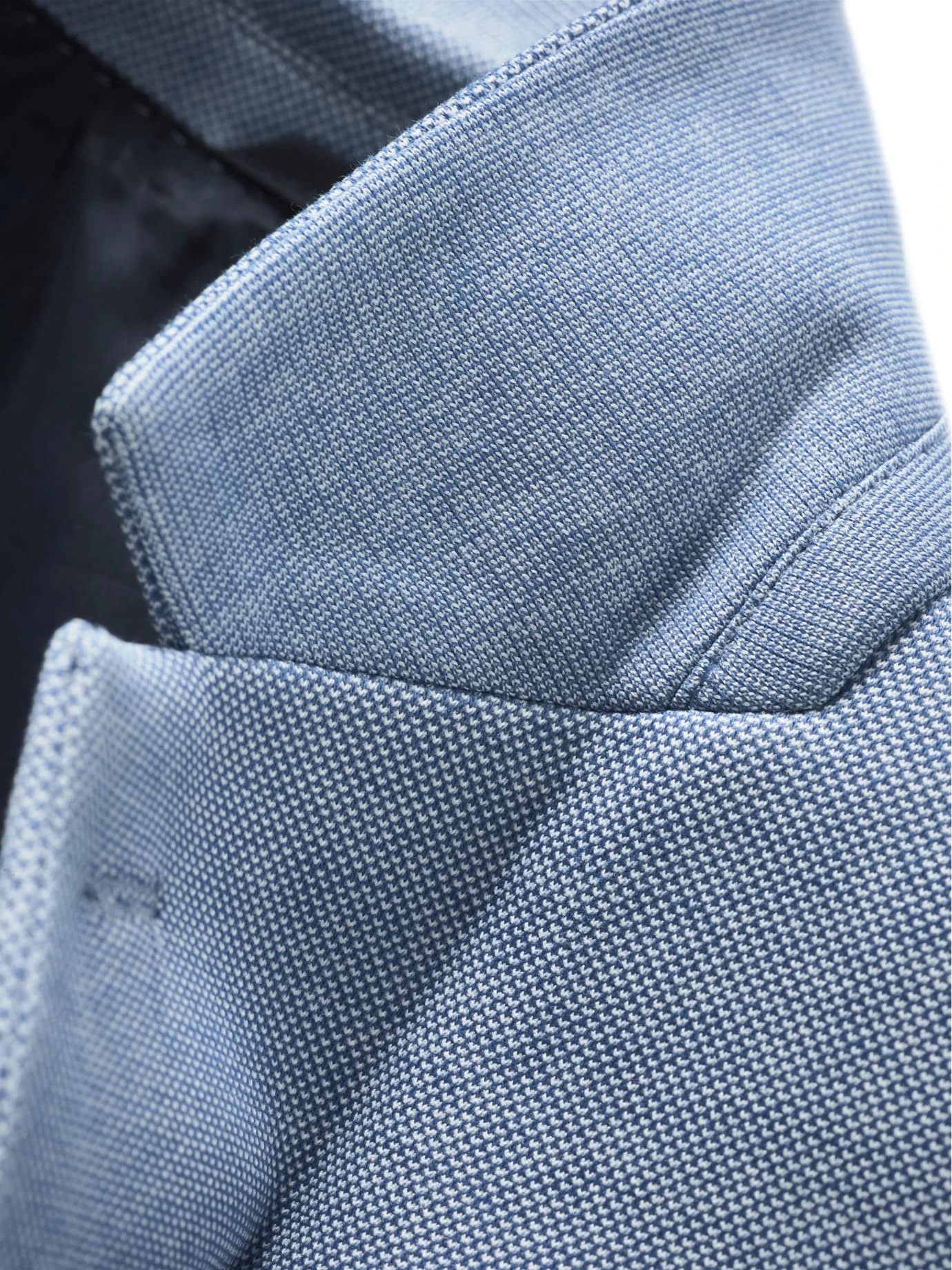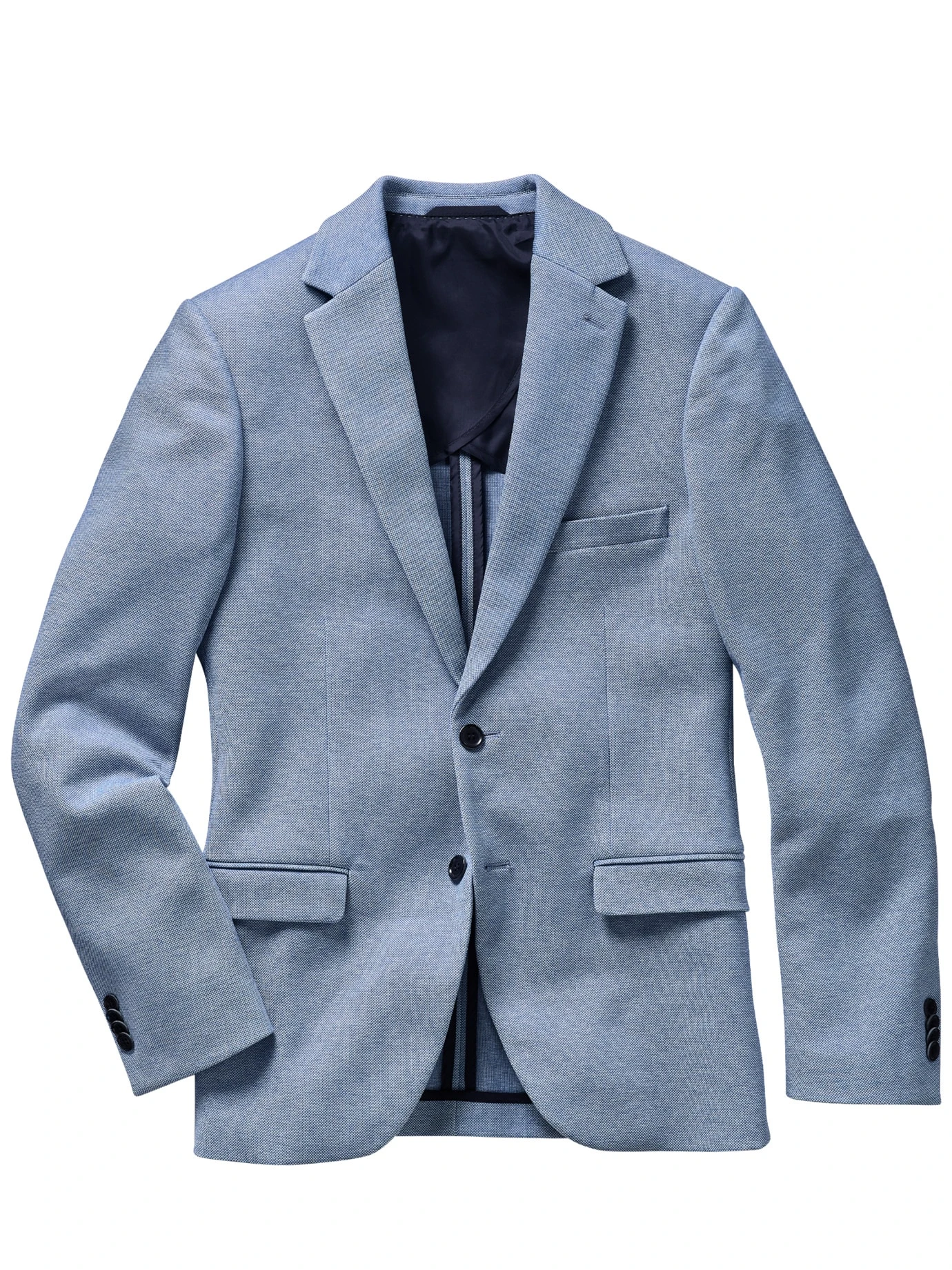 Seien Sie der Erste im neuen Anzugblau. Denn als Anzugfarbe ist dieser Ton (noch) total selten, aber sicher nicht mehr lang. Das Blau des Anzugsakkos ist im richtigen Maße heller als Businessblau, wirkt angezogen deutlich frischer und ist ausgerichtet auf die dynamische Businesswelt. Sein Tuch ist ein stabiler Piquéjersey, der knitterfrei und unempfindlich ist, dank des Anteils Baumwolle ist er ausgelegt für Sommertage. Am schönsten zur passenden Anzughose (Nr. 24-6761-4).