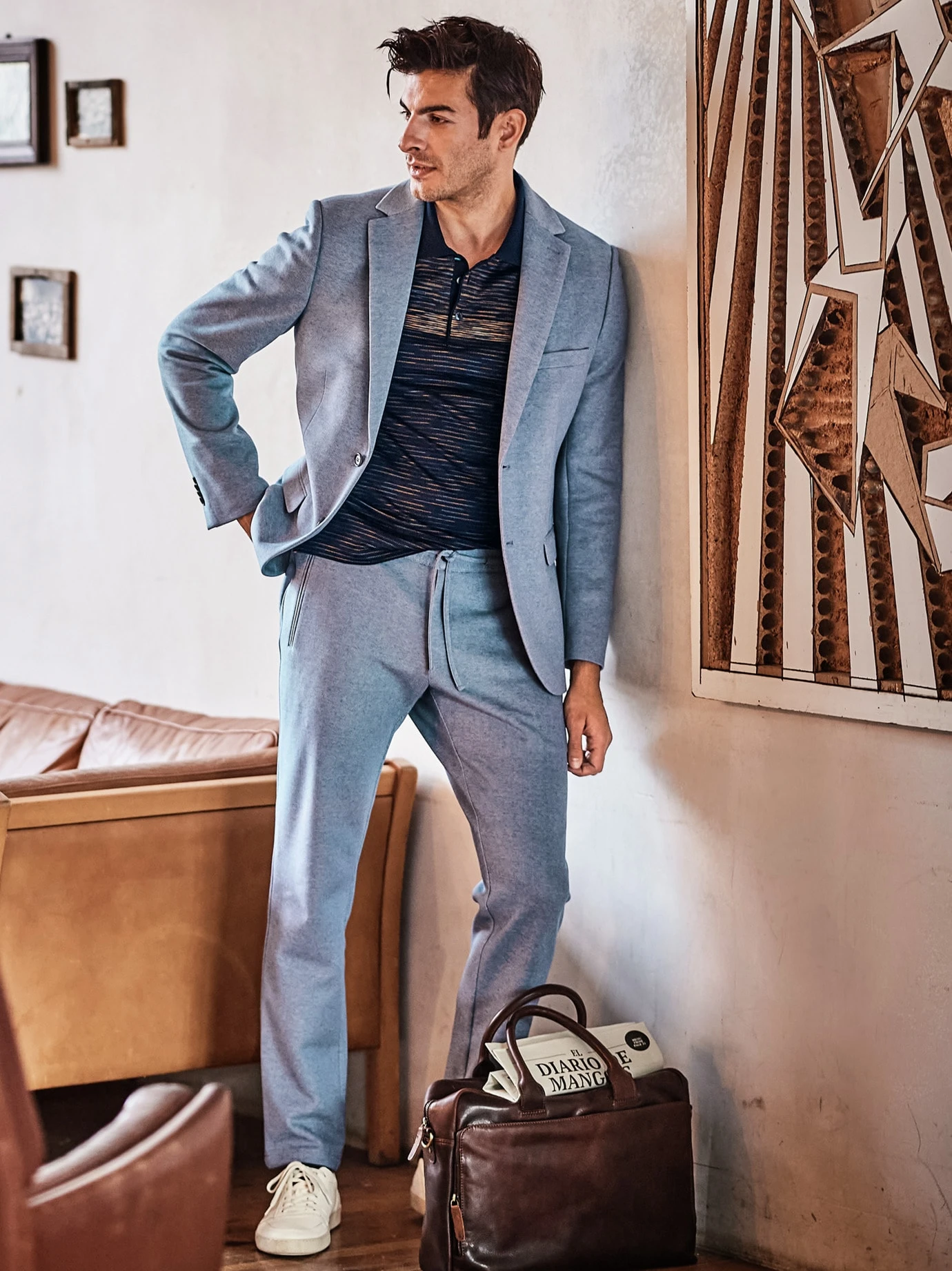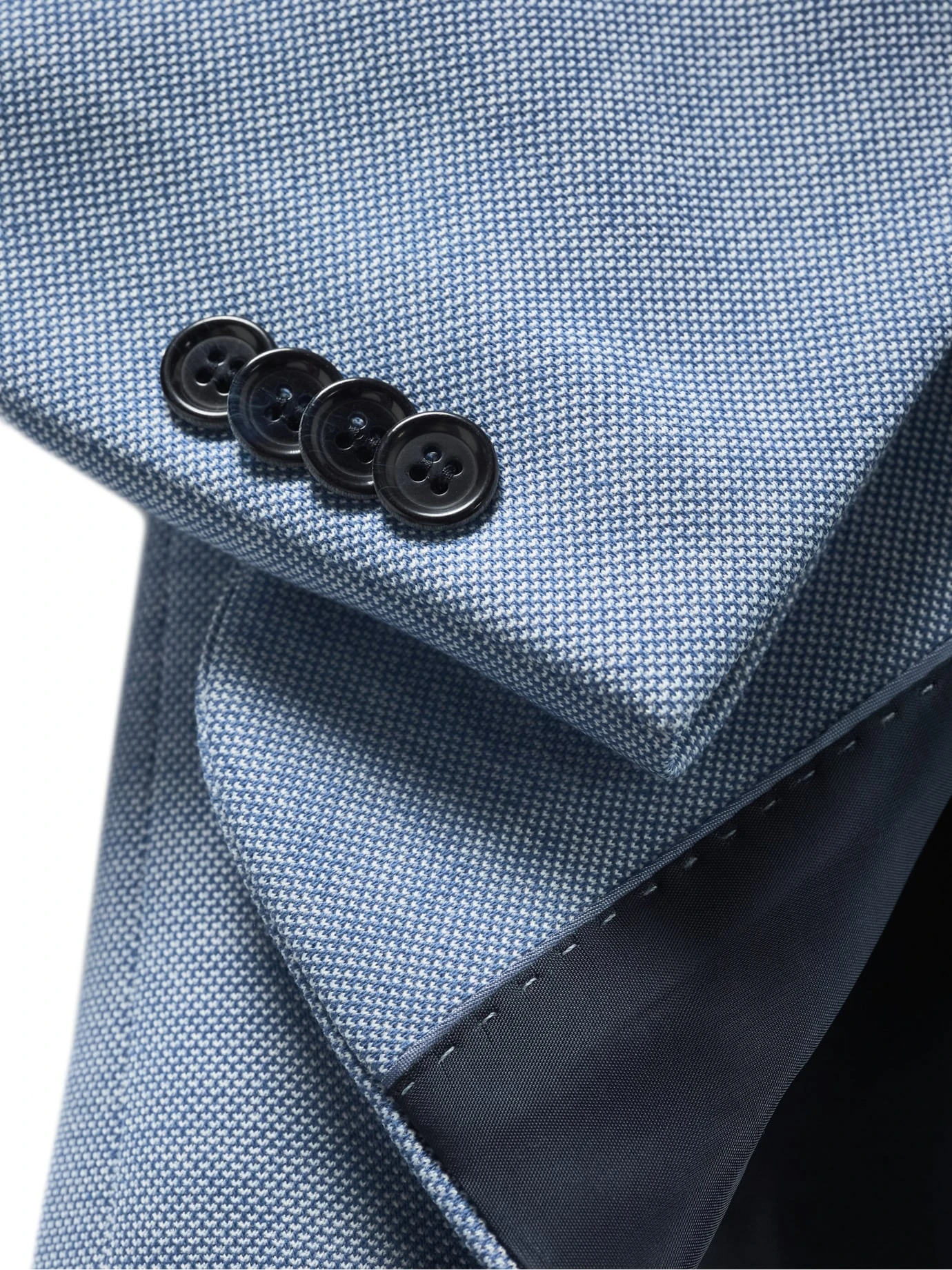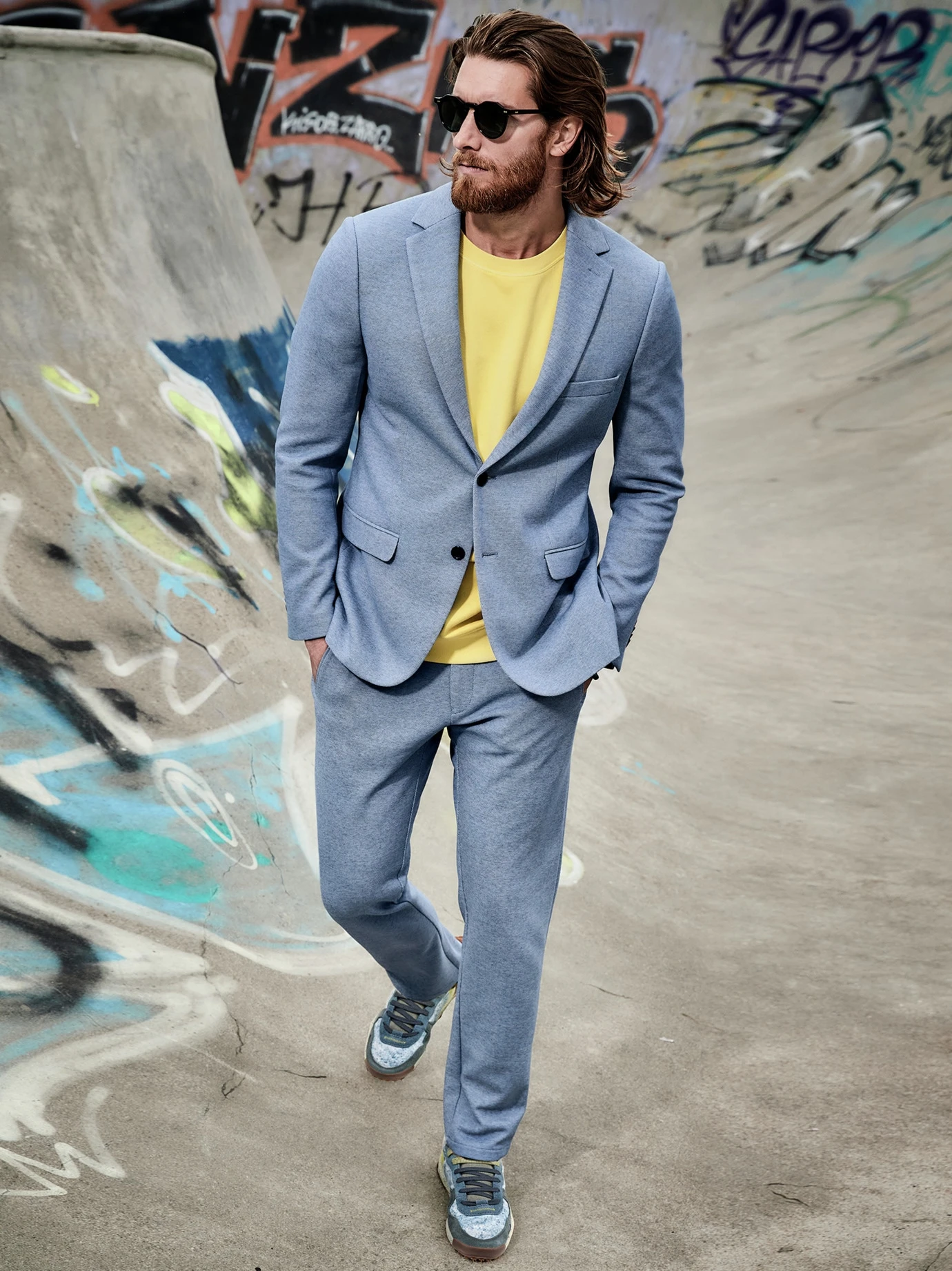 Seien Sie der Erste im neuen Anzugblau. Denn als Anzugfarbe ist dieser Ton (noch) total selten, aber sicher nicht mehr lang. Das Blau des Anzugsakkos ist im richtigen Maße heller als Businessblau, wirkt angezogen deutlich frischer und ist ausgerichtet auf die dynamische Businesswelt. Sein Tuch ist ein stabiler Piquéjersey, der knitterfrei und unempfindlich ist, dank des Anteils Baumwolle ist er ausgelegt für Sommertage. Am schönsten zur passenden Anzughose (Nr. 24-6761-4).