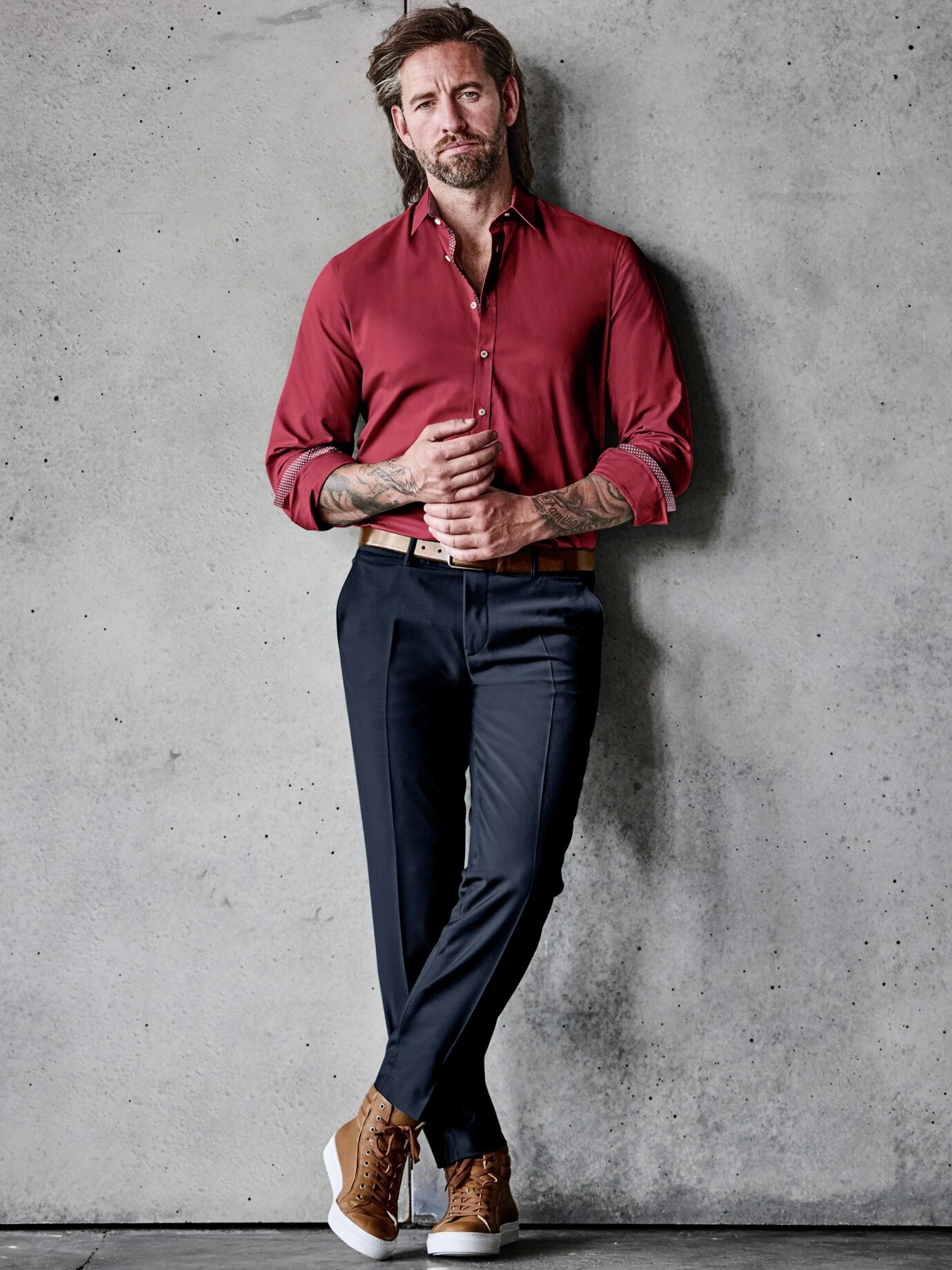 Erwachsen geworden ist er, der Hightop-Sneaker. Mit gut gepolstertem Schaft und aus kräftigem Rindleder in sattem Braunton gefertigt (die weiße Gummilaufsohle bleibt zwecks Authentizität ein Muss), zeigt er sich nun für kalte Tage gerüstet. Der ursprünglich für Basketballspieler konzipierte Sneaker mit knöchelstützender und -schützender Funktion hat sich in Material, Farbgebung und Kombinierfähigkeit weiterentwickelt. Funktioniert sogar zur aufgebügelten Hose.