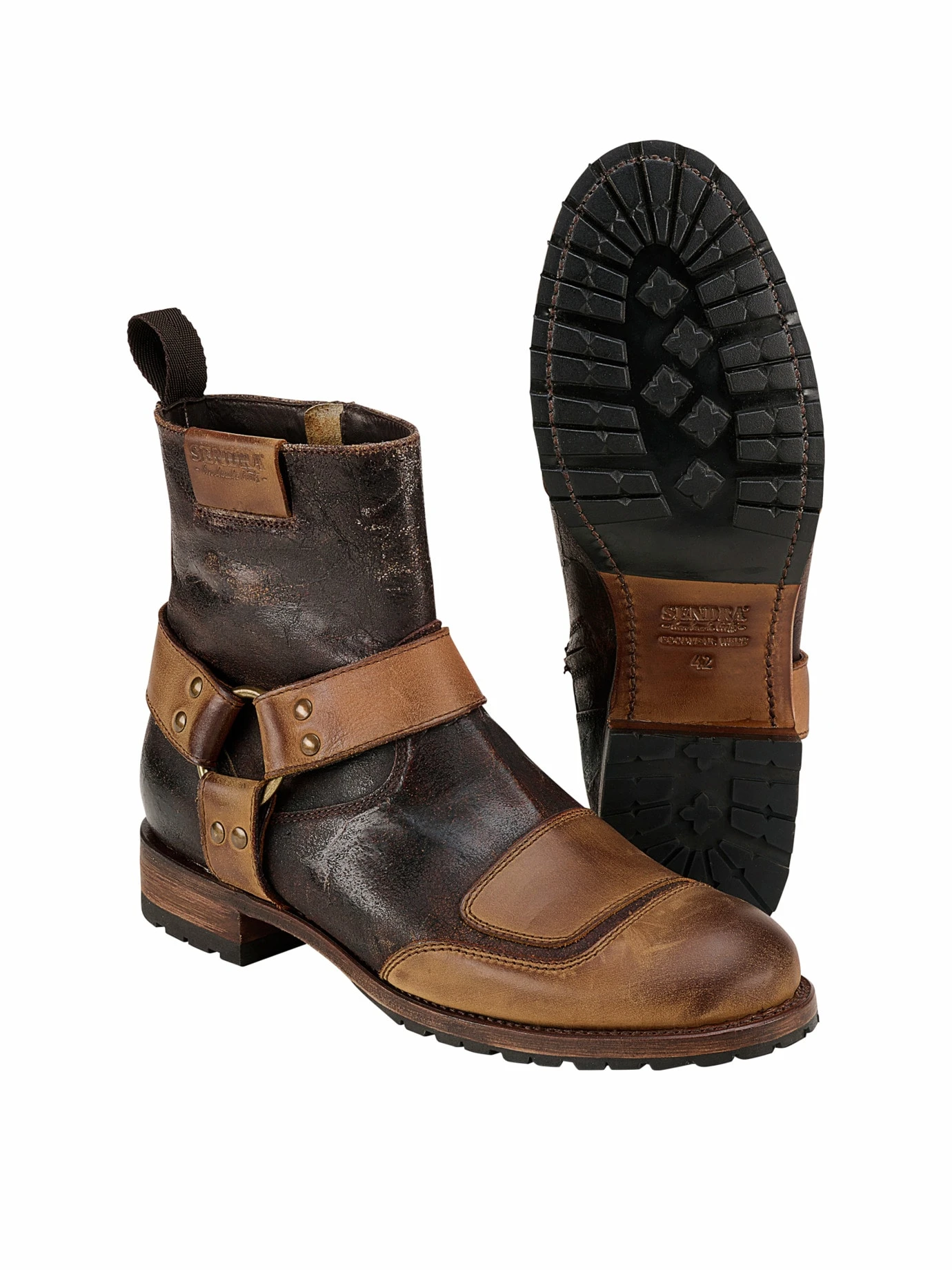 Unter Bikern längst kein Geheimtipp mehr. Schon seit geraumer Zeit ist Sendra® in der Szene die sichere Bank, jetzt schicken die spanischen Boots-Spezialisten den Bikerboot in die urbane Szenerie. Natürlich gefüttert mit Rindleder, sodass auch nach der Tour die Füße frisch sind. Gekonnter Stil-Mix: Die beiden Rindleder stammen aus spanischer Gerberei, das dunkelbraune ist bewusst brüchig, als hätte es schon Asphalt gesehen. Für die Straße gezielt ausgestattet mit einer Ledersohle, die an den richtigen Stellen mit Gummi schützend profiliert ist.