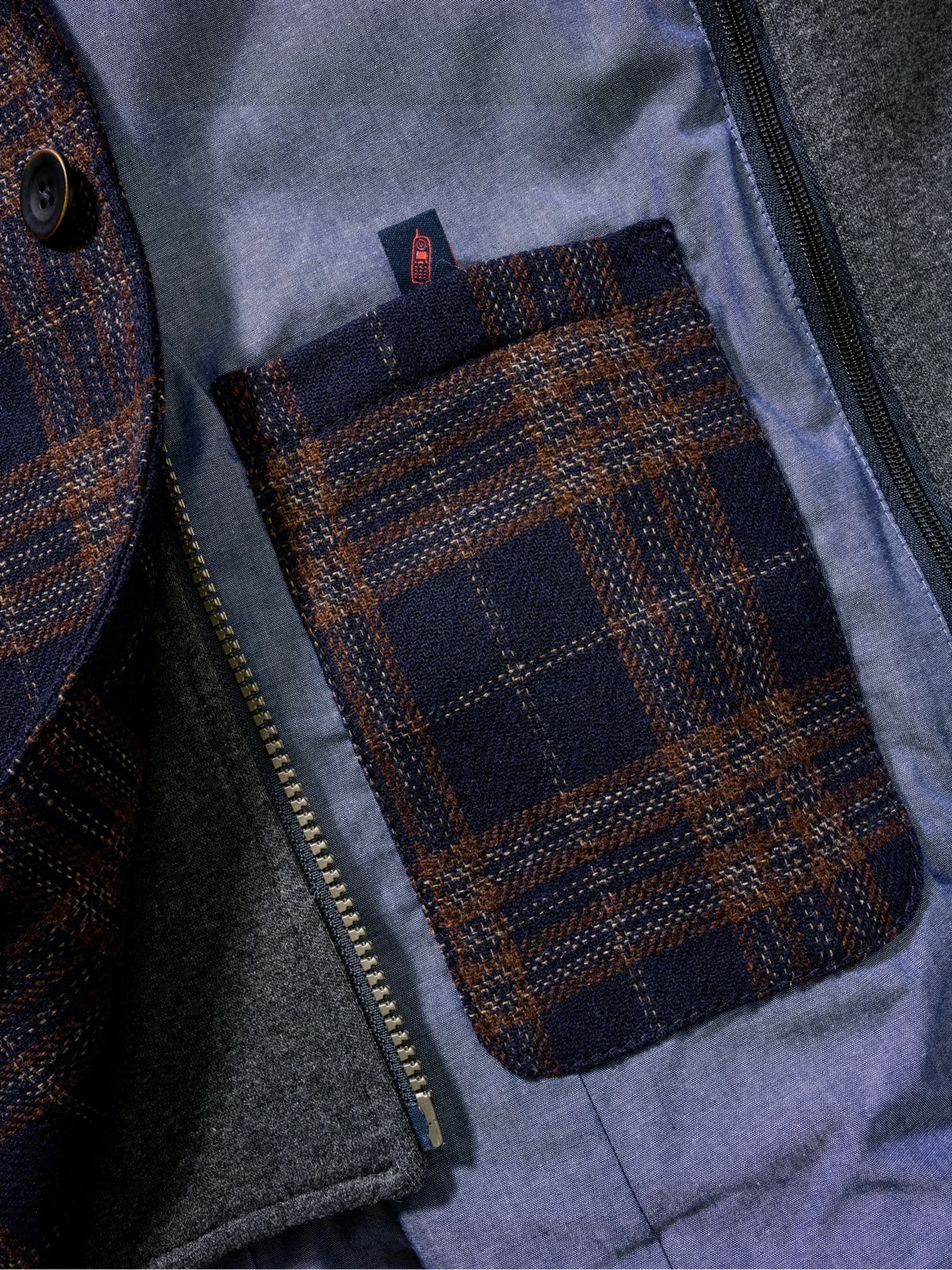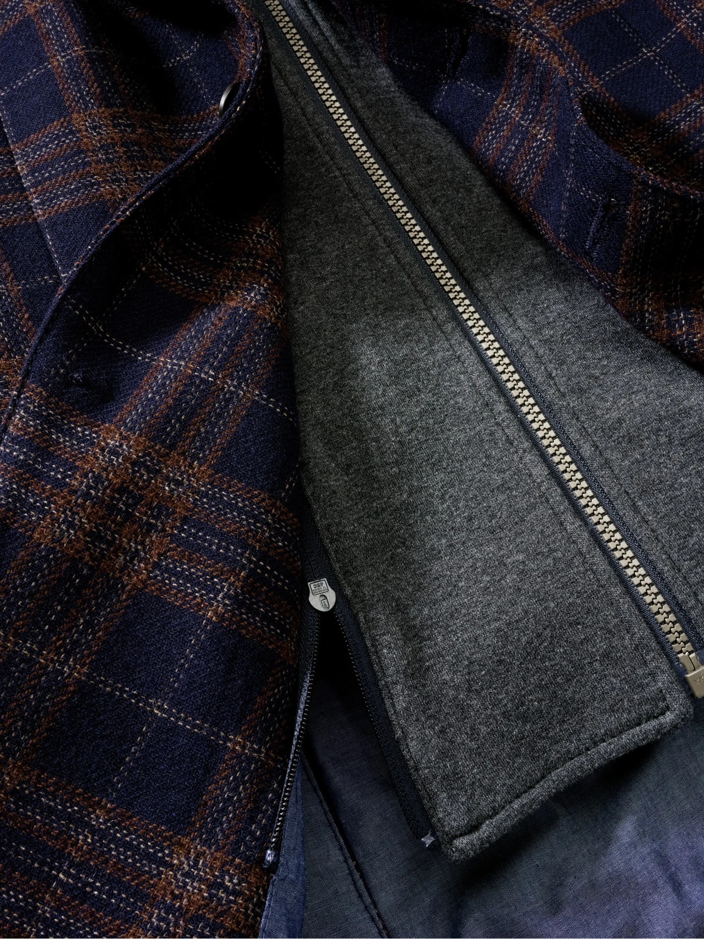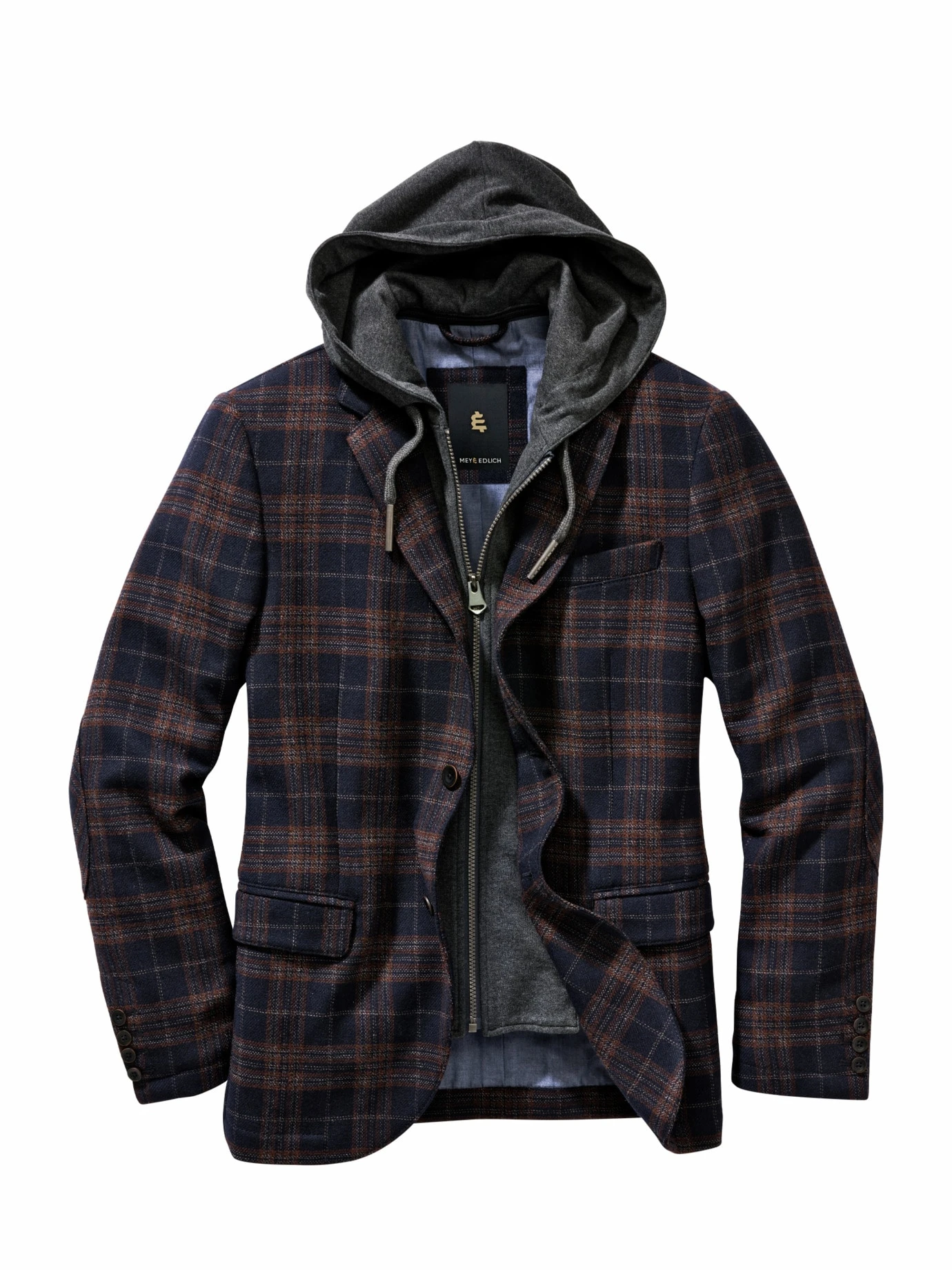 Für jede Umdrehung zu haben. Dieses Sakko sitzt bequem und passt zu 95 % der Anlässe. Der Stoff aus wärmender Wolle und unkompliziertem Hightech, die Farbe zu vielem passend, der Stil flexibel. Das Sakko ist ausreichend korrekt, lässiger wird es mit dem individuell einsetzbaren Kapuzeninlay. Unterwegs liegen Flaschenöffner und Taschentuch in einer der äußeren Pattentaschen, alles Essenzielle innen: iPhone in der Handytasche, Börse in der zippbaren, Schlüssel in der knöpfbaren Tasche. Dazu Jeans, Hemd oder T-Shirt.