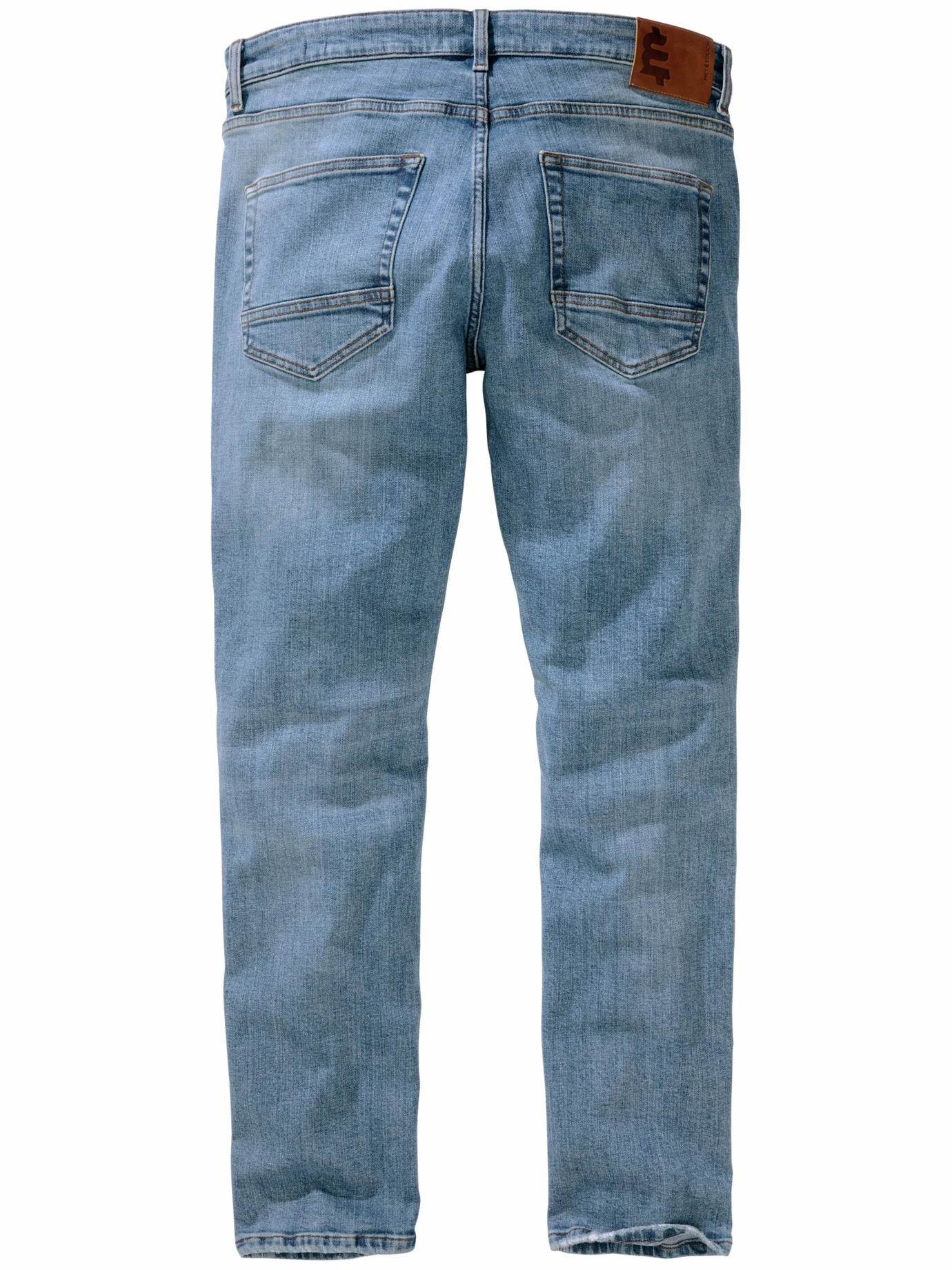 Vorhin noch die Welt gerettet! Es gibt sie, die Denimer, die sich konsequent mit Nachhaltigkeit beschäftigen und Technologien entwickeln, um Wasser zu sparen und Umweltbeeinträchtigungen zu vermindern. Dyepro ist eine Methode, Blaustoff ohne Chemie und Wasser zu färben und dabei 20 Liter pro Meter einzusparen. Neben der grünen Haltung wirkt der Used-Look überzeugend, dafür wird an den richtigen Stellen der Kettfaden angeraut, um den weißen Schussfaden leicht sichtbar zu machen (der Spezialist spricht vom Grinding).