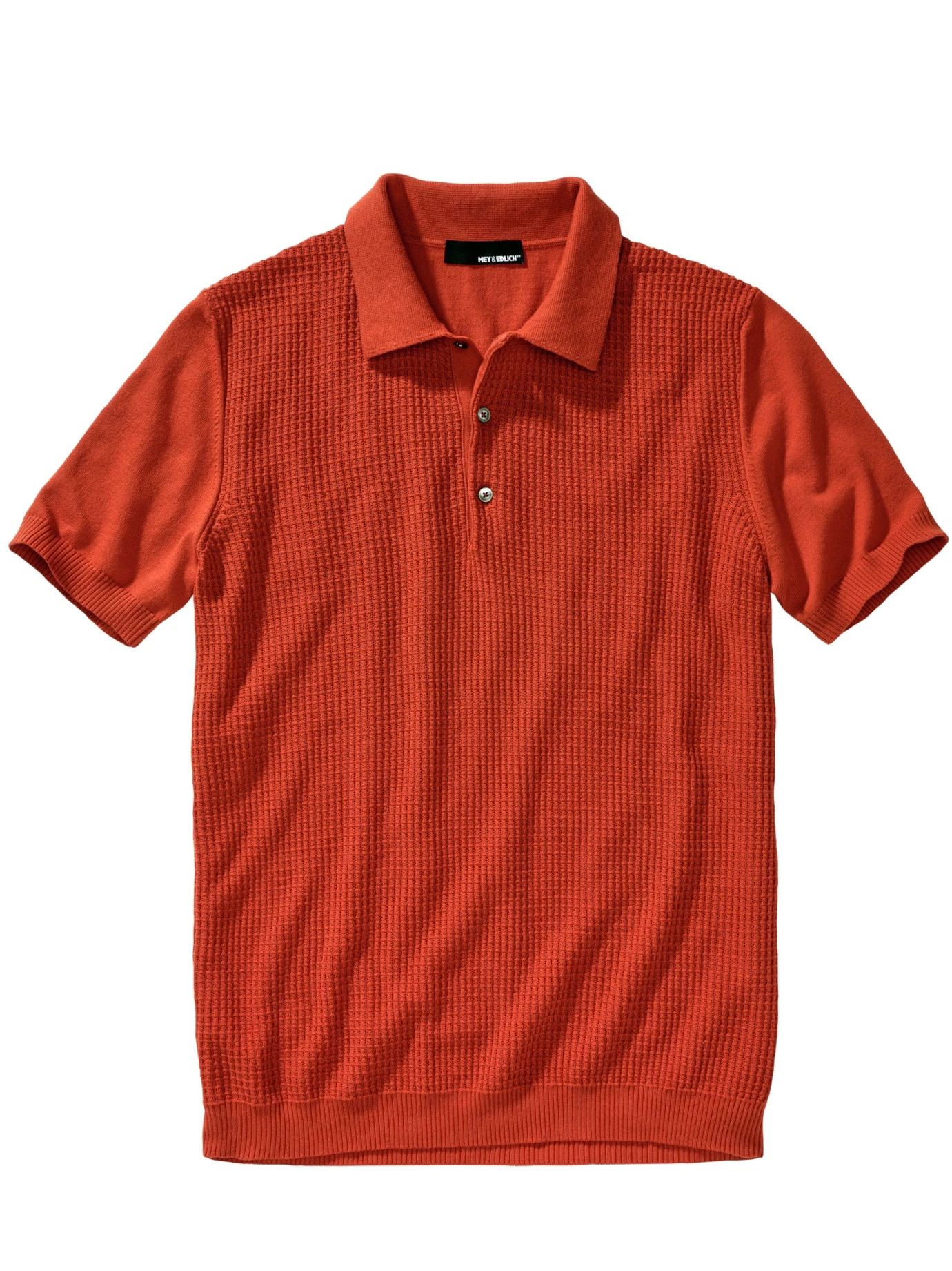 Frischluftzufuhr inklusive. Hand drauf – in diesem Polo bleiben Sie selbst bei großer Hitze cool. Grund dafür ist die sogenannte Waffelstruktur. Ergo ein Stoff mit 3D-Struktur, der nur punktuell auf der Haut liegt und so bei jeder Bewegung Frischluft zufächelt. Außerdem ist das Baumwollgarn in Italien gezwirnt und schließlich auch in Südeuropa verstrickt. Sieht verbindlich zu hellen Hosen aus (dann den obersten Knopf schließen), passt aber genauso auf die Piazza zur Shorts.
