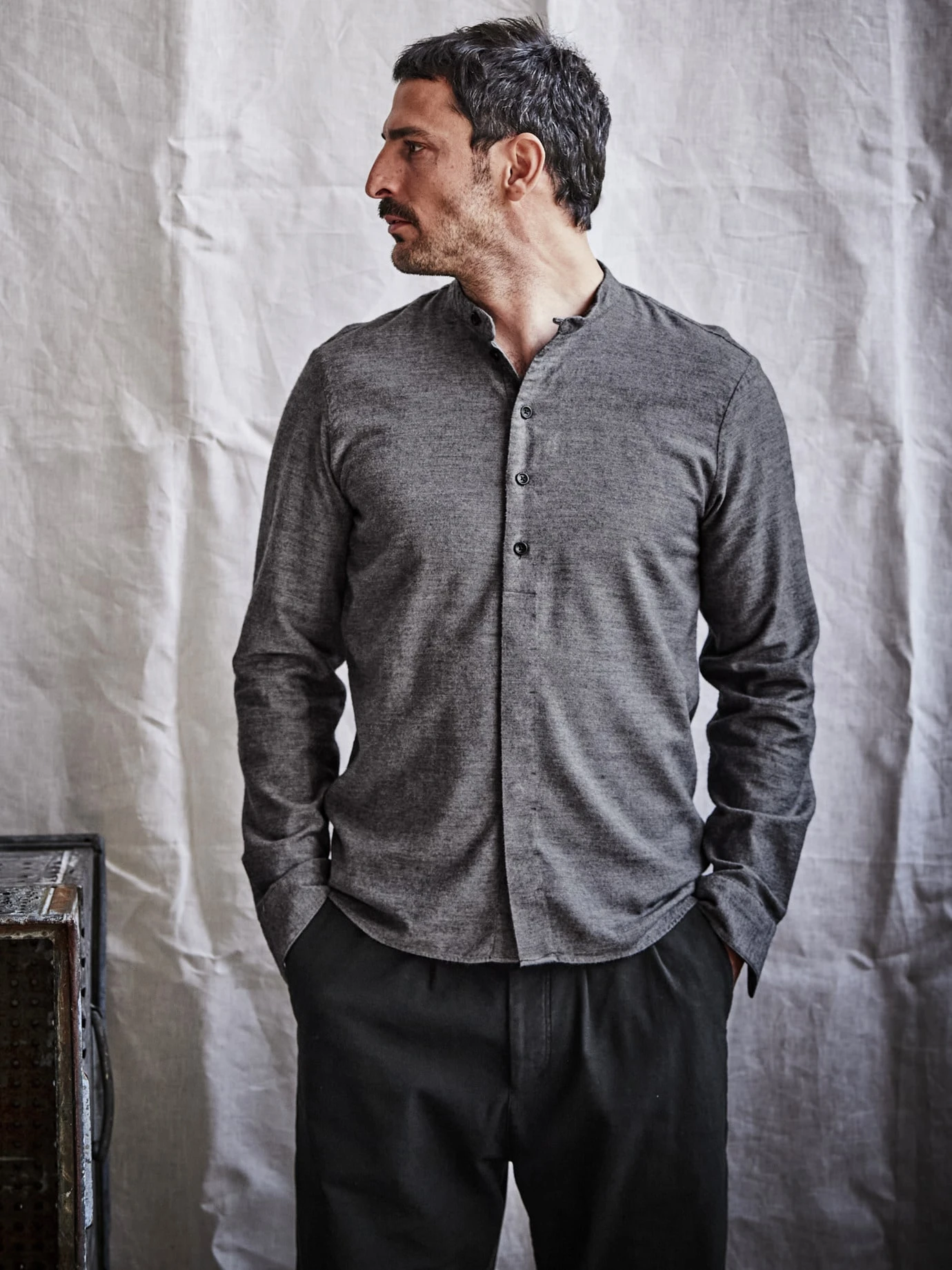 hannes trifft den richtigen Ton. Sophisticated, aufs Wesentliche fokussiert und in der stetigen Beachtung hochwertiger Materialien, um nur einige Dinge zu nennen, auf die der Freiburger Designer Wert legt. Bei diesem Hemd setzt er auf einen weichen, leicht angerauten Flanell in dicht gewebter Köperbindung. Die Basis ist dafür ein ordentlicher Anteil an weicher Baumwolle, den wärmenden Tarif liefert die Wolle. Verleiht Ihrem Outfit etwas sorgsam Ausgewähltes und zugleich Lässiges, möbelt die Denim auf und macht die schmale Stoffhose abendtauglich.