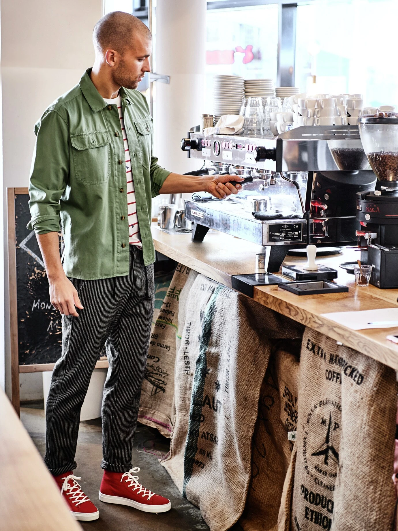 Straßenkult. Er trägt die Urform des Sneakers, mit fester Schnürung, wie ihn Basketballer seit Jahrzehnten schätzen. Natürlich mit hellabgesetzter Sohle, letztere ermöglicht noch immer leise Tritte, heute wird sie in Portugal in sogenannter Strobelmachart vernäht – so ist der Sneaker um Klassen stabiler als vergleichbare. Ansonsten noch immer aus strapazierfähigem Canvas, ein Hightech-Futter verpasst Ihrem Fuß die Belüftung. Endet knapp überm Knöchel und sieht sogar cool zu Shorts aus.