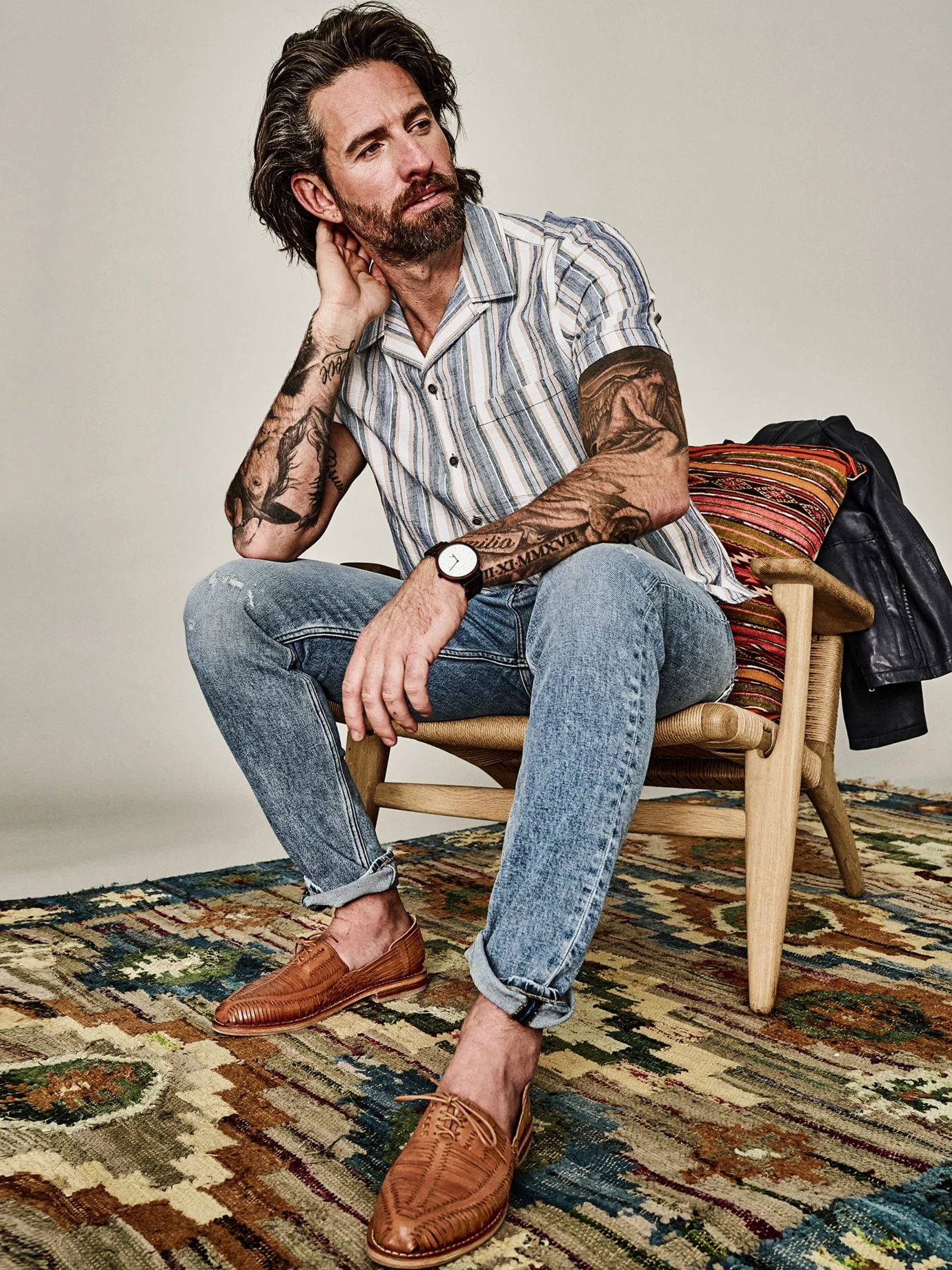 Gegensätzliche Kräfte am Werk. Aufrechte Streifenverläufe, sorgfältig eingewoben, sorgen hier für Ordnung. Gleichzeitig halten horizontale Knittereffekte vehement dagegen und lassen auf einen potenziell ungebügelten Stil schließen. Beides zusammen schafft genau die Spannung, aus der Charakter entsteht (und nie gebügelt werden muss). Passt zu Sommertagen, an denen nicht alles regelkonform sein muss. Und dann am besten zu Jeans und Ledersandalen oder Chino mit Sneakern.