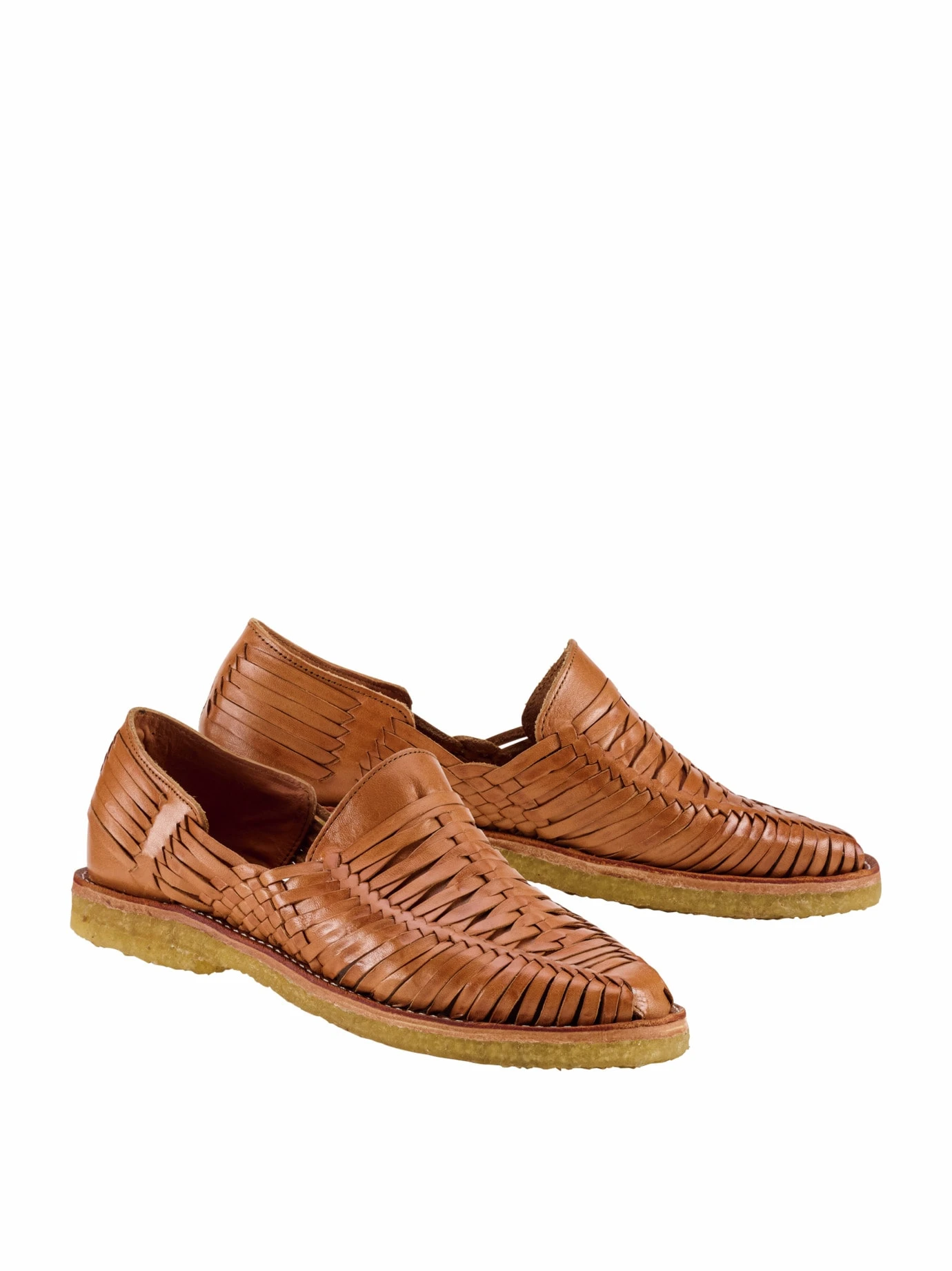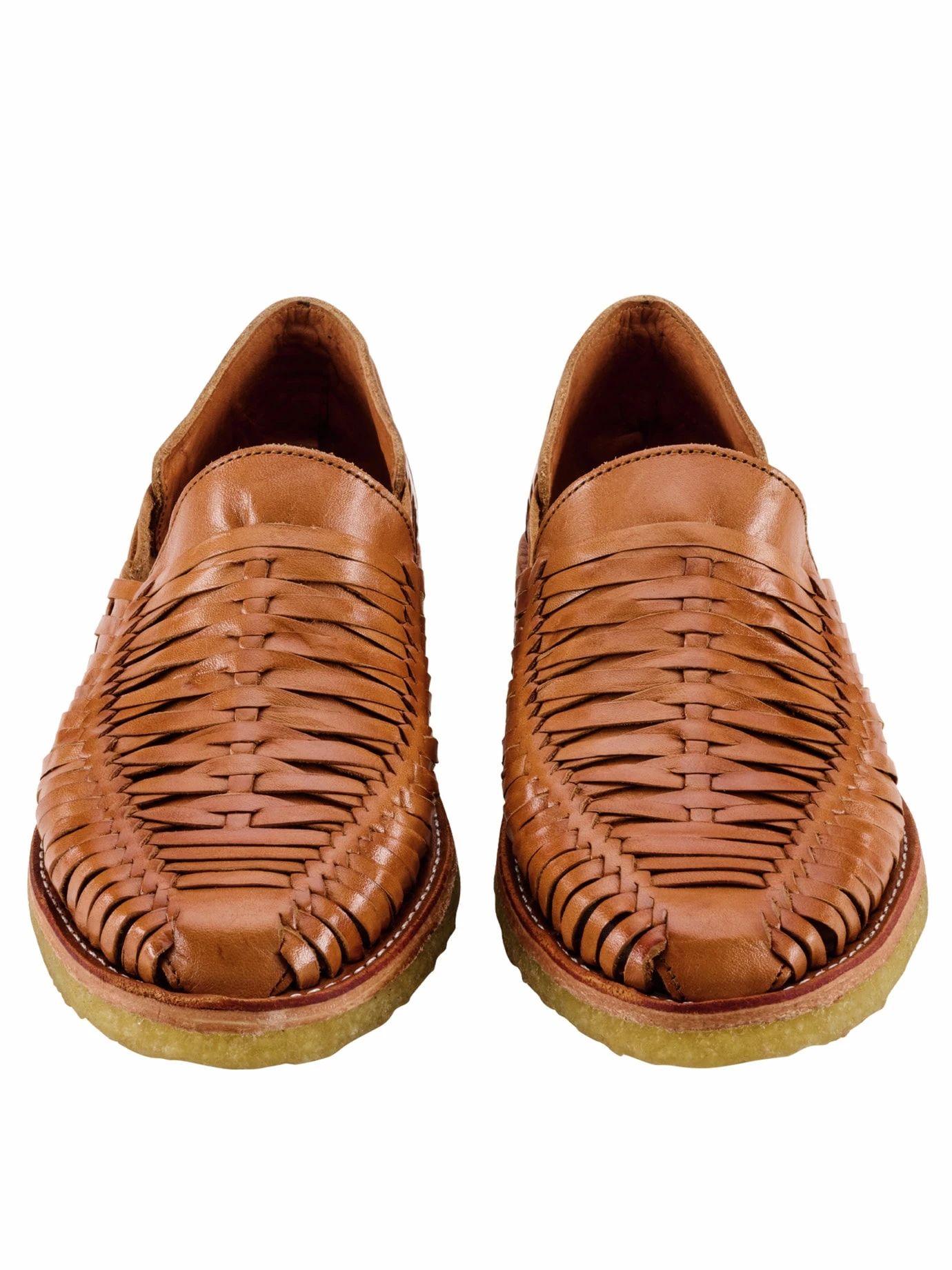 Von den Azteken verehrt. Ein echter Huarache, handgewebt in Mexiko. Bis zu vier Stunden nimmt das Spiel der Rindlederriemen (ein Bi-Produkt) in Anspruch. Durch die kleinen Spalten dringt Luft an den Fuß, typischerweise sitzt der Schuh zu Beginn eng – schon die Azteken mussten ihn eintragen – danach fühlt er sich an wie barfuß. Genauso tragen Sie ihn auch. Wie es der indigenen Tradition entspricht, ist die Sohle aus einem Naturkautschuk-Krepp, die mit doppelter Naht befestigt ist: macht den Schuh widerstandsfähig, langlebig und beim Abrollen flexibel.