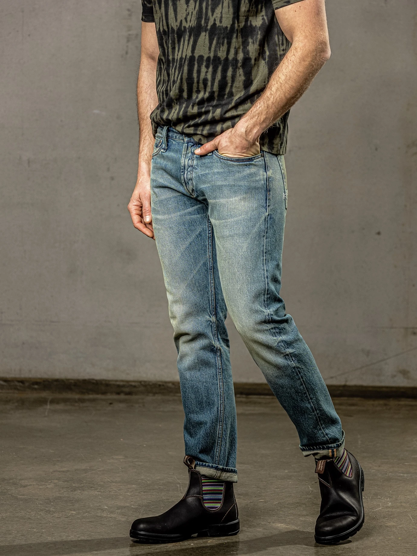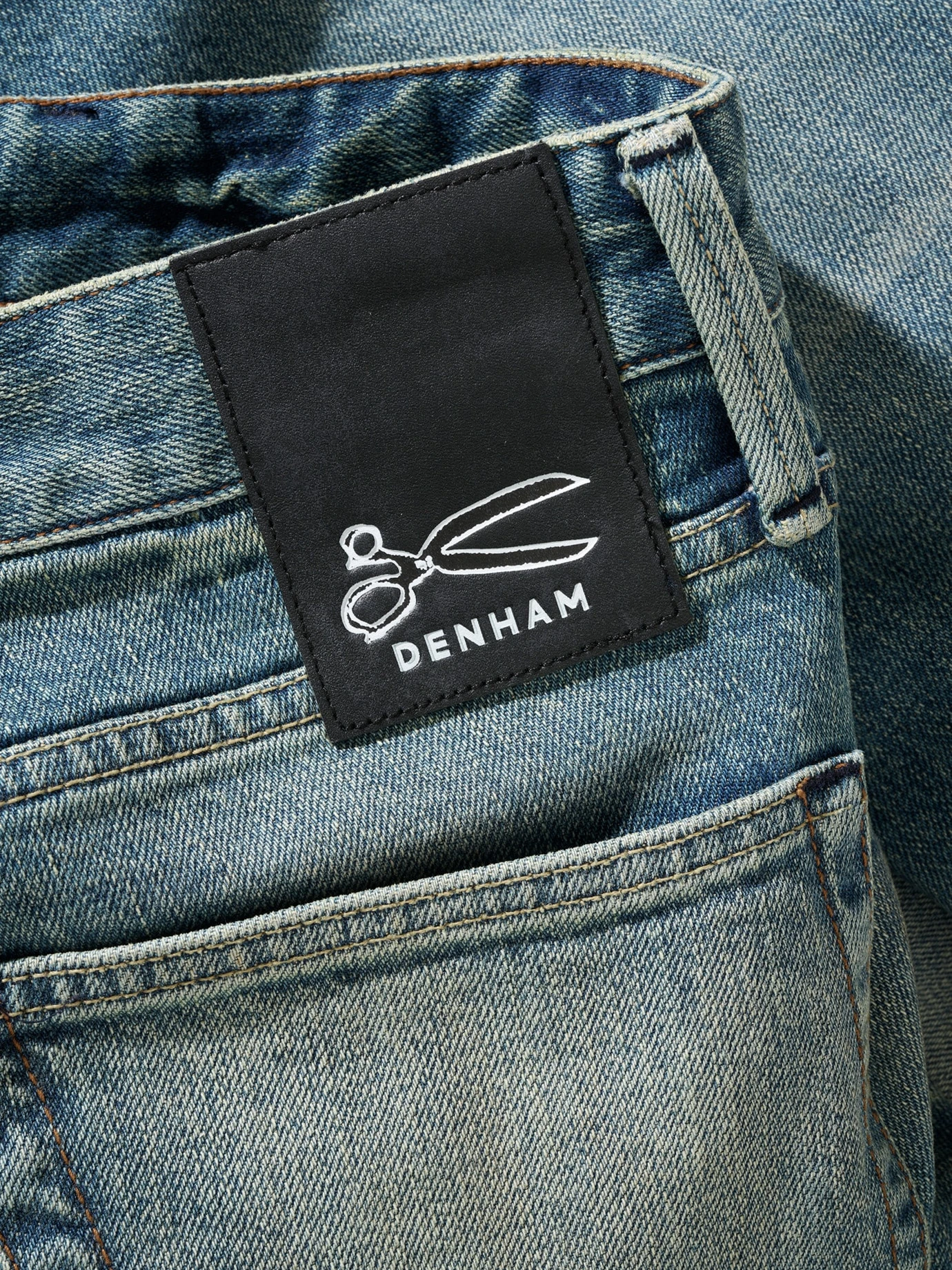 Mit 691 Stichen wird das Scheren-Logo auf eine DENHAM gestickt. Seit er in den 70er-Jahren seine erste Schneiderschere gekauft hat, ist Jason Denham von Jeans besessen. 2.000 Scheren und ein Label in Amsterdam später hat er Stoffe, Schnitte und Waschrezepturen zur Perfektion getrieben. Hier mit einer leicht grünlichen Waschung, die der Jeans die richtige Patina verleiht. Die Spur Elasthan macht den Denim merklich dehnbarer, der etwas lockerere, gerade Schnitt ist nach vielen Jeans-Jahren noch so bequem wie am ersten Tag.