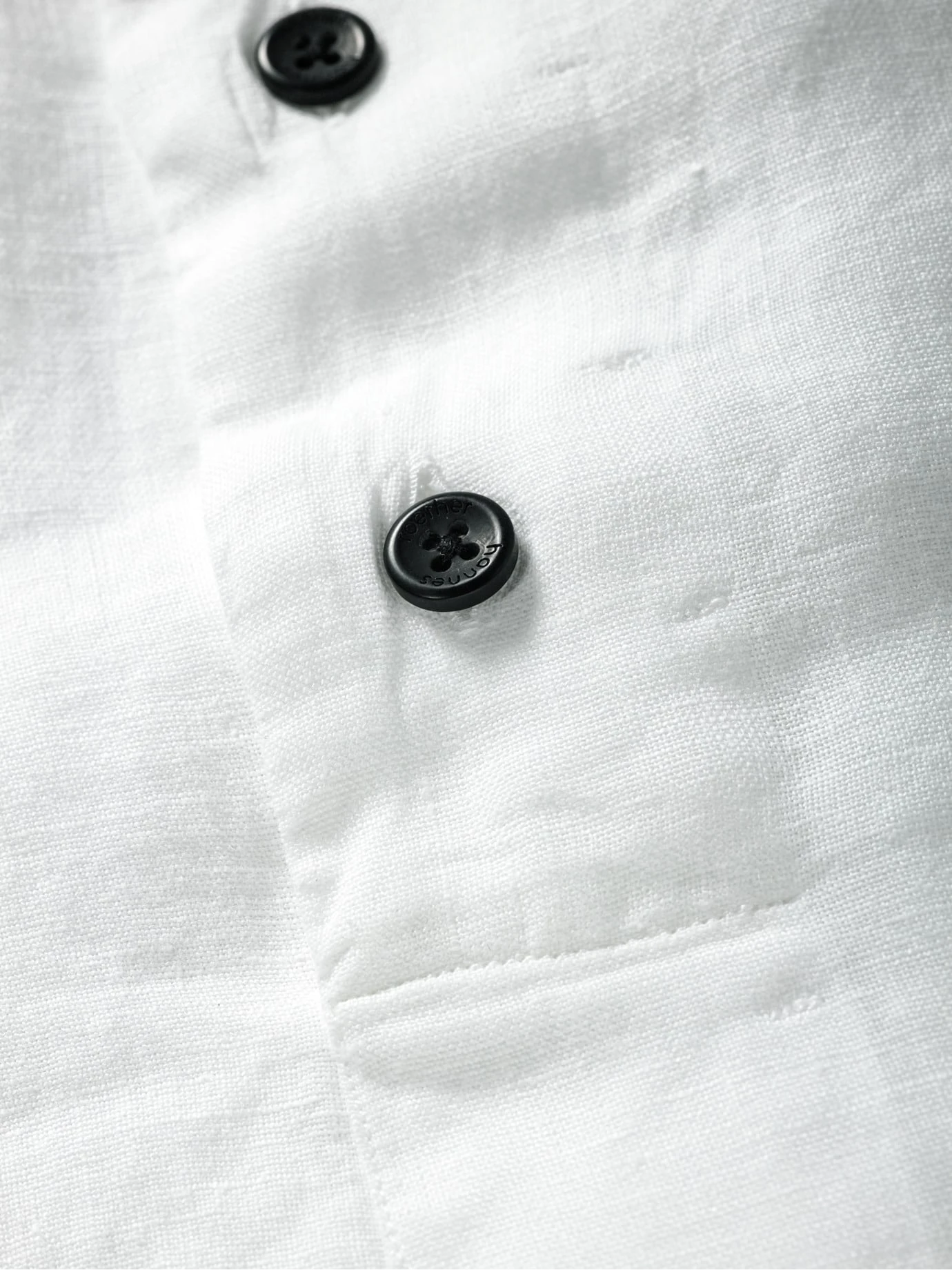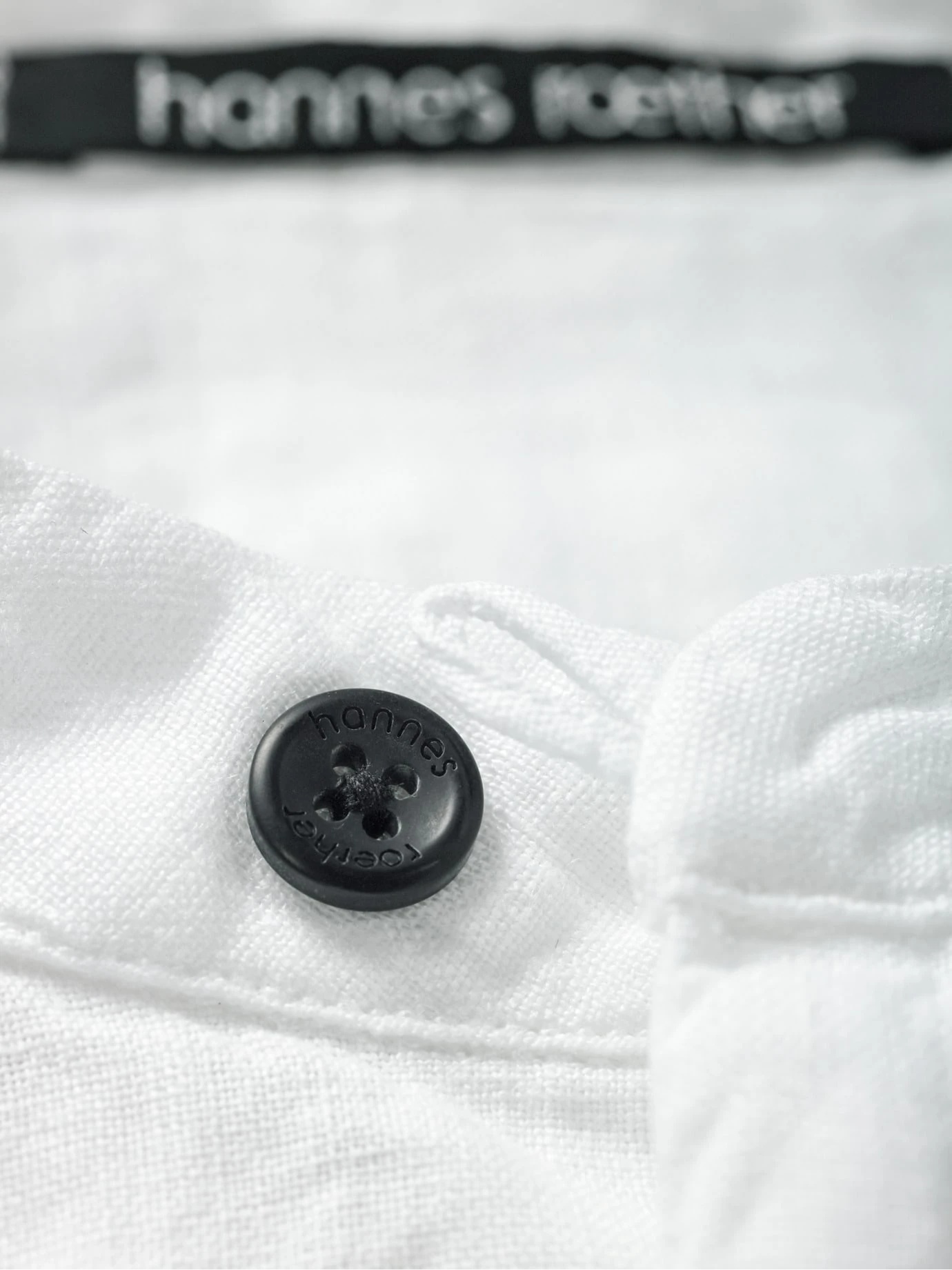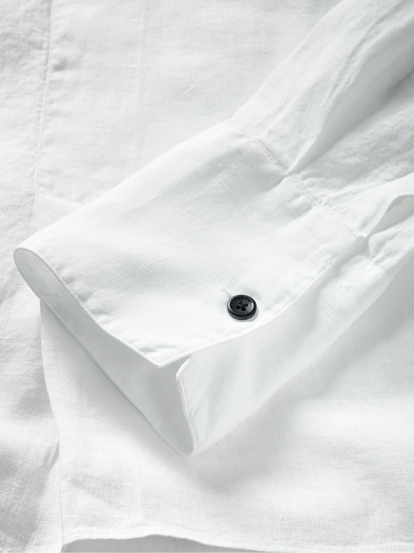 Leinenhemd mit Arbeiterästhetik. In diesem Hemd verarbeitet hannes roether gekonnt die Ursprünge des Hemdes. Geschätzt von den Männern, die vom Ertrag ihrer Hände Arbeit leben, kragenlos, dafür mit Knopfleiste und lockerem Schnitt, damit drin geschuftet werden kann. Neu ist sein unbeschriebenes Weiß und die gelebten, typischen Leinenknitter, dieses Maß Unbekümmertheit bei Hitze stammt aus Portugal. Dort würden sie das Hemd monochrom zu weißer Hose kombinieren, roether empfiehlt dunkle Hosen.