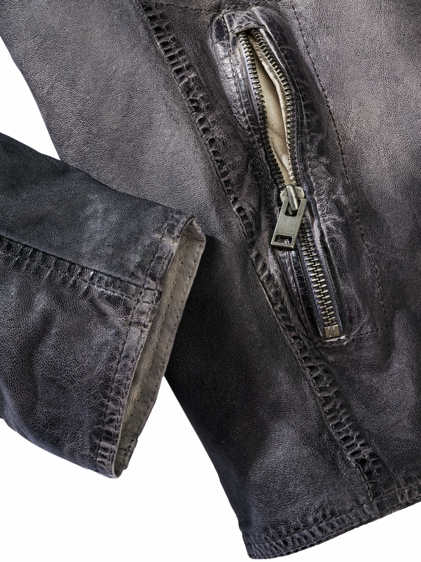 Weiches Lammnappa mit der Attitüde echten Lebens. Den Look erhält die fertig genähte Jacke durch eine Spezialfärbung – genau das Richtige für alle Fans des kernigen Biker-Stils, die sich sonst sattgesehen haben am typischen Uni-Ton klassischer Lederjacken. Passend dazu: die fetten Metallreißverschlüsse, der Druckknopf am Kragen, die solide Rückensteppung und die kernigen Nähte dort, wo sonst echte Protektoren sitzen. Stilecht in Grau-Grau-Kombinationen oder mit enger Jeans und derben Boots.