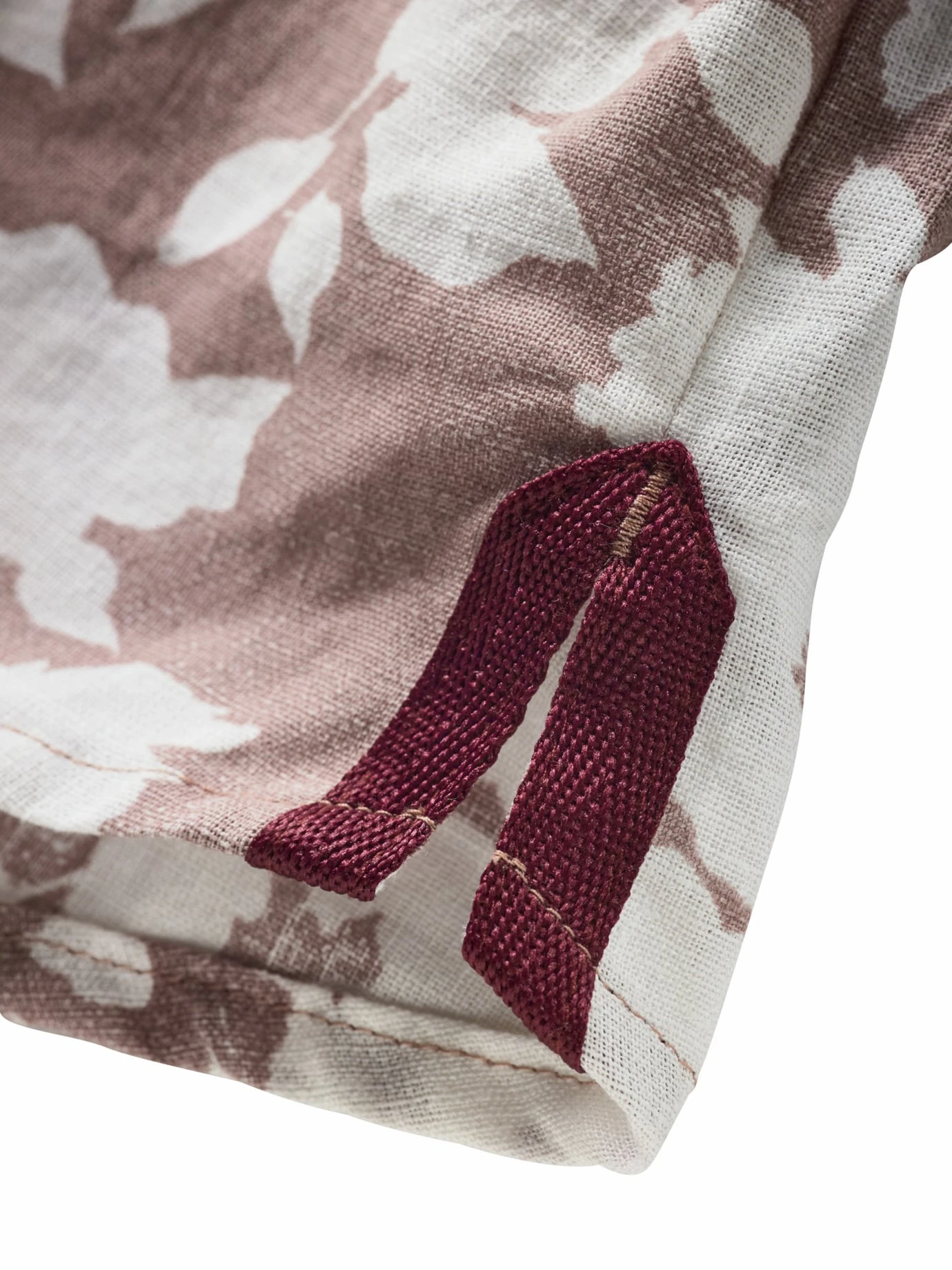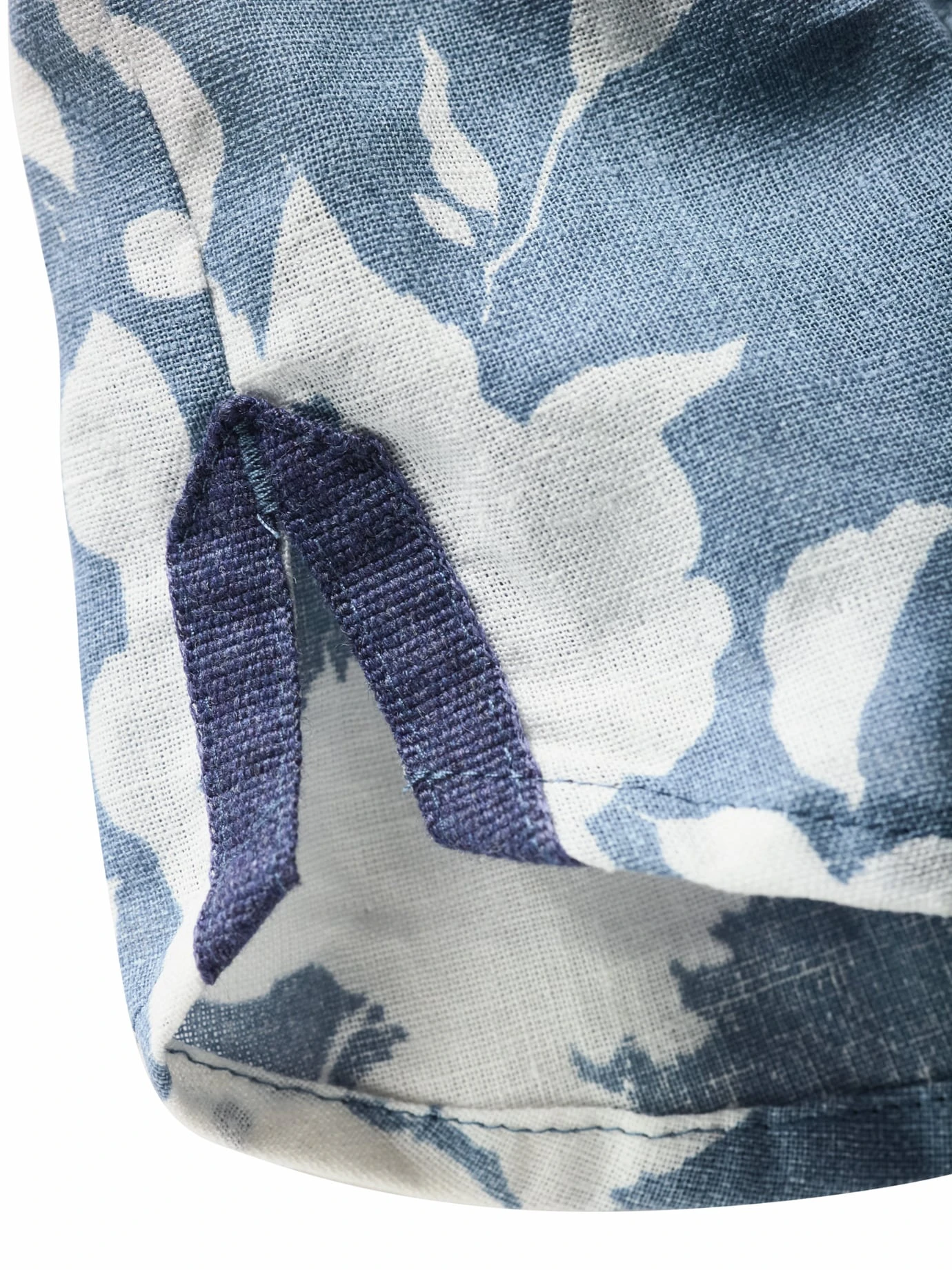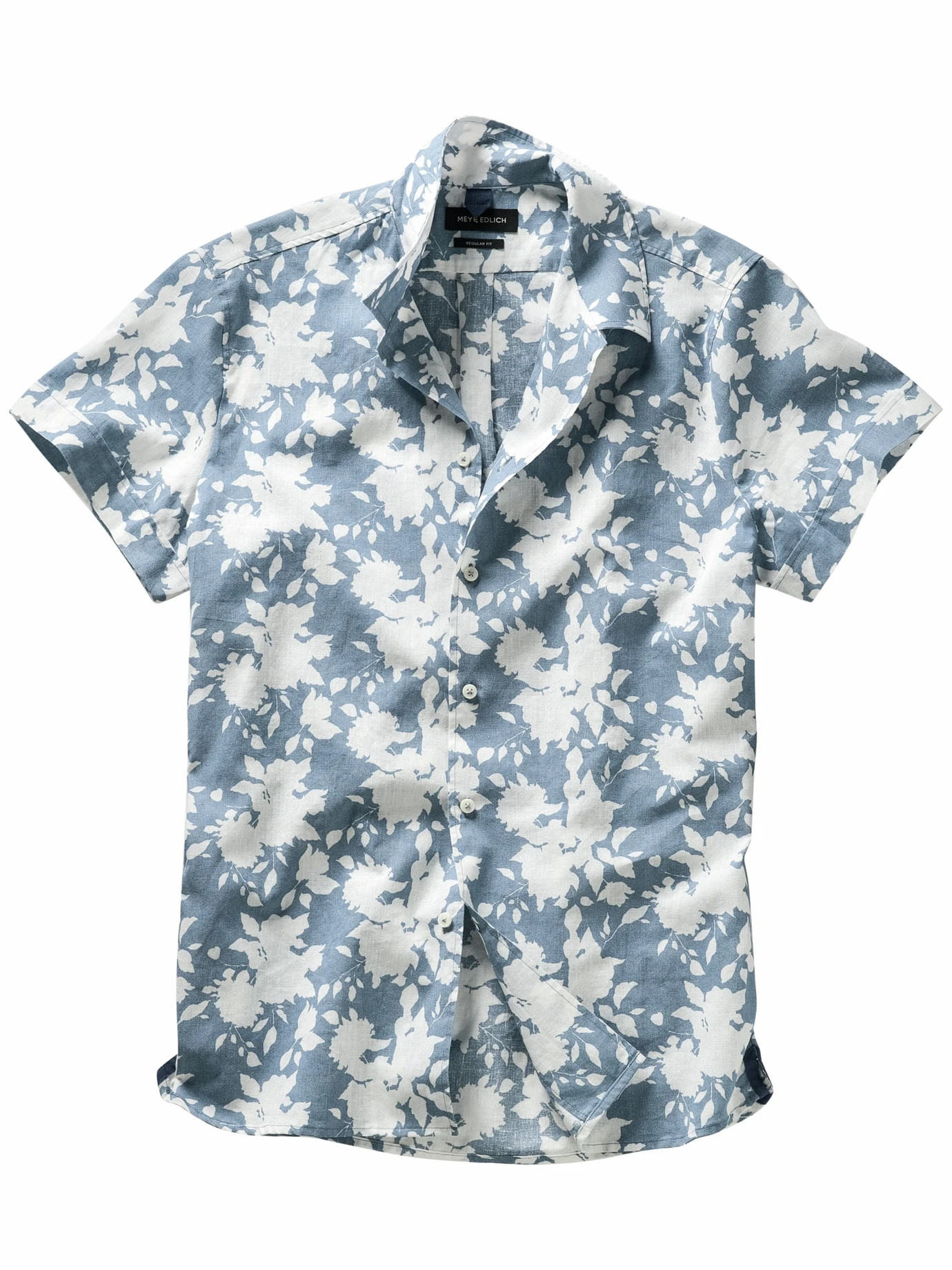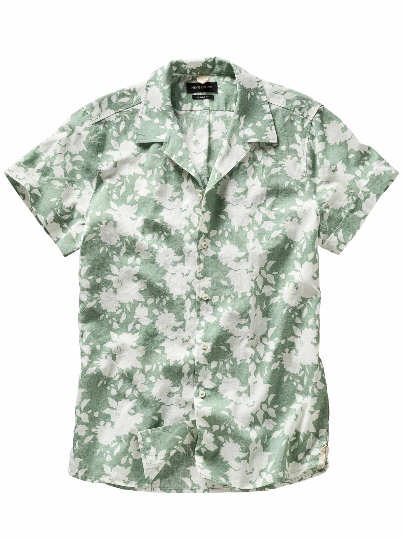 Ungewöhnlich unbunt. Mit seinen üppigen Blumen hätte es das Zeug zum Hawaii-Klassiker. Doch der Verzicht auf den Farbflash macht das Shirt zu einer besonderen Erscheinung: eigenwillig, reduziert, schlicht schön. Das Fehlen der Farben lenkt die Aufmerksamkeit auf die leicht rauen, leinentypischen Unregelmäßigkeiten, die den Charakter dieses Shirts ausmachen. Das Blumenmuster ist übrigens nicht geprintet, sondern à la Tintenkiller aus dem bedruckten Stoff herausgelöscht.