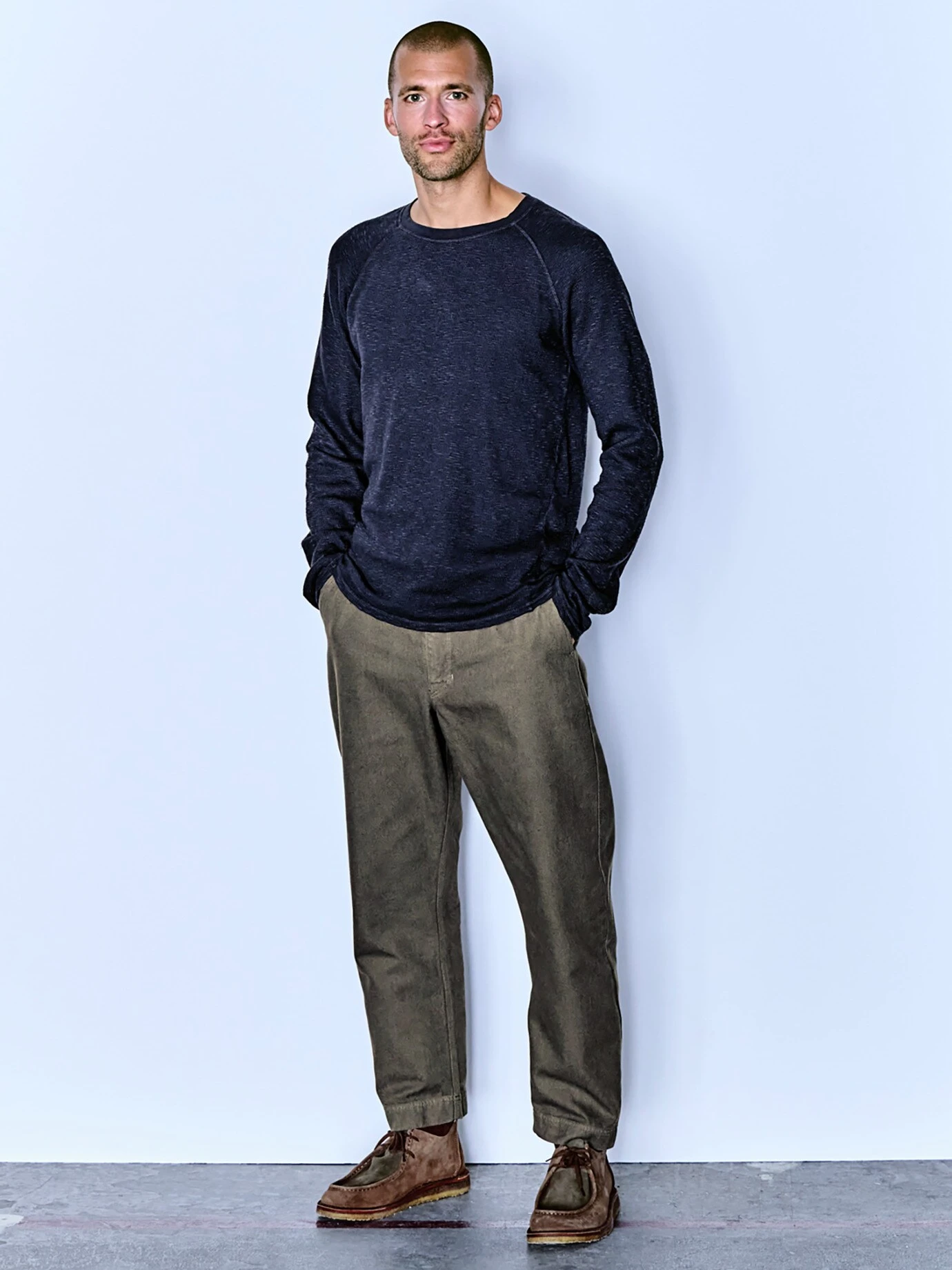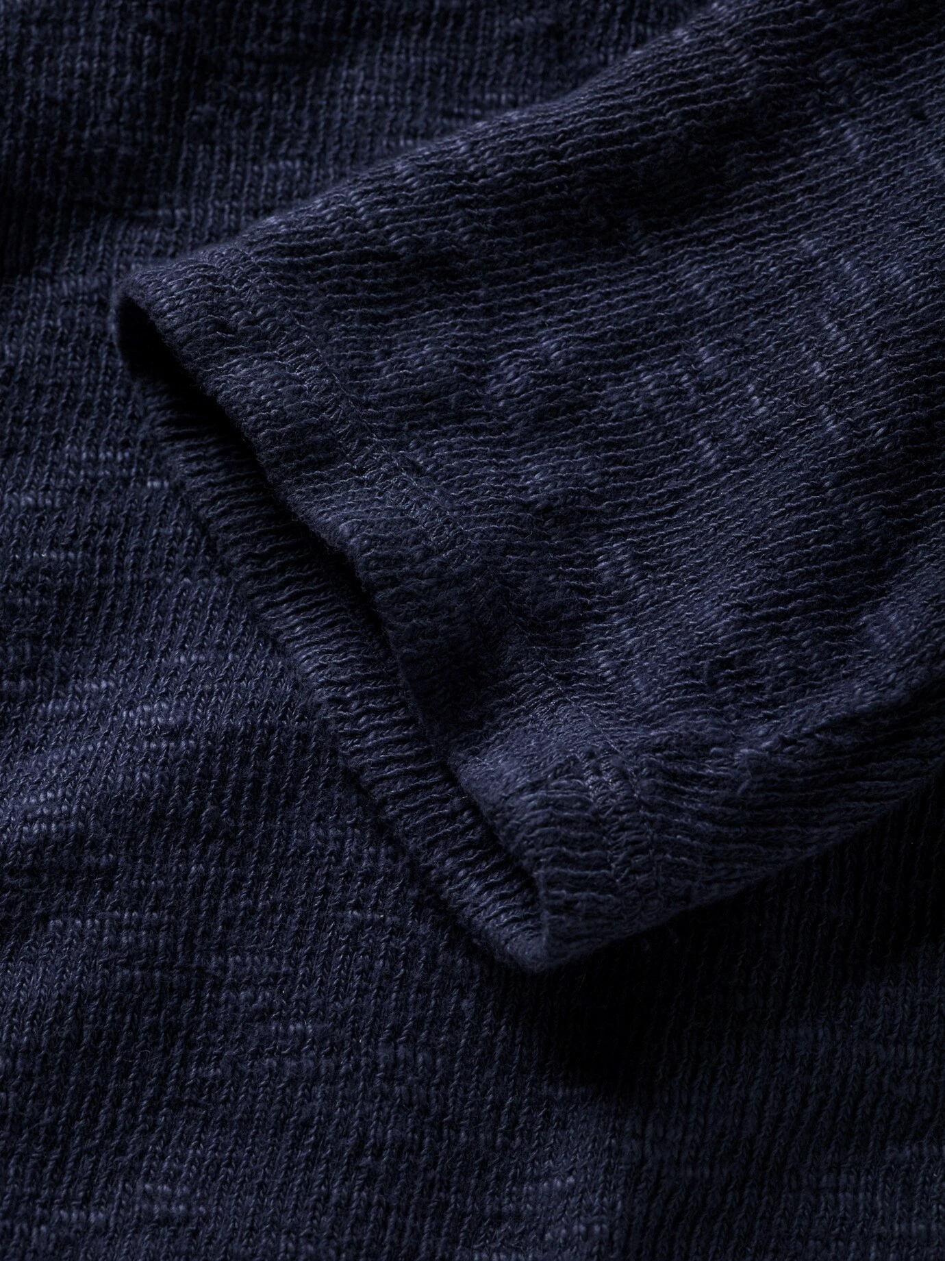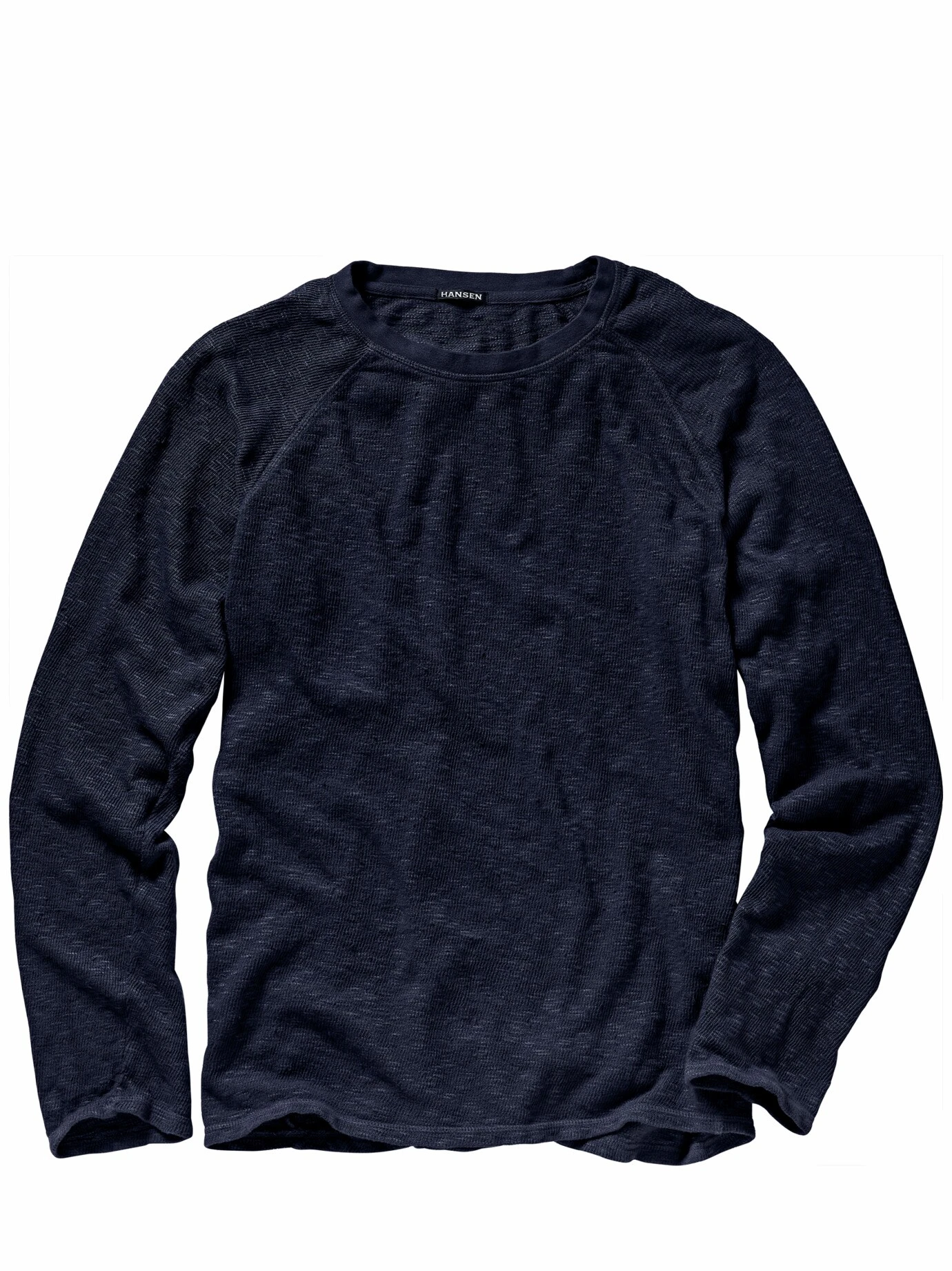 Angenommen Sie hätten Platz für ein Longsleeve, Felix wäre eine gute Wahl. Auf den ersten Blick beeindruckend schlicht, nichts lenkt ab. Einmal angezogen überzeugt der weiche Baumwolljersey, der eine feine Struktur aufweist und nie so ganz platt auf der Haut liegt. Theoretisch könnten Sie darunter den Hemdkragen hervorblitzen lassen, macht sich aber auch solo gut. Mit Raglanärmeln, damit Sie sich gut in ihm bewegen können (übrigens: optisch verbreitern sie das Kreuz minimal).