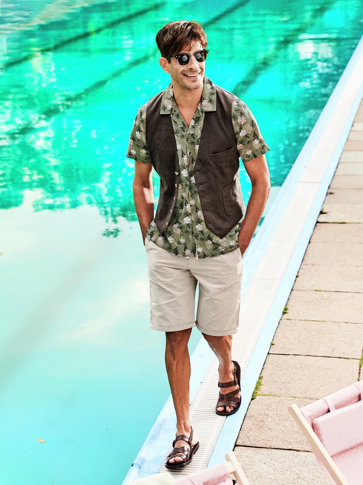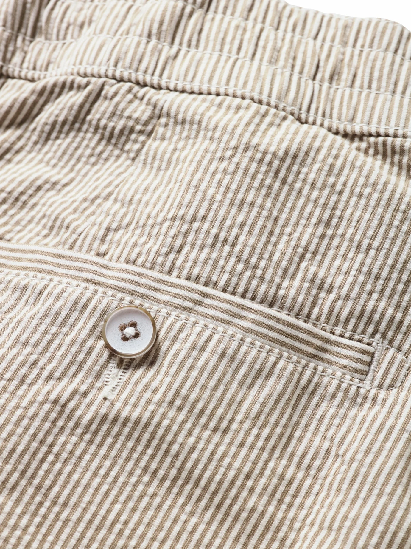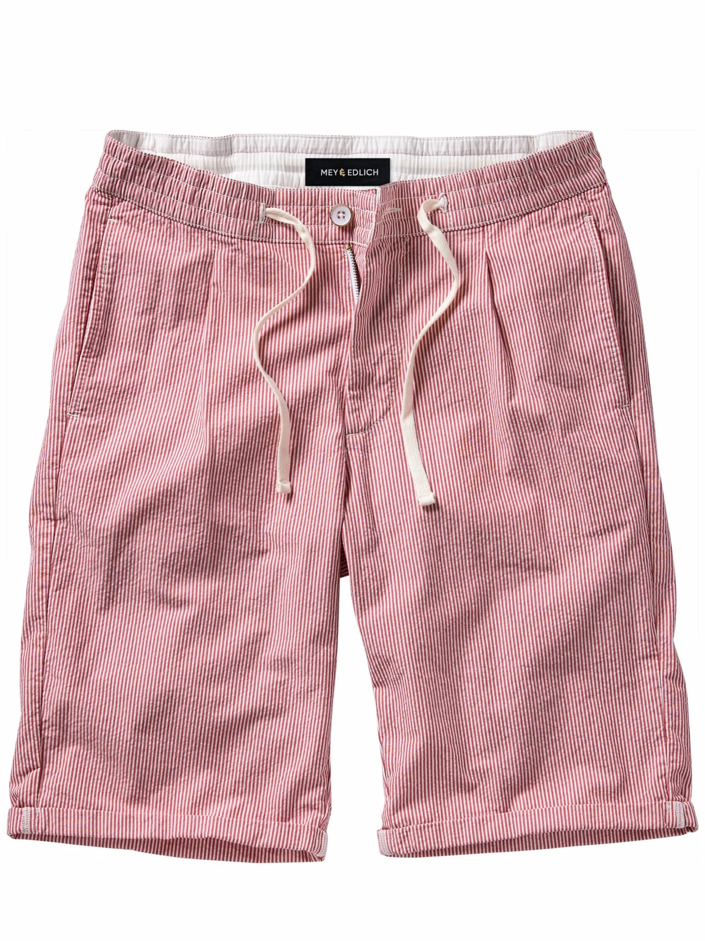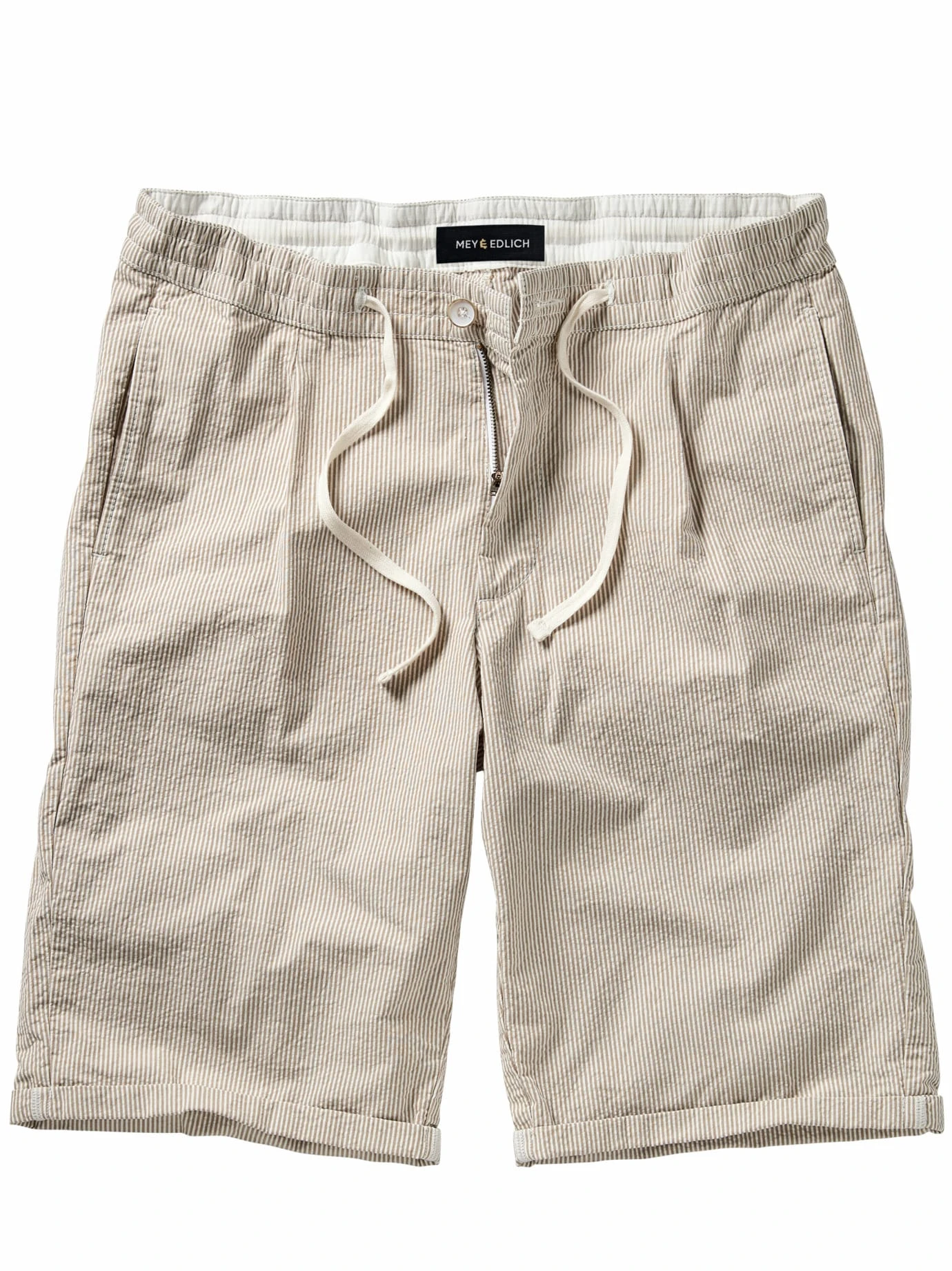 Hält der Hitze New Orleans stand. Als Klimaanlagen noch in weiter Ferne und Leinen für Geschäftsmänner zu knittrig aussah, trugen die Gentlemen einen Krinkelstoff. Gemeint ist damit Seersucker, jener Sommerstoff mit der leicht gekräuselten Struktur, die das Gewebe besonders atmungsaktiv macht, nie flach auf der Haut liegt und bei Bewegung Luft zirkulieren lässt. Ikonisch fein gestreift, so haftet ihm noch immer das sympathische Südstaaten-Image an. Zusätzlich ist bei dieser Shorts der Schnitt bequem, vor allem dank des an Jogginghosen erinnernden Tunnelzugs. Am schönsten mit weißem Shirt und blauem Sakko, sonst aber auch mit Hemd, Sneaker oder Sandale.