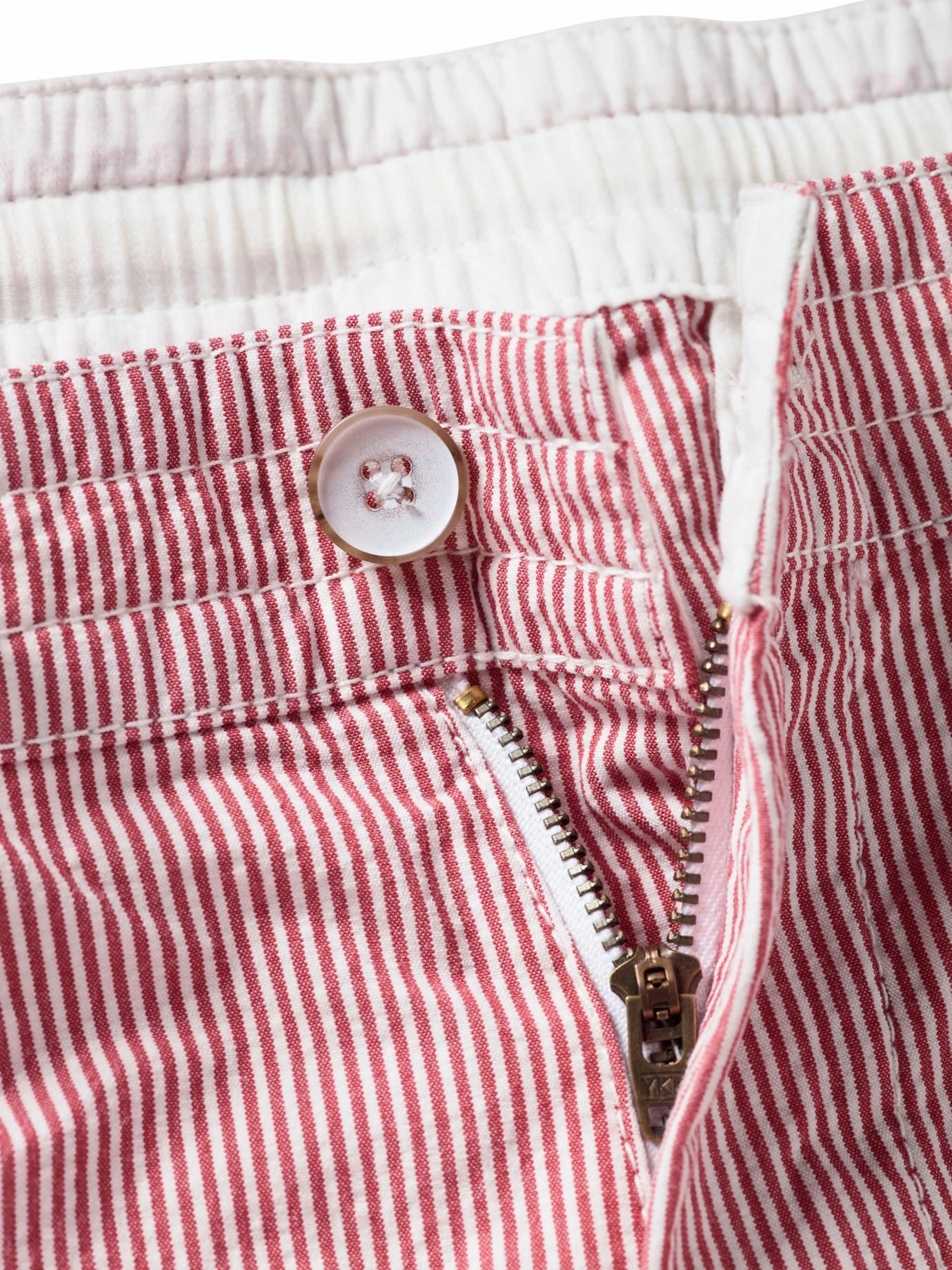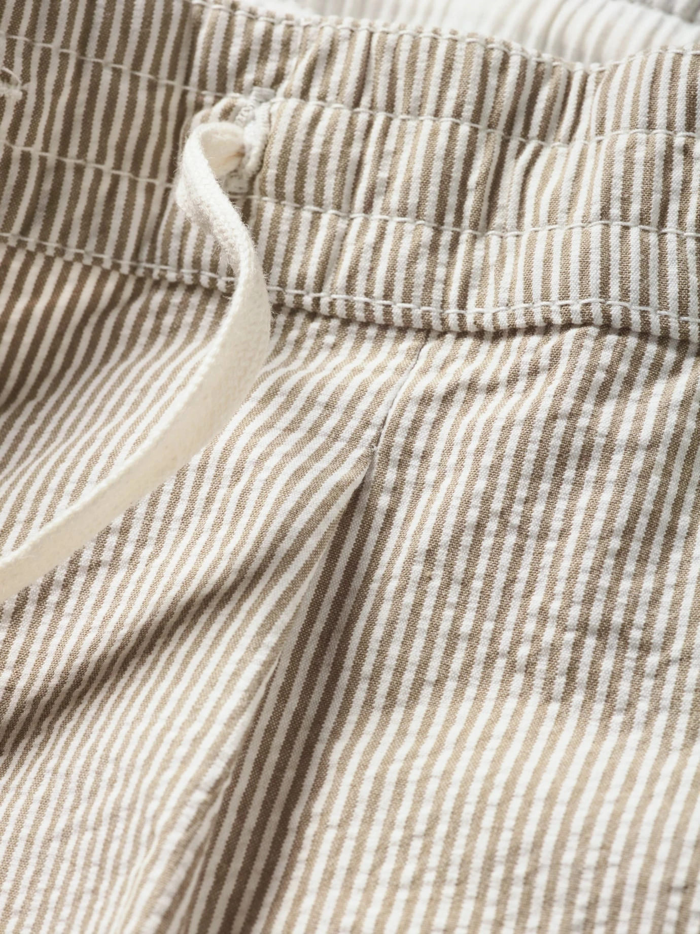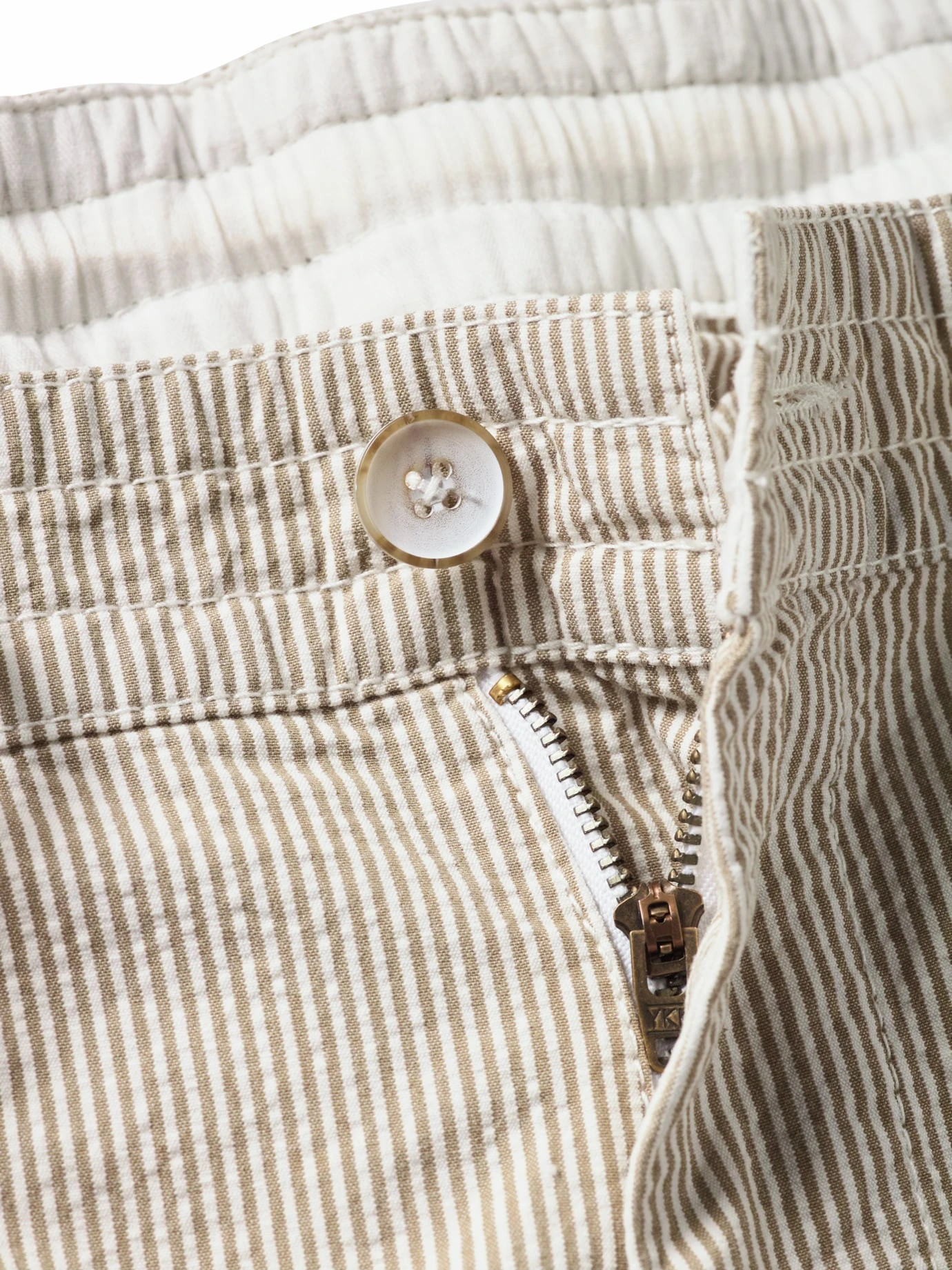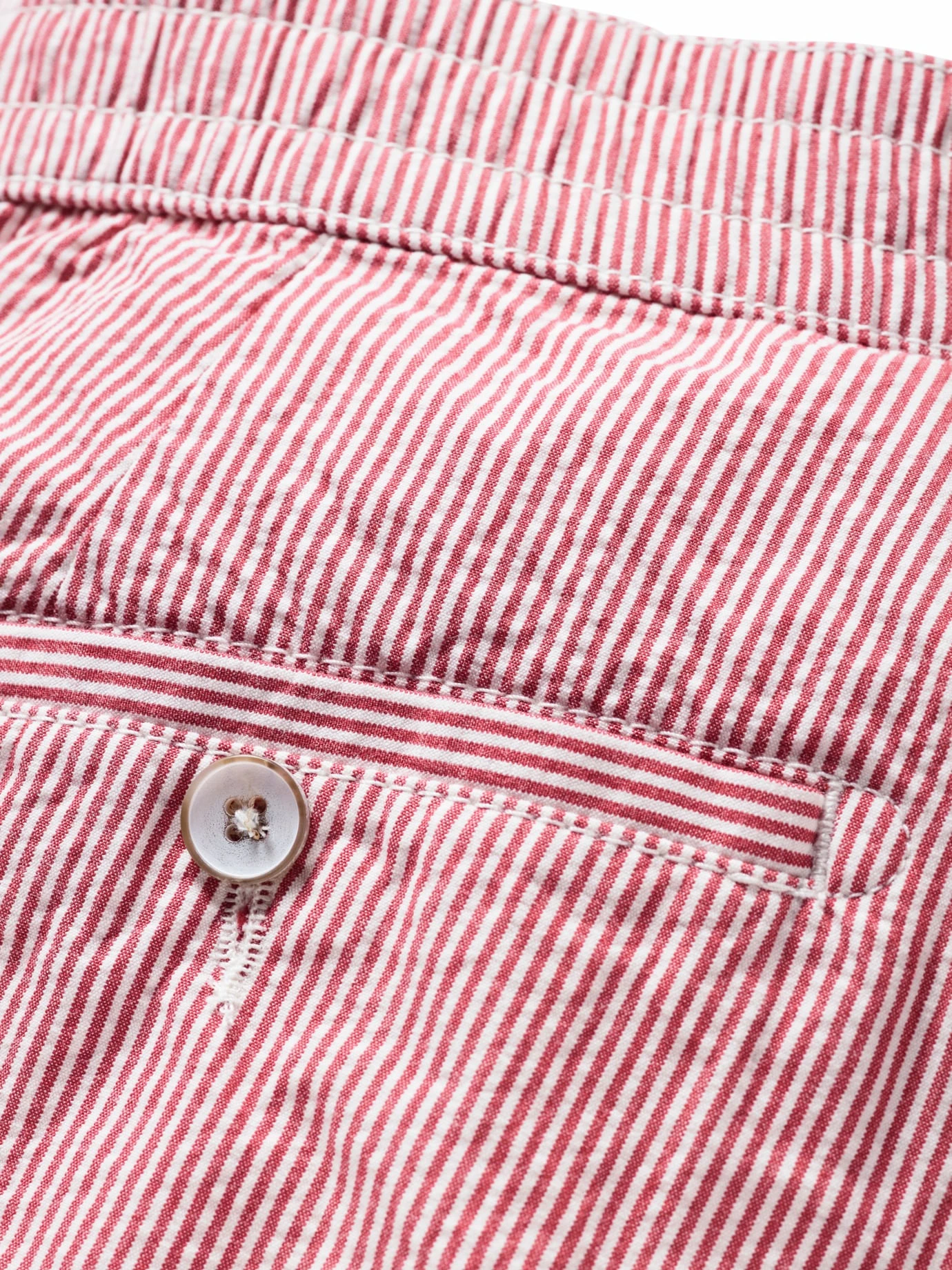 Hält der Hitze New Orleans stand. Als Klimaanlagen noch in weiter Ferne und Leinen für Geschäftsmänner zu knittrig aussah, trugen die Gentlemen einen Krinkelstoff. Gemeint ist damit Seersucker, jener Sommerstoff mit der leicht gekräuselten Struktur, die das Gewebe besonders atmungsaktiv macht, nie flach auf der Haut liegt und bei Bewegung Luft zirkulieren lässt. Ikonisch fein gestreift, so haftet ihm noch immer das sympathische Südstaaten-Image an. Zusätzlich ist bei dieser Shorts der Schnitt bequem, vor allem dank des an Jogginghosen erinnernden Tunnelzugs. Am schönsten mit weißem Shirt und blauem Sakko, sonst aber auch mit Hemd, Sneaker oder Sandale.