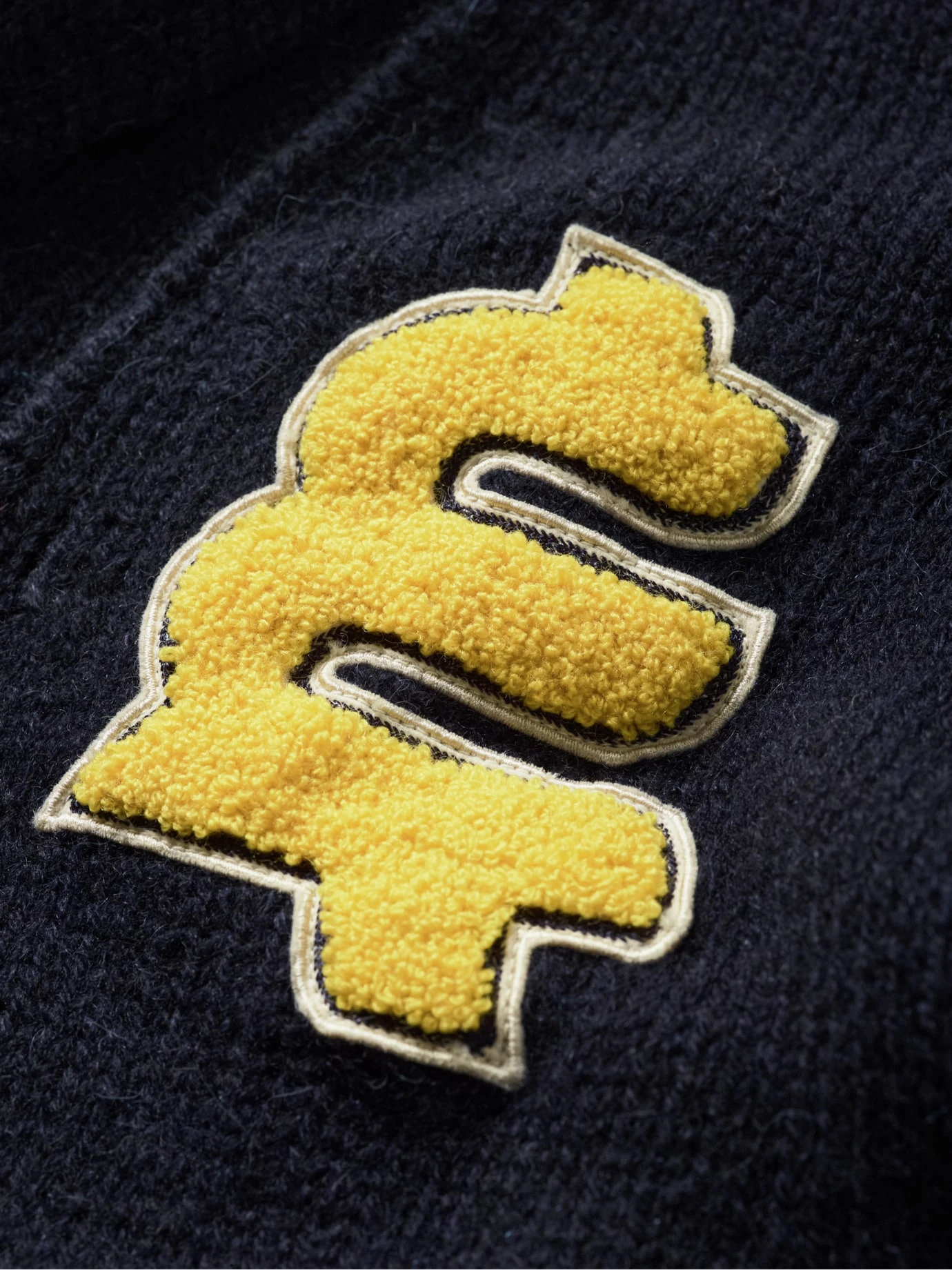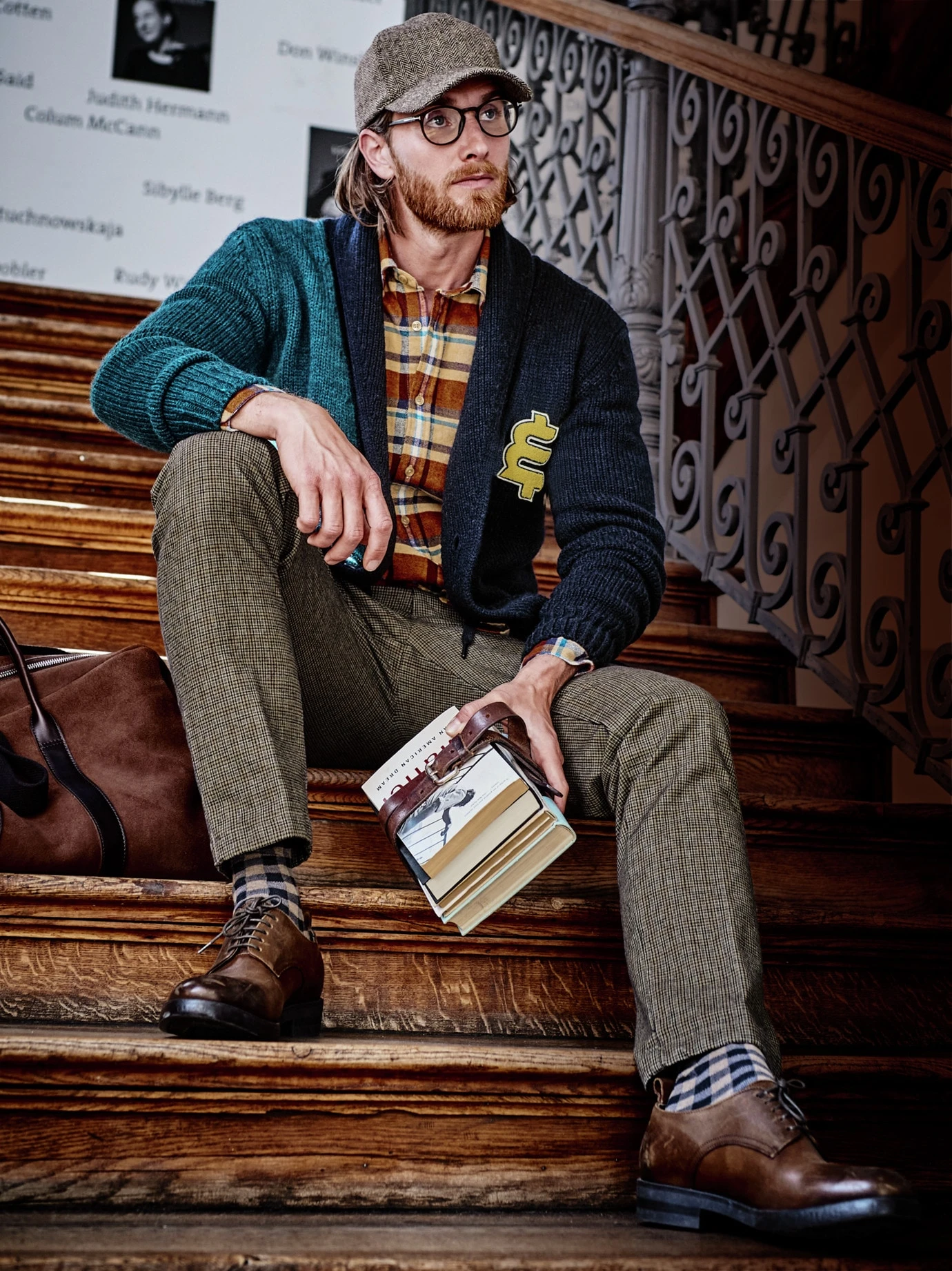 Campus-Look auf Mey & Edlich-Art: Anders als im Ursprung kommt er nicht wuchtig, sondern eher smart als Cardigan daher. Ansonsten hat er das, was den Collegestil ausmacht: Der fette Frottee-Buchstabe auf der Brust ist unser Signet, die dosierten Akzentstreifen entsprechen seinem sportlichen Ursprung. Gestrickt in Italien mit viel Alpakawolle, die ihn wintertauglich macht, durchs Hightech bleibt er pfleglich in der Wäsche. Farblich zweigeteilt, perfekt zu nahezu jeder Denim-Waschung.