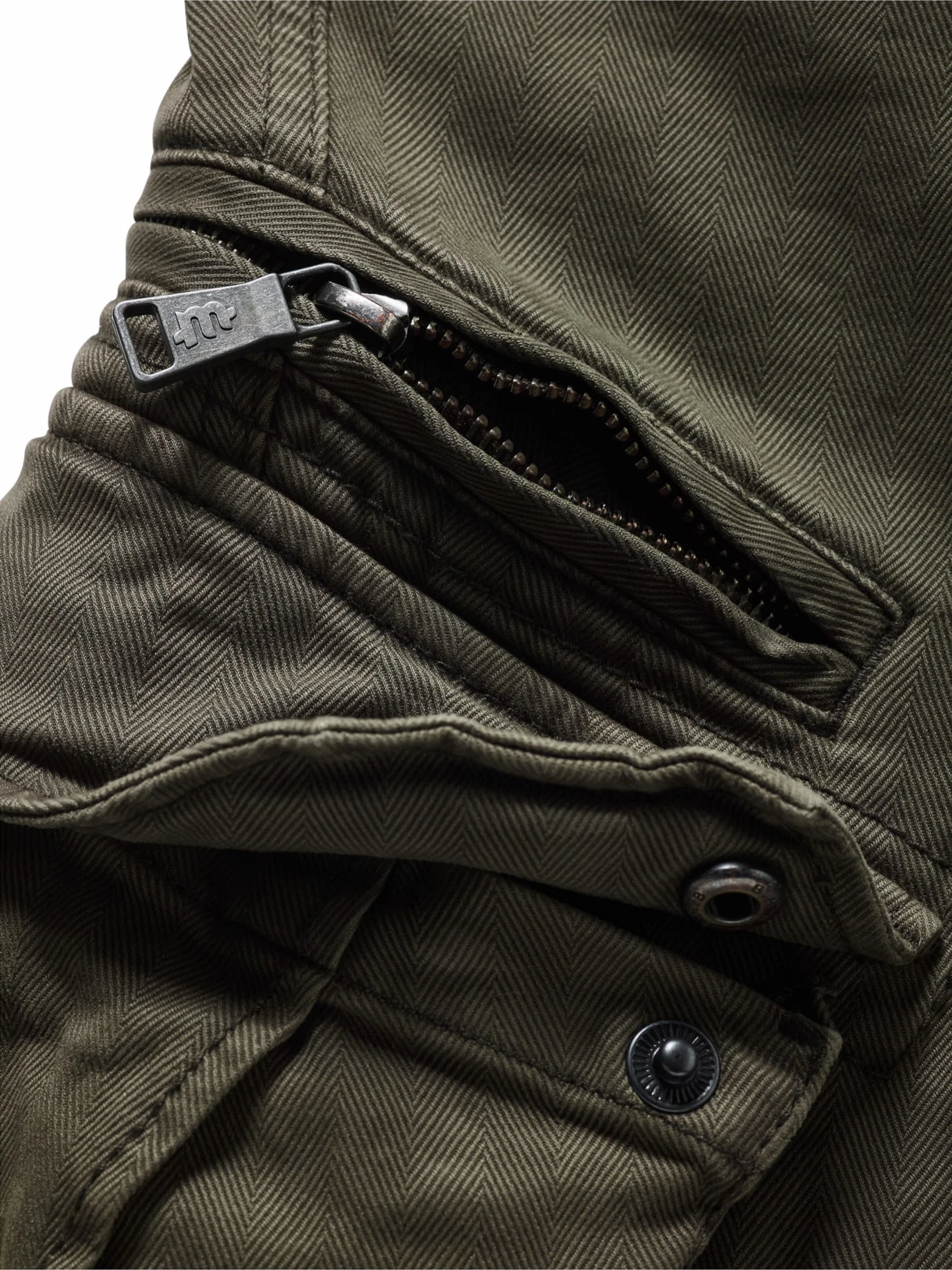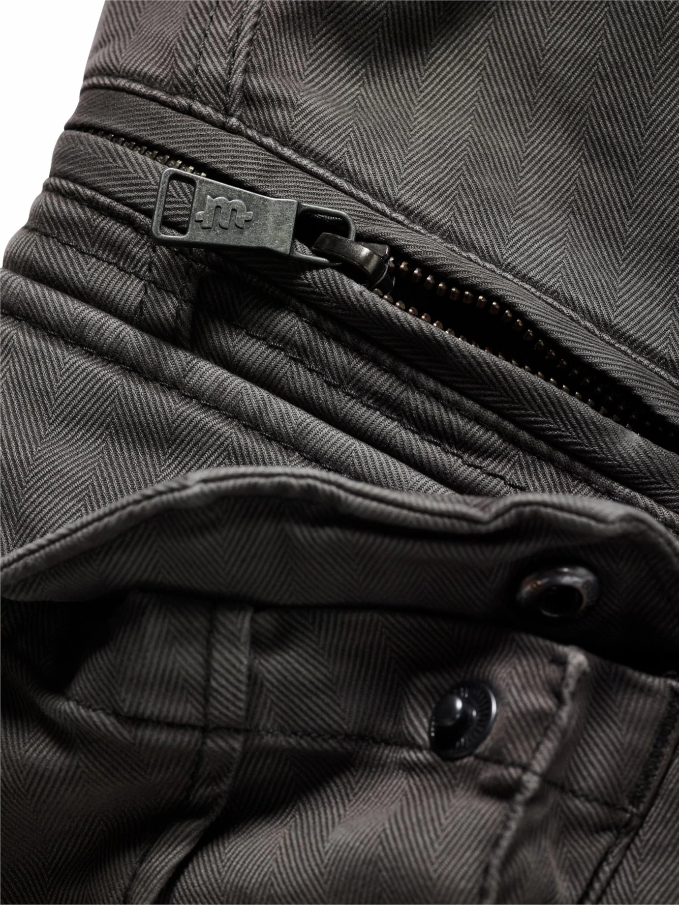 Irgendwas ist immer. Die Cargo für Männer der Tat. Der vorgewaschene italienische Baumwollstoff mit Fischgratmuster sieht aus, als wäre er schon länger im Einsatz. Stauraum-Taschen für Arbeitshandschuhe und Multi-Tool. Workwear-inspirierte Details: Abnäher am Knie und Druckknöpfe an den Gesäßtaschen (damit in der Aktion nichts rausfällt). Gut kombiniert mit Hemd oder Longsleeve, Weste optional.