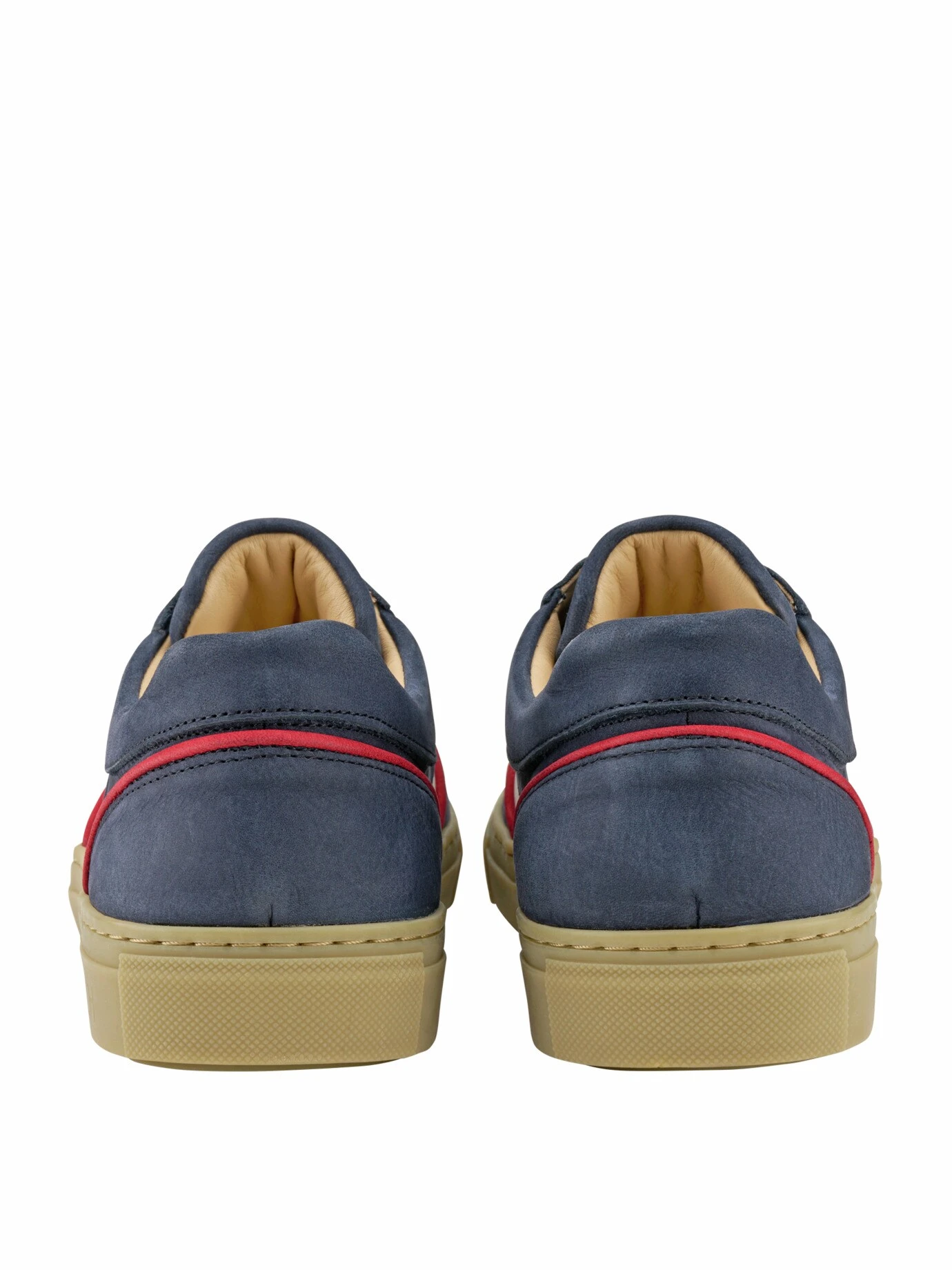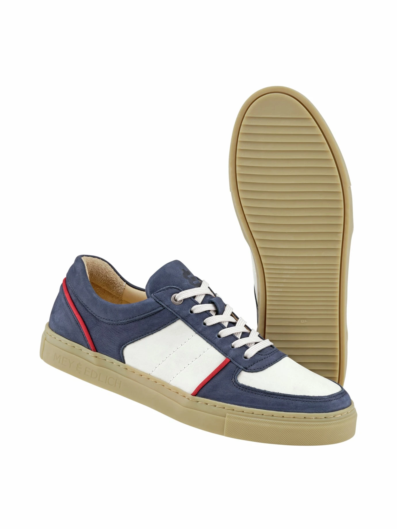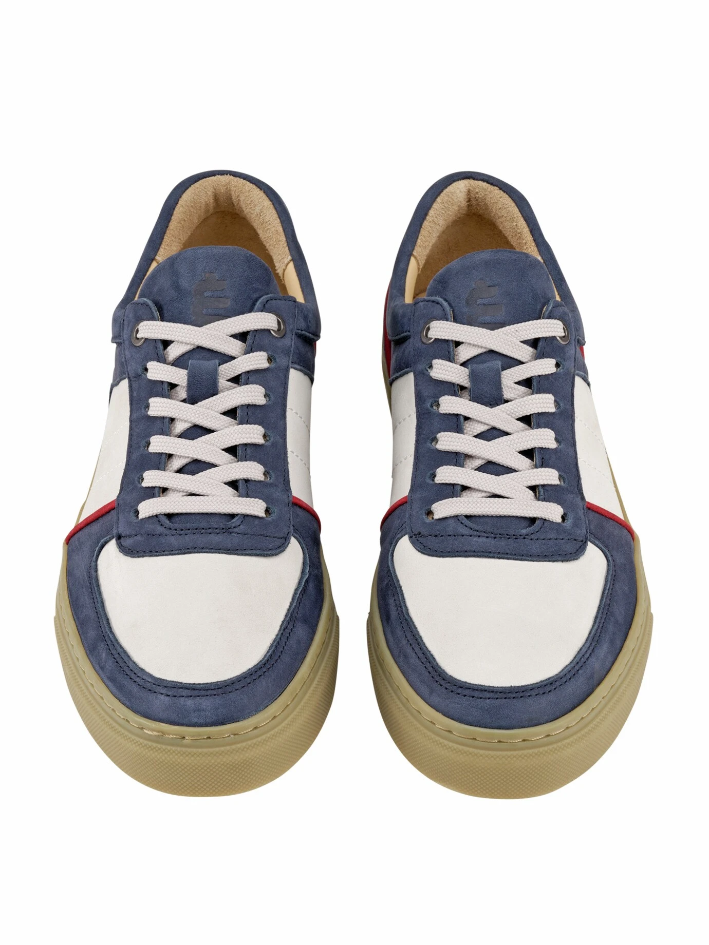 Ein Sneaker der 2000er. Die breite Form und die unempfindliche Sohle erinnern an Skateschuhe, wie sie in den 2000er Jahren getragen wurden. Wie damals auch, darf das aber auch fernab des Skateparks geschehen. Schöne Farbkombination aus Blau, Weiß und Rot und dem Honigton der Sohle.