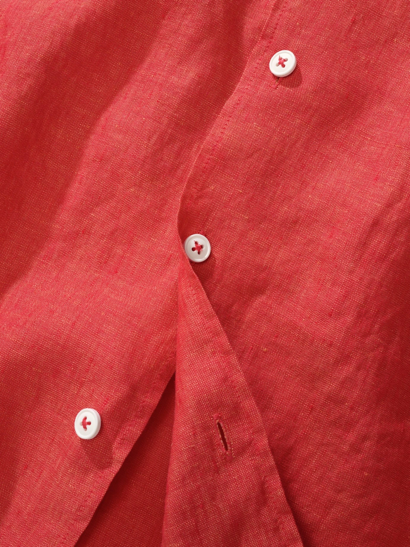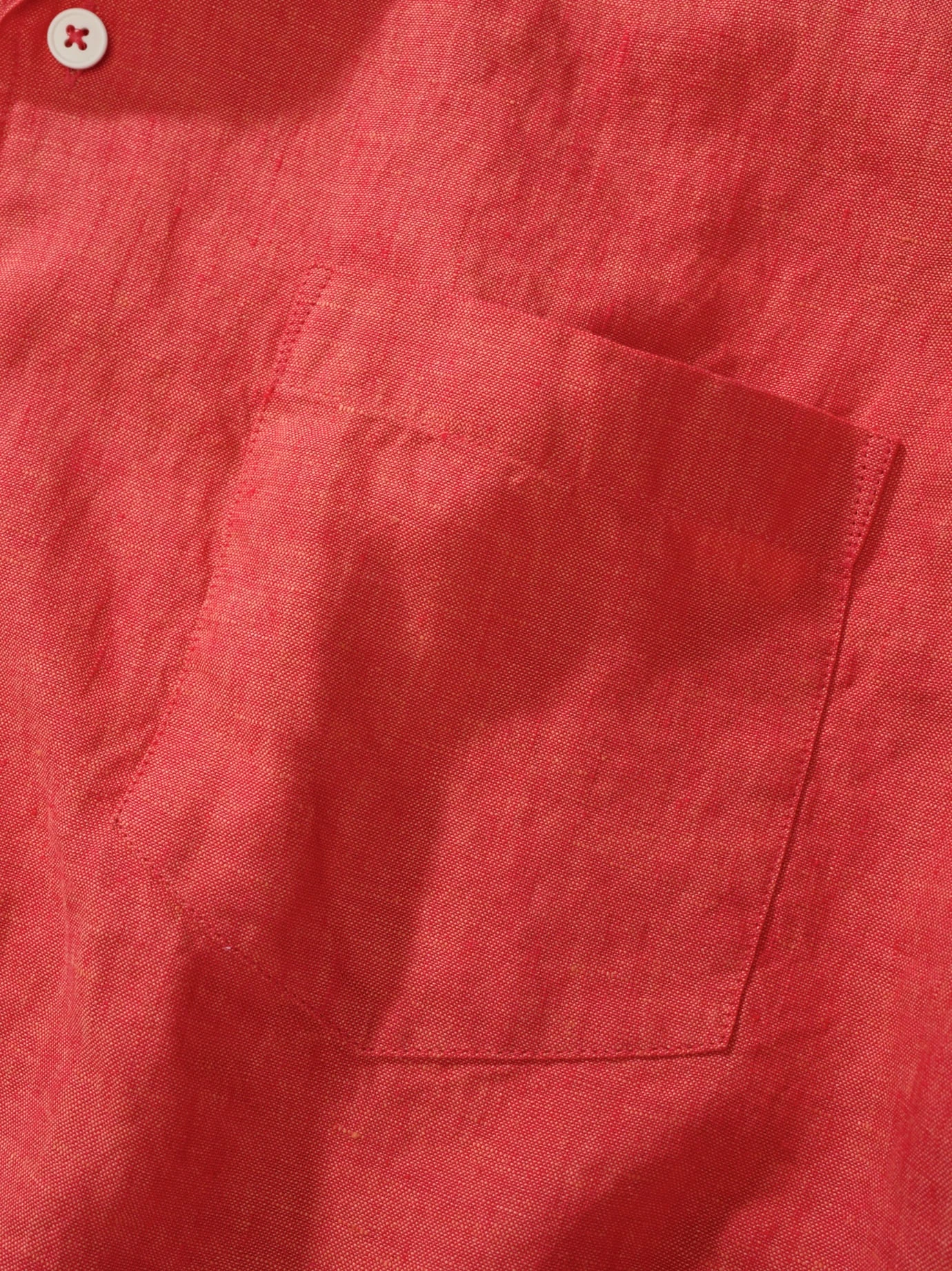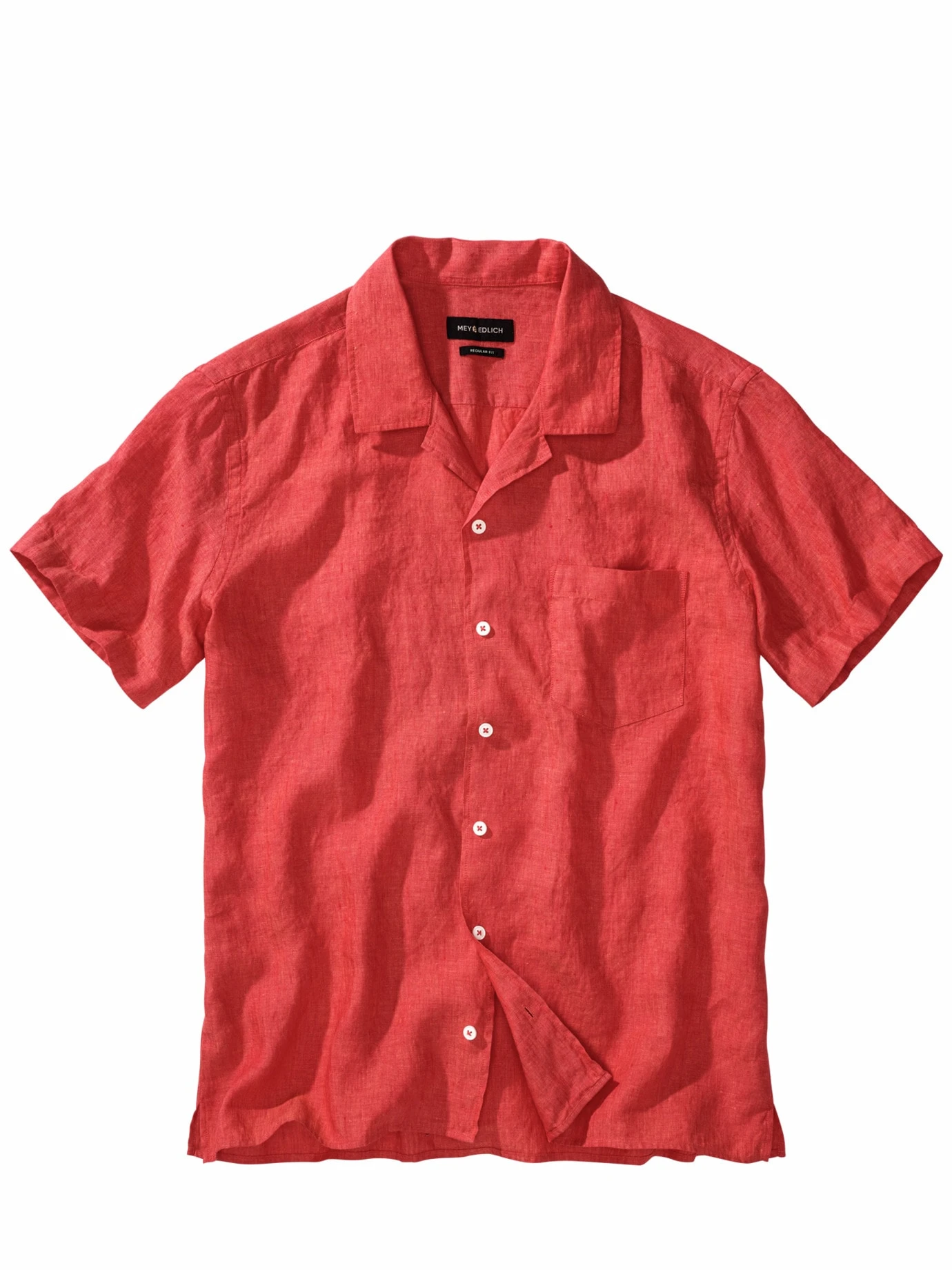 Ein Hauch von Hochsommer. Ein Hauch von Meeresbrise auf der Haut. Ein Hauch von edlem Knitter. Ein Hauch von Raffinesse beim Färbeverfahren – zwei Fäden werden in unterschiedlichen, farblich abgestuften Schritten gefärbt und dann miteinander verwoben. Gibt dem Hemd einen Edelschimmer mit einem Hauch von Zweifarbigkeit. Der gerade Schnitt und sein Reverskragen machen das Leinenhemd extra luftig, ideal bei hohen Temperaturen.