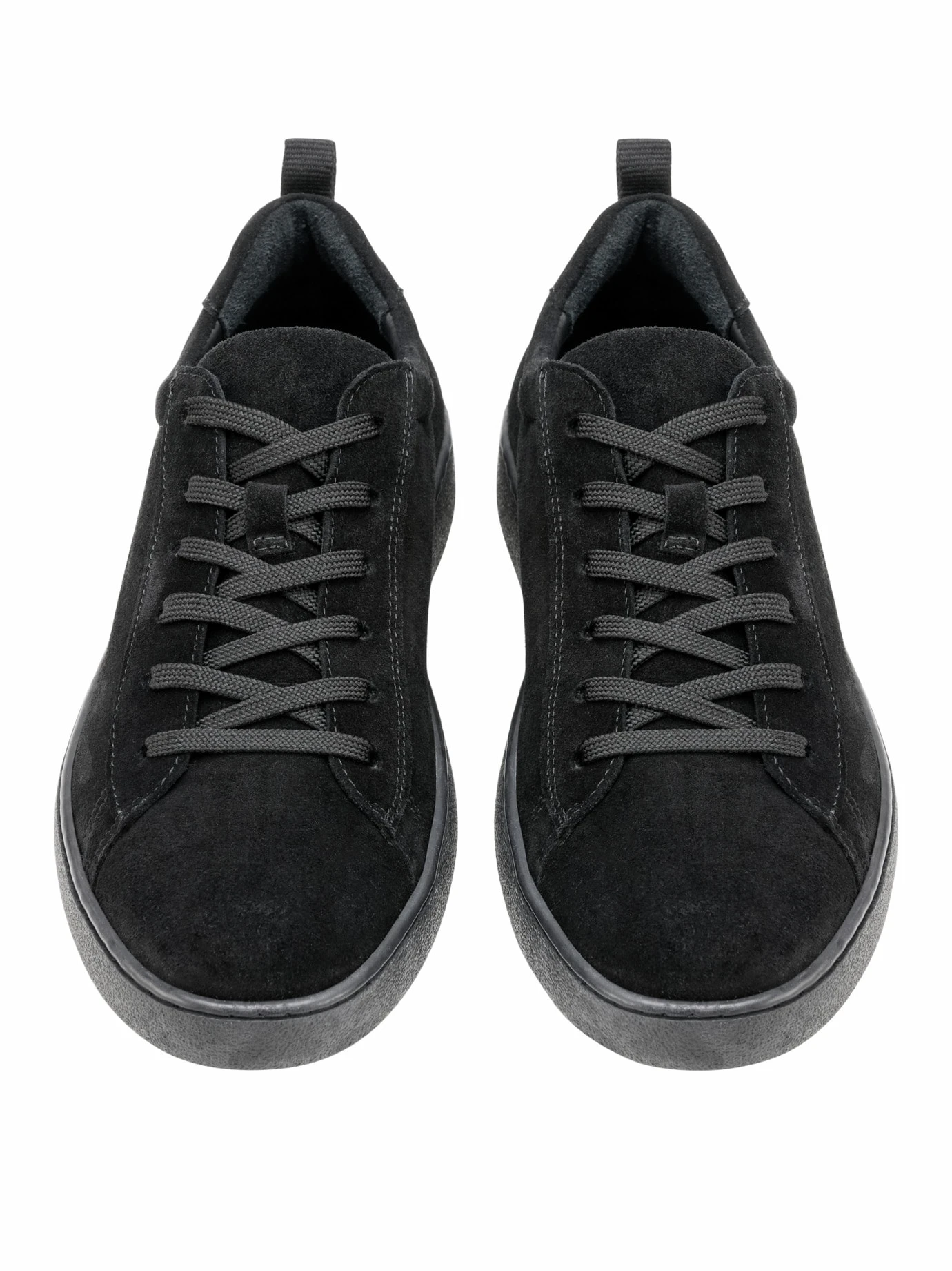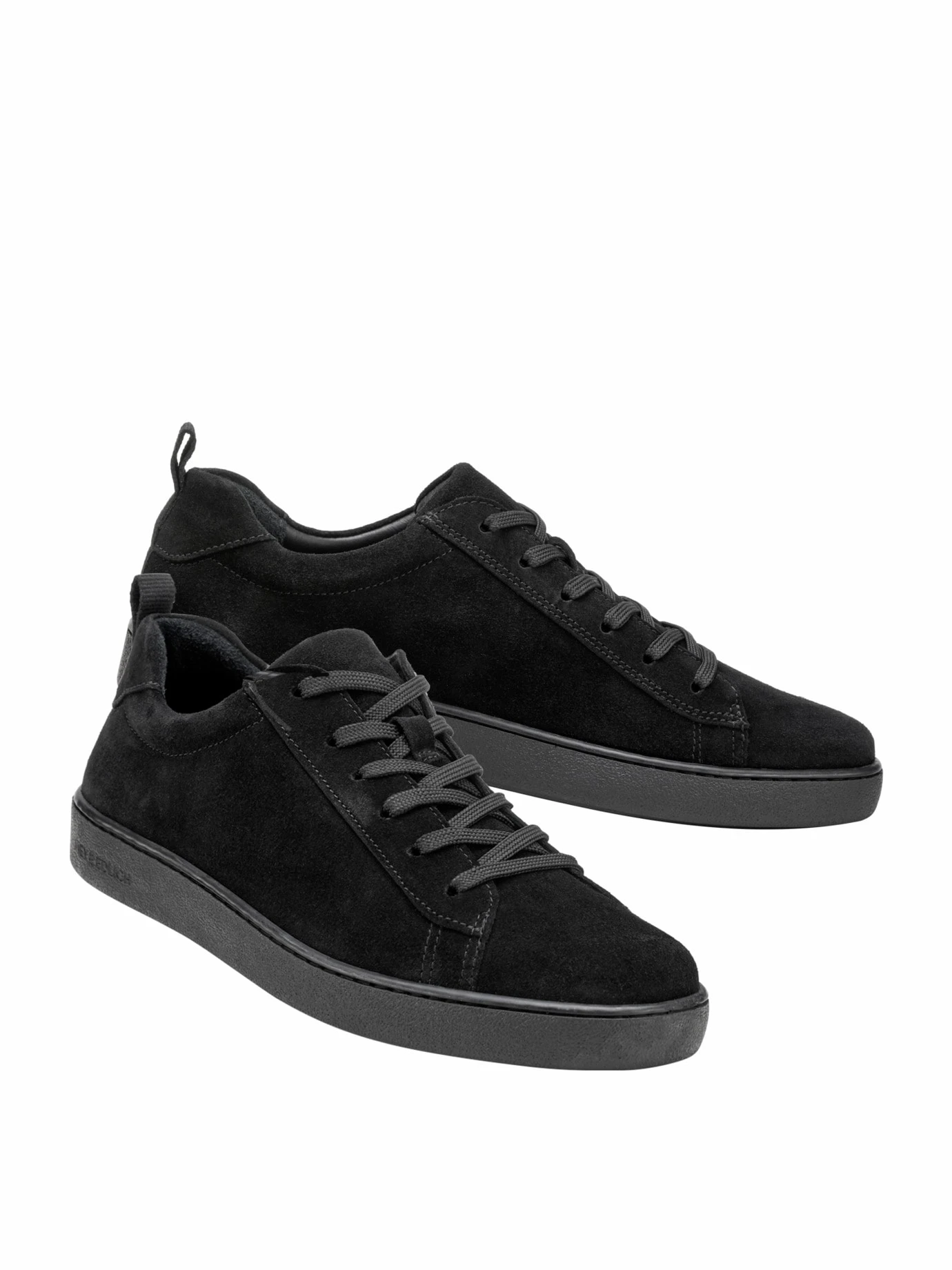 So wird er zum Klassiker. Zeitlos, erhaben und einer, der nahezu zu jedem Outfit passt – ein Sneaker, der durchweg schwarz ist, ist eine Rarität. Eben ganz schlicht, in Portugal gefertigt aus hochwertigem Rindvelours, das den Fuß spürbar atmen lässt (dazu trägt auch das Rindlederfutter bei) und sehr weich ist. Die lederne Decksohle können Sie bei Bedarf gegen eine eigene wechseln. Den schnellen Einstieg gewährt die Fersenlasche.