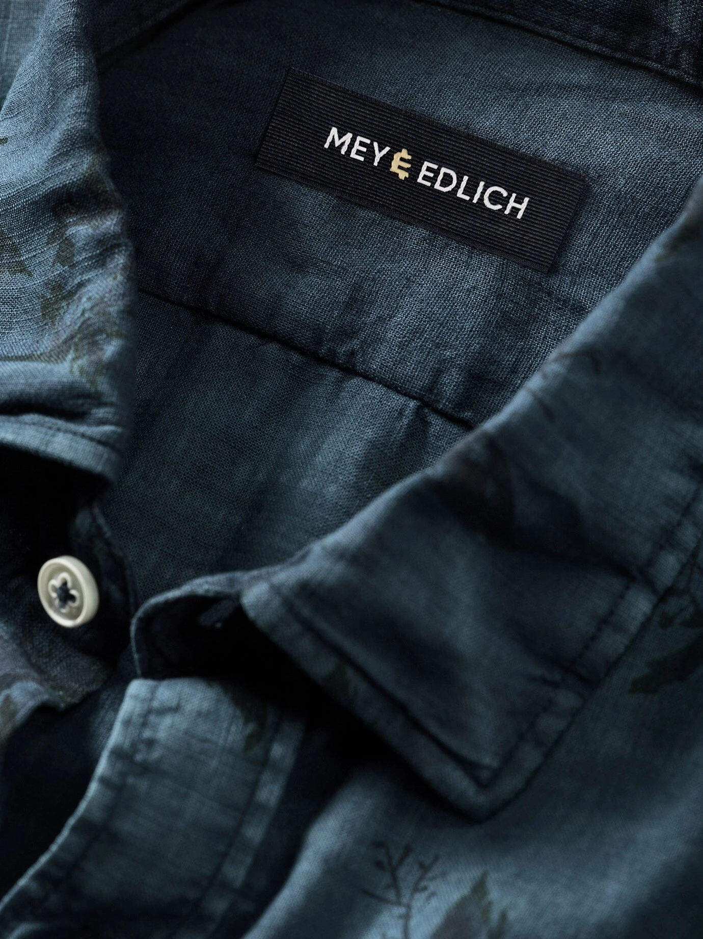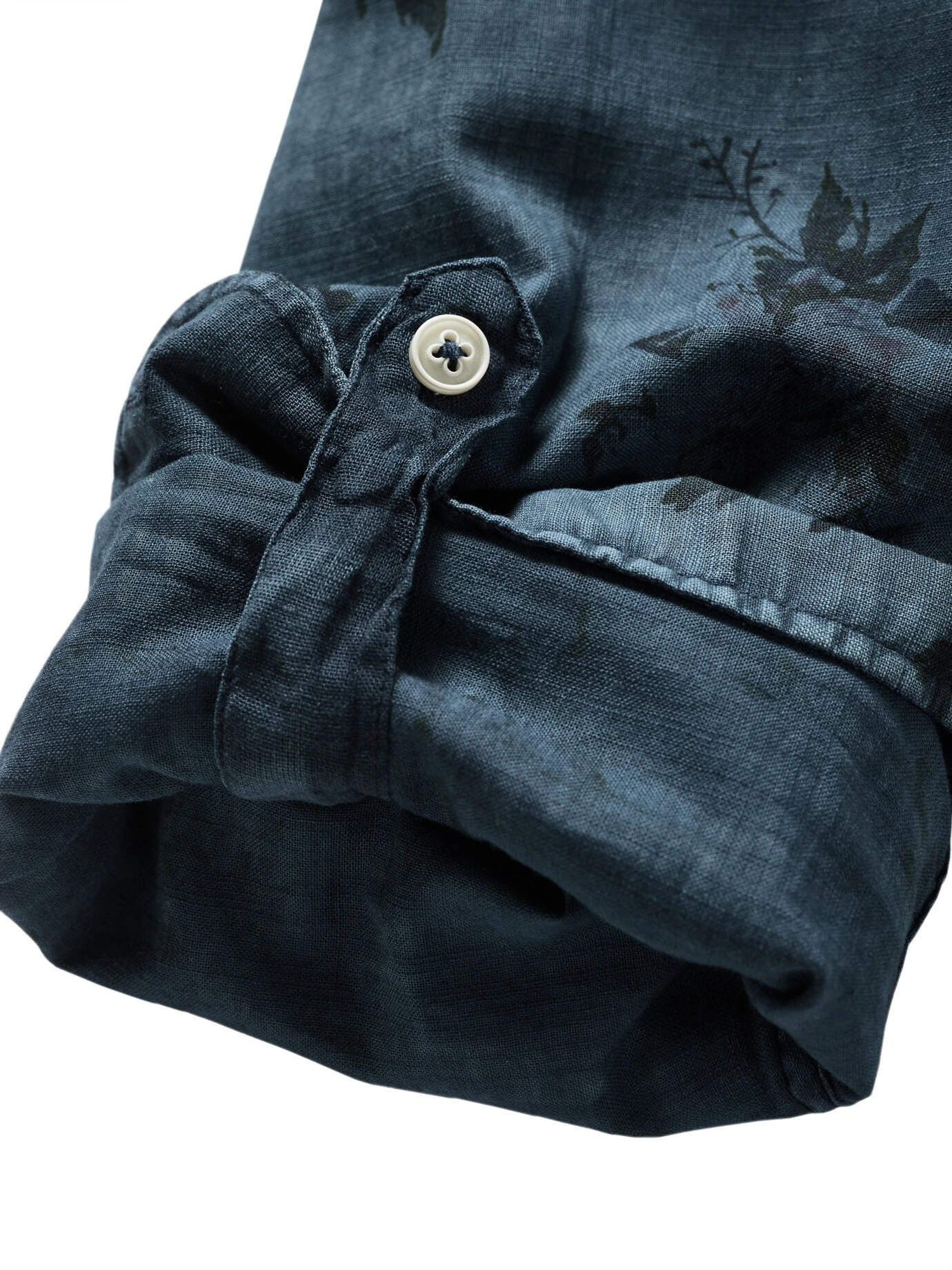 Cool wie ein Jeanshemd, nur nicht so brettig. Es wiegt mit 115 Gramm so viel wie ein T-Shirt und stellt seine Konkurrenz aus Denim in den Schatten. Gewebt aus Baumwoll-Flammgarn. Dessen unregelmäßige Struktur sorgt für Lässigkeit und dafür, dass das Hemd nie auf der Haut klebt (Stichwort: Luftzirkulation). Patina trägt es ab Tag 1, weil der Stoff erst bedruckt, dann gefärbt wird und so die Farbe unregelmäßig einzieht. Bitte über der Hose tragen, gern zu Jeans (die Blautöne sollten möglichst unterschiedlich sein).