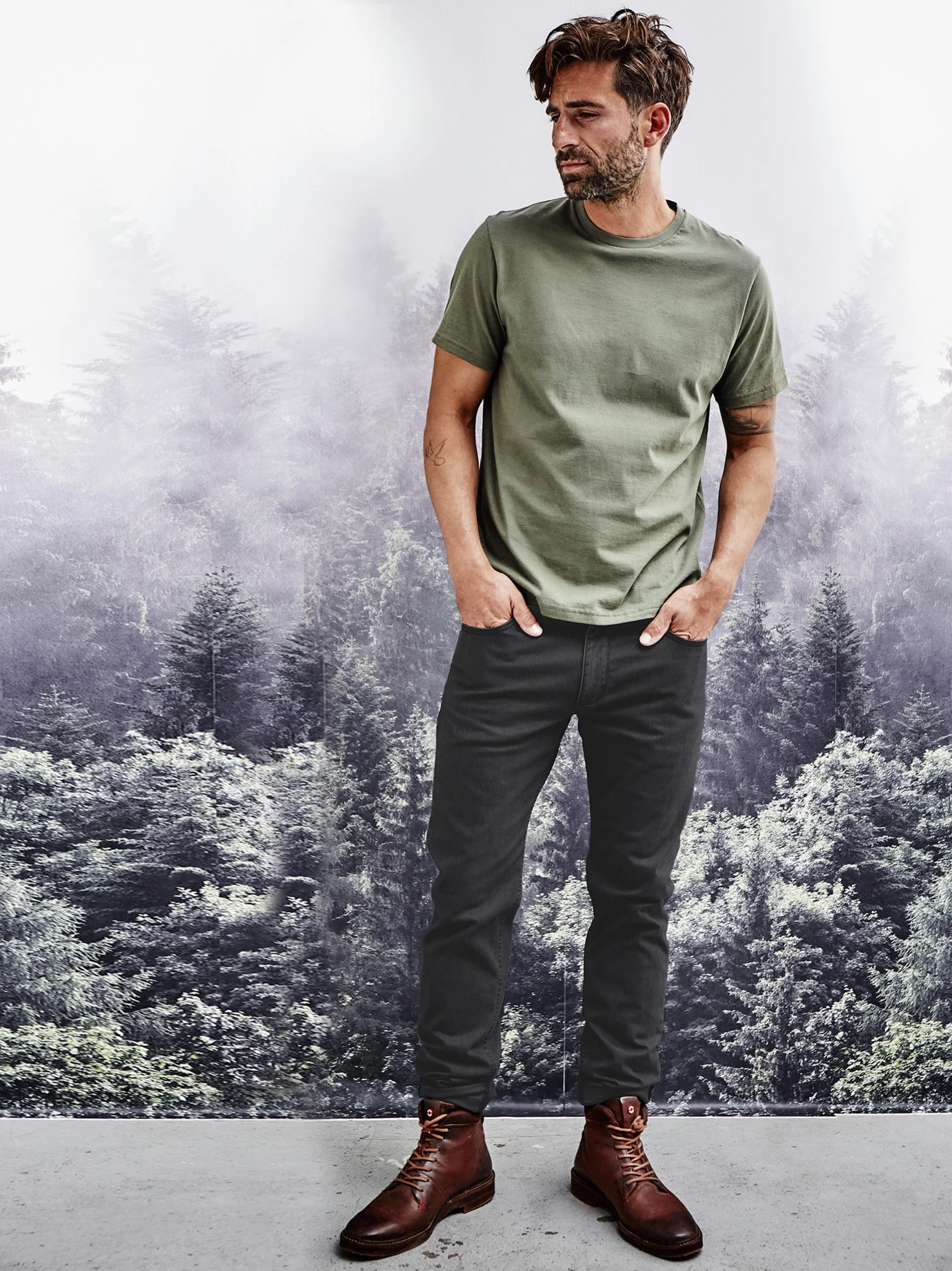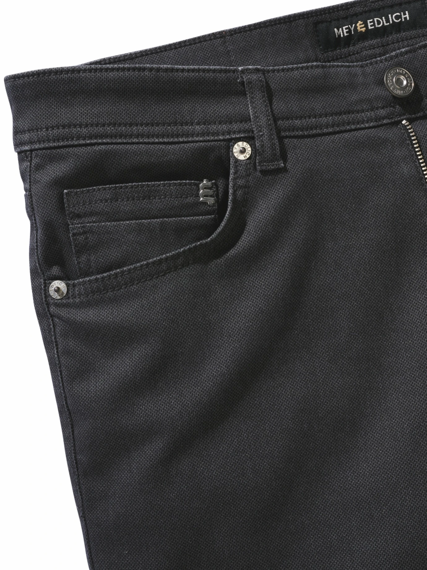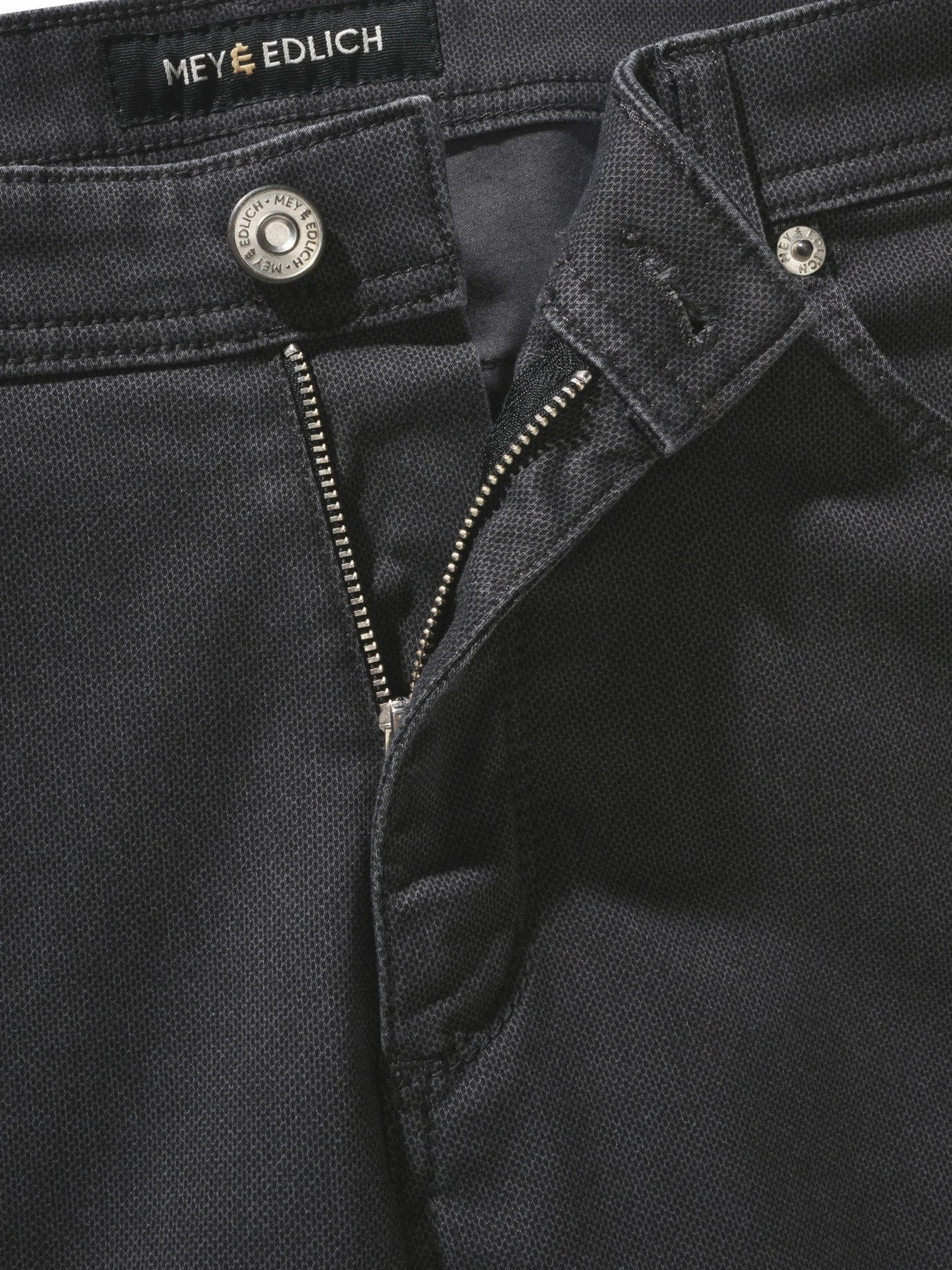 Undercover weicht diese Hose von der Riege grauer Hosen ab. Ihr Gesicht hat sie sich von der Five Pocket abgeschaut, Nieten trägt sie wie waschechte Jeans, für die neue Ebene wird sie zusätzlich pixelig bedruckt. Grundlage hierfür ist ein Baumwollstoff aus einer deutschen Weberei, der Erfahrung von langem Sitzen nachgehend mit stabilem Polyester und 3 % mehr Elastizität. Passt ausnahmslos zu jeder Farbe des Kleiderschranks, vom weißen Hemd bis zum Batikpullover.