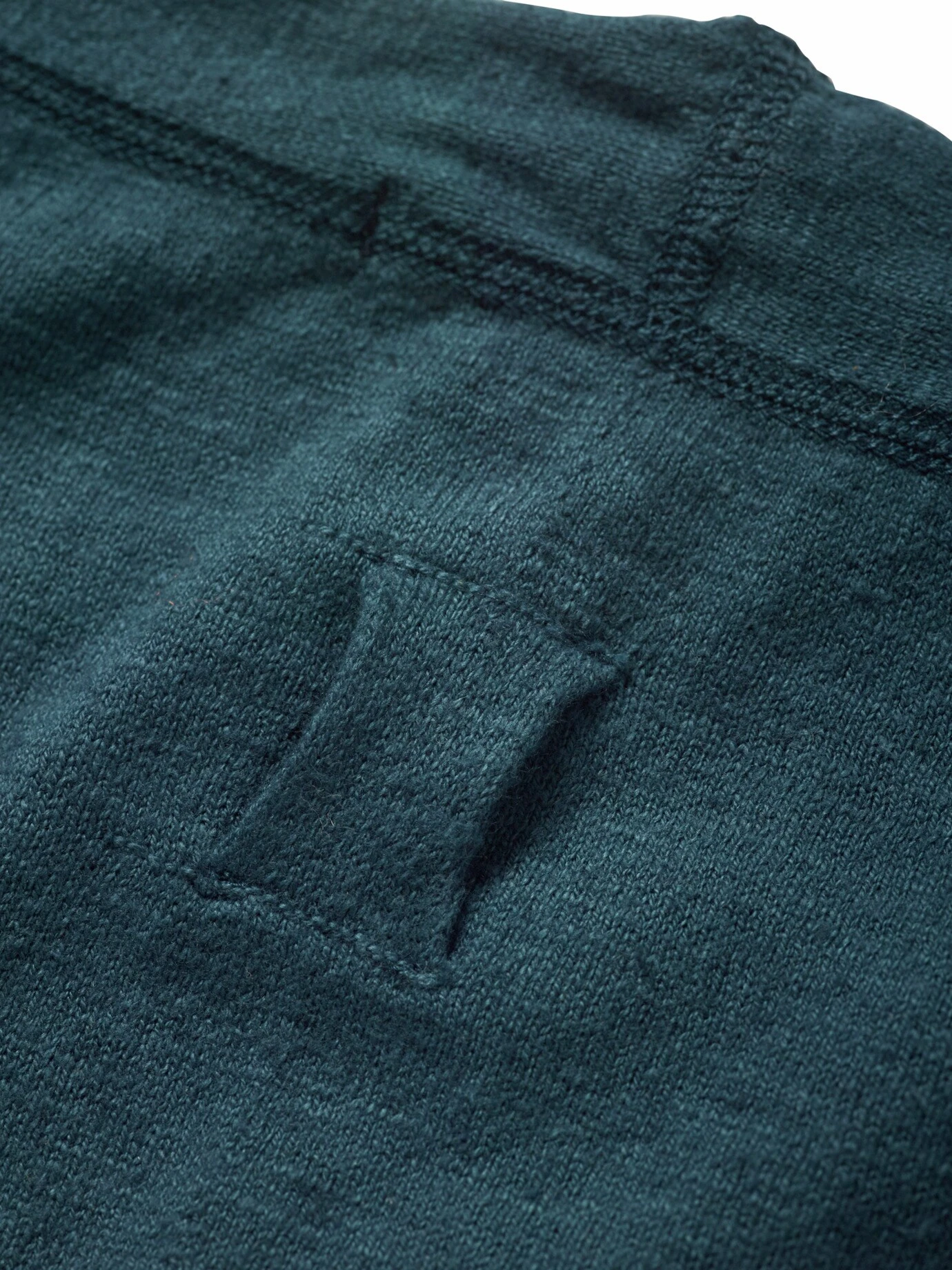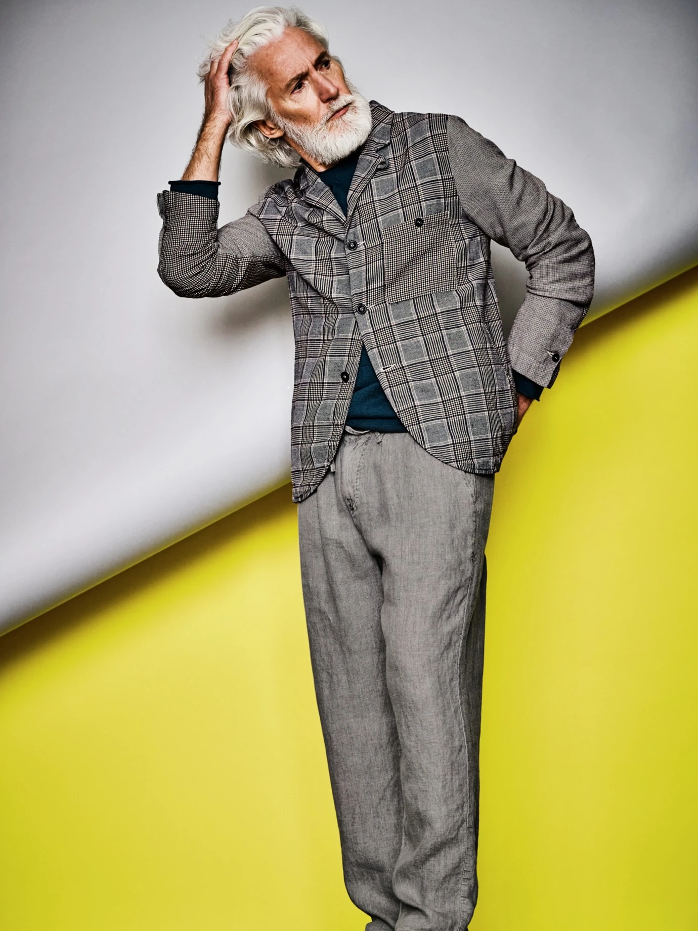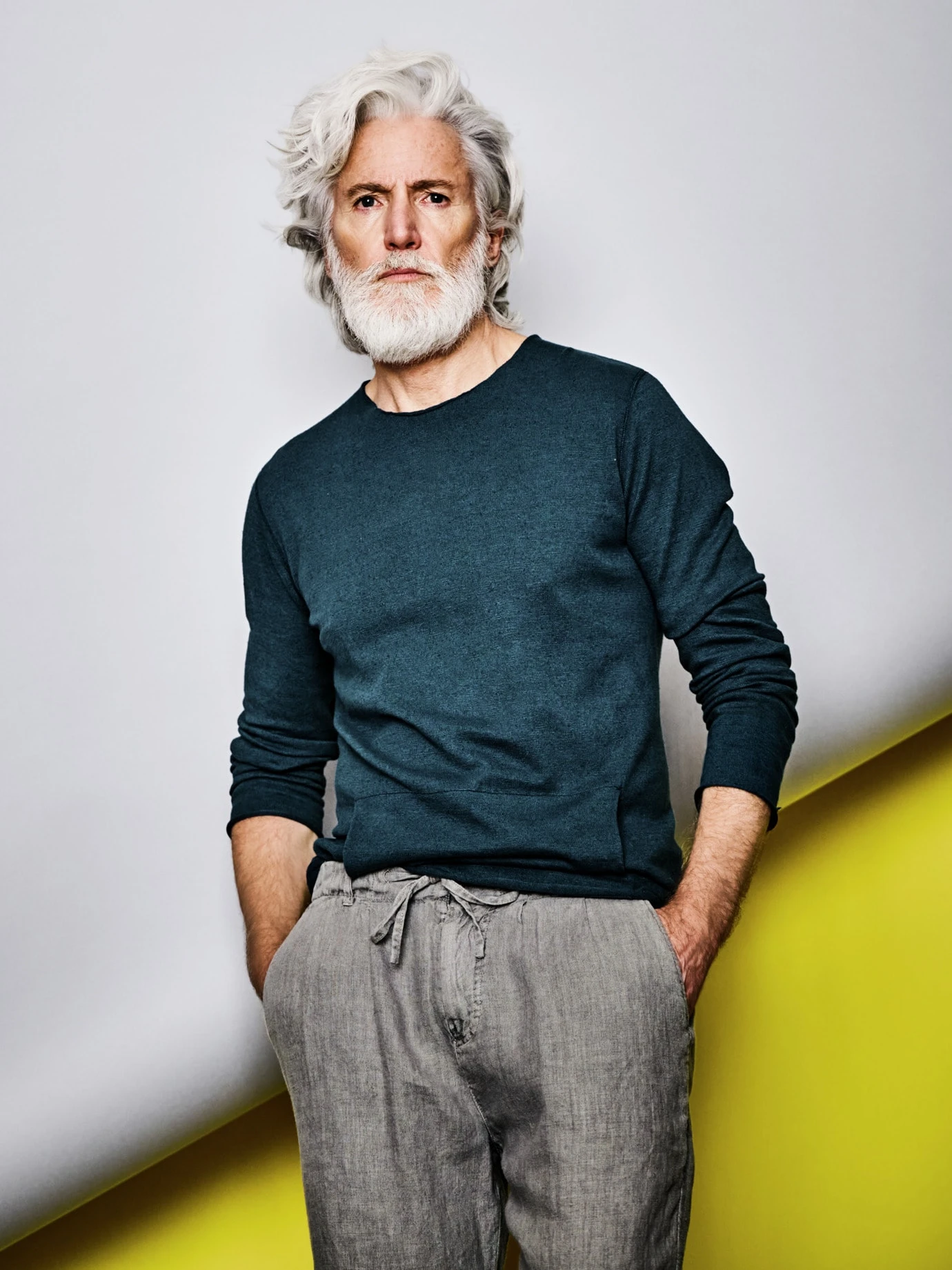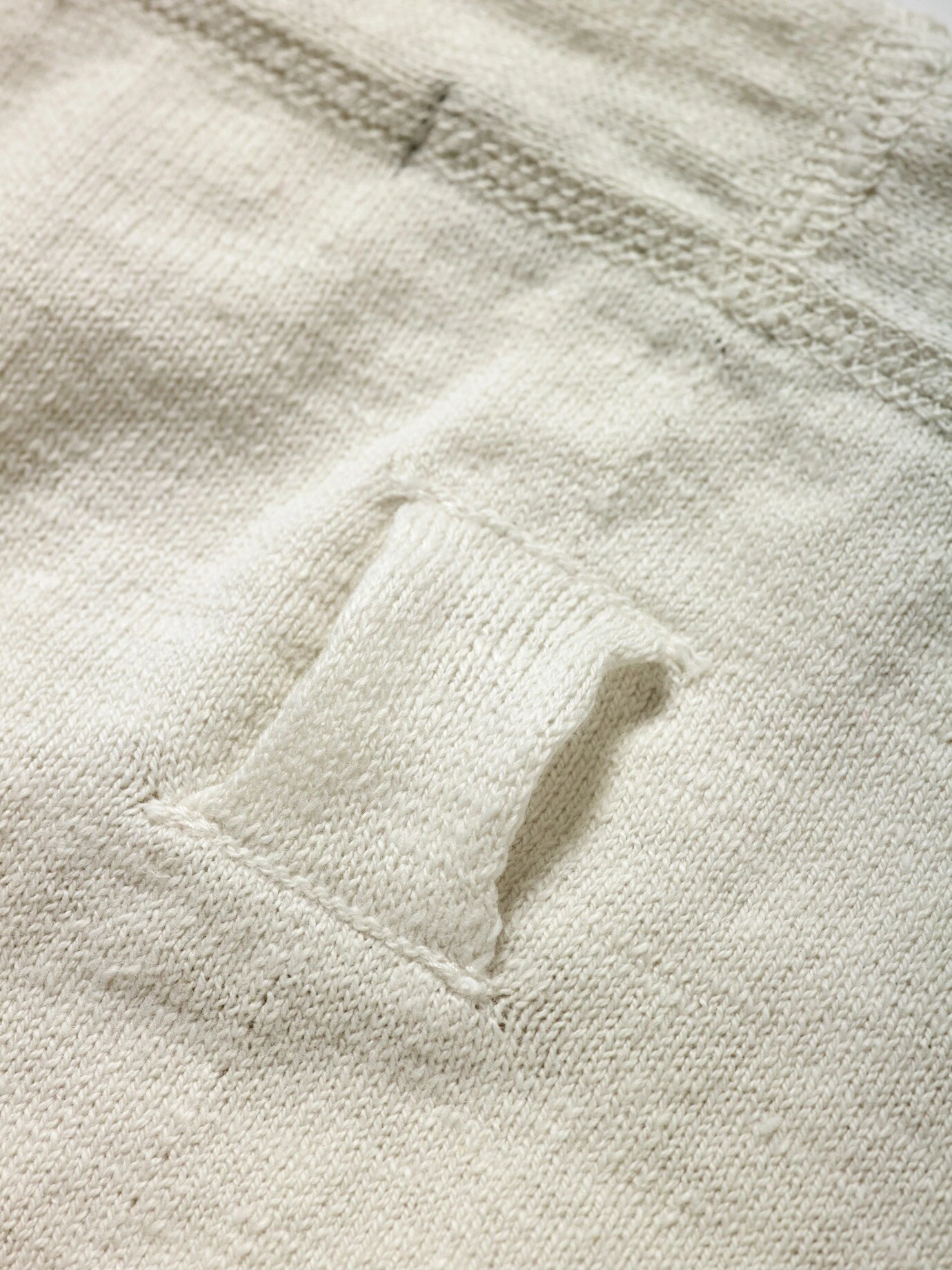 Schlicht und zum Reingreifen. hannes roether geht bei diesem Pullover aufs Äußerste: keine Seitennähte, dafür eingesetzte Ärmel samt schwungvoller Schulternaht, die optisch ein breites Kreuz formt. Keine Abschlüsse, dafür soft einrollende Kanten. Das Augenmerk liegt bei diesem Pullover auf der Körpermitte: Was sich wie ein leichter Strich vorne mittig abzeichnet, ist tatsächlich Strickkunst. Zusätzlich mit eingearbeiteter Kängurutasche, die exakt anliegt, nirgends absteht und zur Not auch Hände transportiert. Ein Pullover, der wirkt, ob zur Used-Jeans oder – wie hannes roether es wählt – zur schlank geschnittenen Leinenhose.